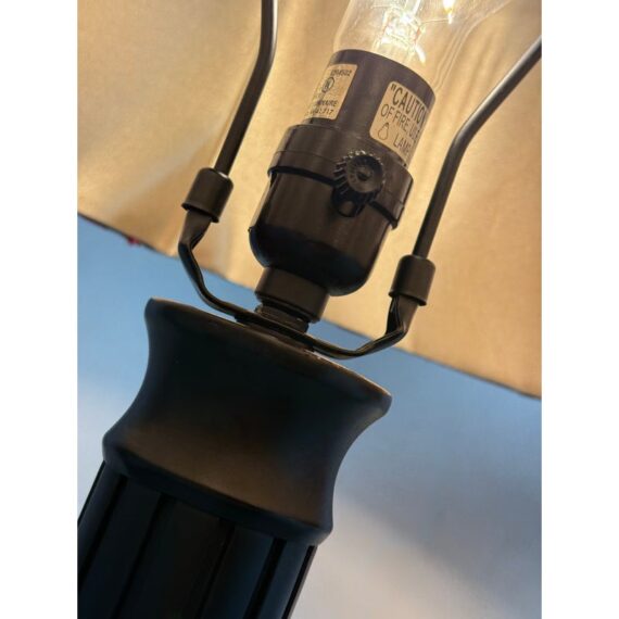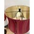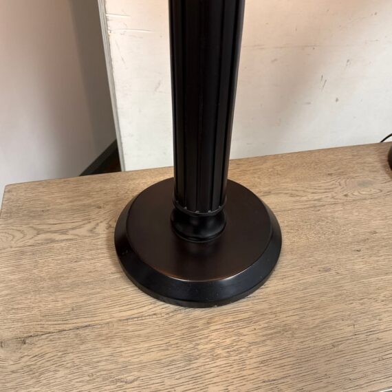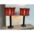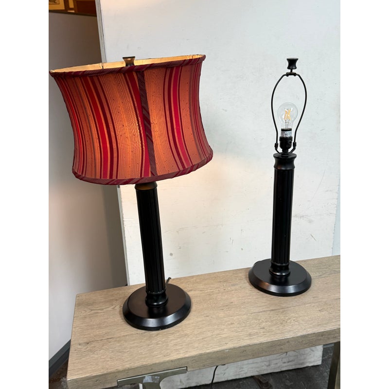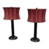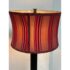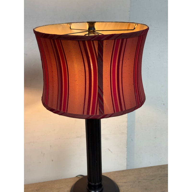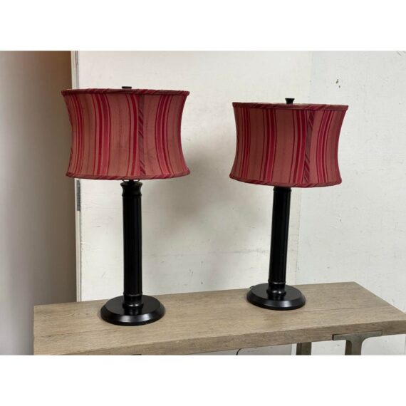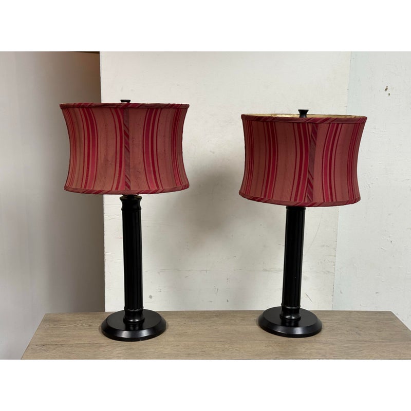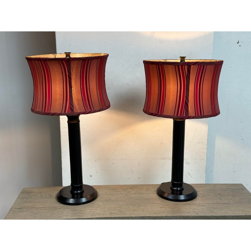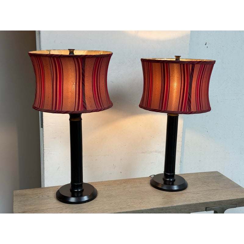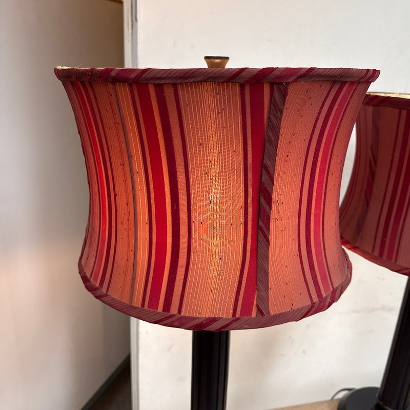 Design Plus Gallery presents a Pair of Striped Shade Table Lamps of Venetian Style. They are dramatic with their black stems of pillar design. They have two drum shades of silk stripes in dark red with purple going around their entire perimeter. The interior of the shades are luminous gold to further brighten your living space. They are in good condition minimal wear from their usage.