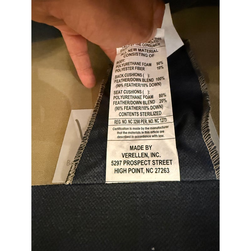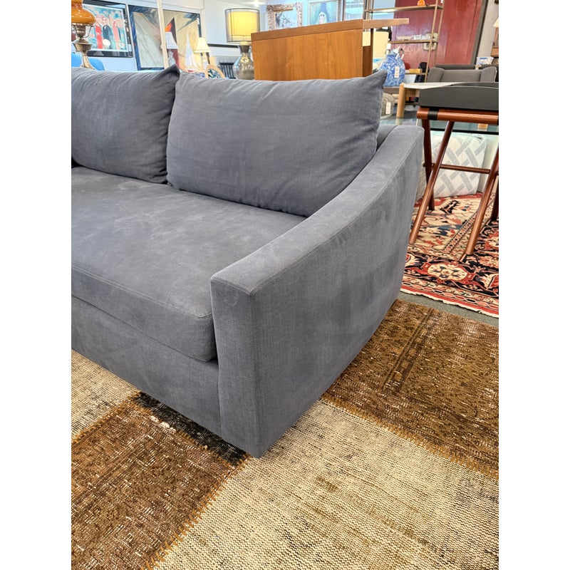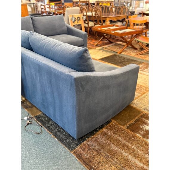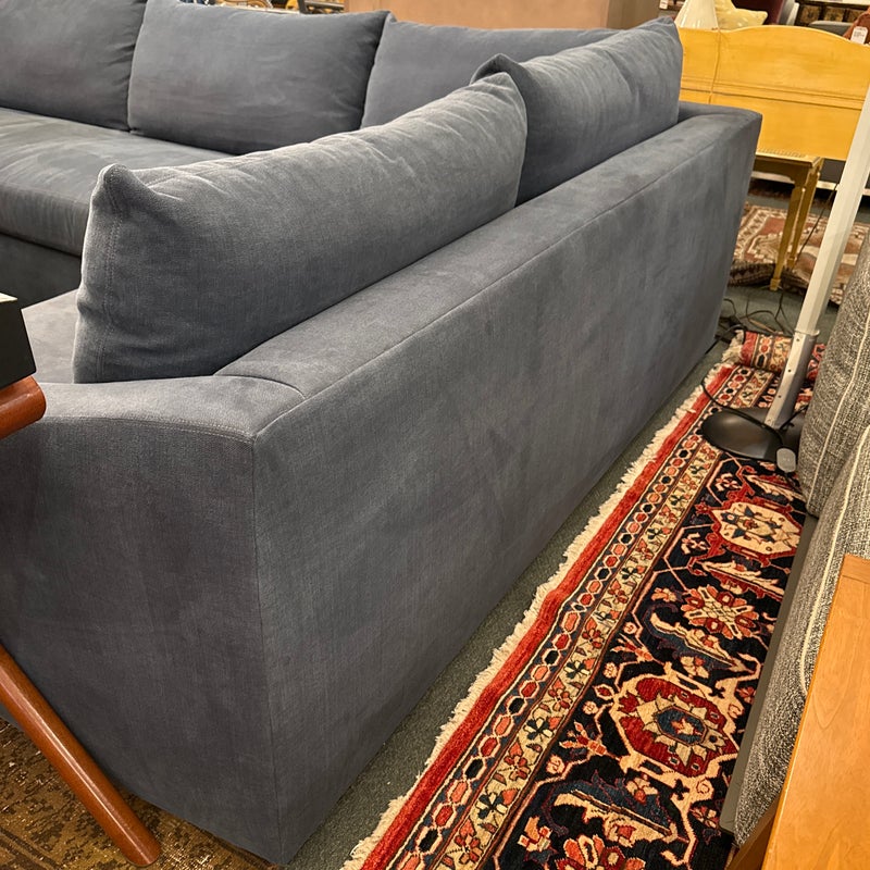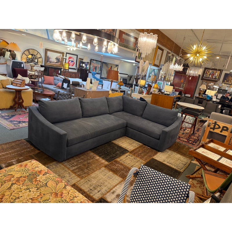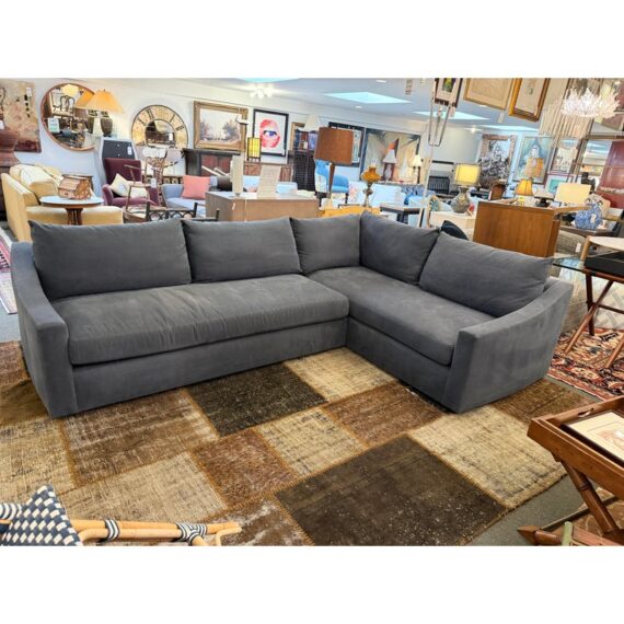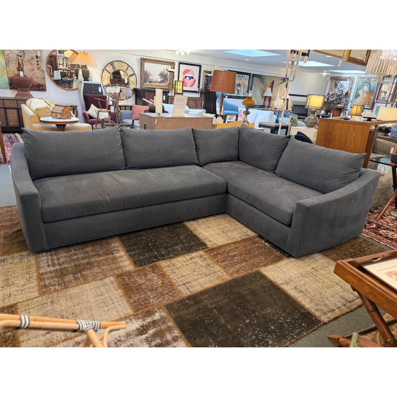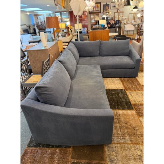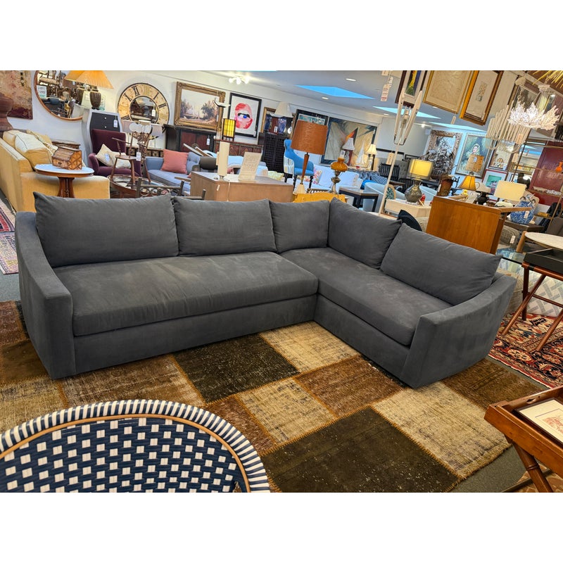 Design Plus Gallery presents a Duke Two Piece Sectional from Verellen. Recognized for its unparalleled comfort and timelessness, this elegant navy sectional sofa features two segments upholstered with a single bench seat each. It seamlessly blends luxurious aesthetics with everyday durability. The spring-down seat construction offers the perfect balance of plush sink-in softness and resilient support, while the loose, boxed seat cushions and back pillows adapt to your ideal lounging position. Meticulous double-needle body stitch adds a tailored finish. The standout sectional anchors the room with effortless sophistication and lasting comfort. In good condition, it shows minimal visible wear. Made in USA.
