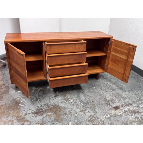 Design Plus Gallery presents the Anders Sideboard for Dining Room by Vermont Furniture Design from Room & Board. The cabinet anchors your dining area with its robust nature and perfect place for storing linens and dishes for convenient decorating. There are two cabinet doors that swing open at either side with a single interior shelf. The center of the sideboard has four equal size drawers. This style has been discontinued by the brand. Overall the sideboard is in good condition for its usage with minimal visible wear.
