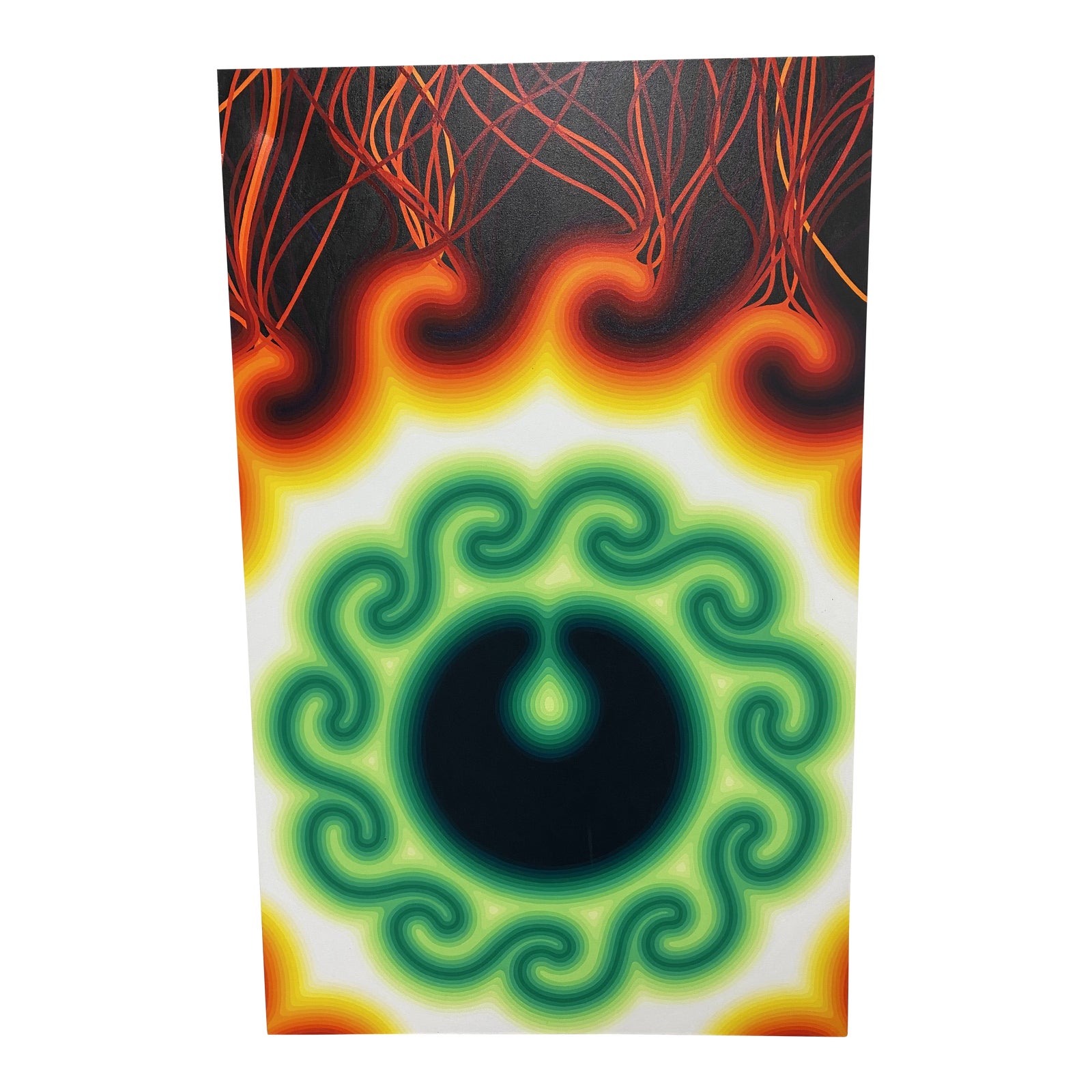 Design Plus Gallery presents an Art Piece by Artist Vibrata Chromodoris. A thick in-depth stretched canvas. Illusions of the bright colors of reds, yellows and white over a black background. A striking green wave circle attracts the eyes of the art piece. Ready to be the striking point of your space. Minor wear. No signature nor title.