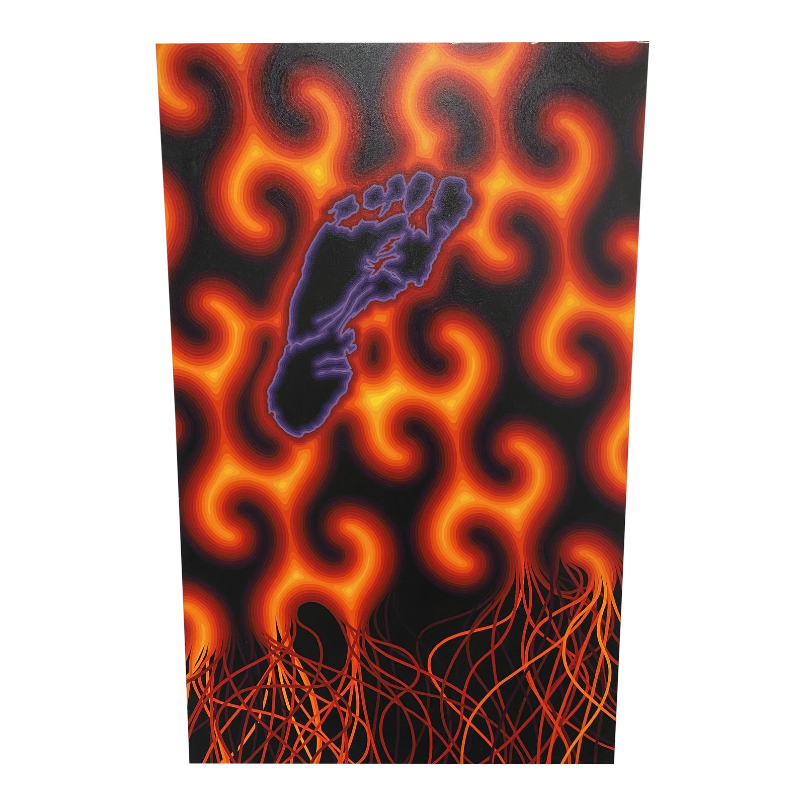 Design Plus Gallery presents an Art Piece by Artist Vibrata Chromodoris. A thick in-depth stretched canvas. Illusions of the bright colors of reds, oranges, and yellows over a black background. A striking purple foot print attracts the eyes of the art piece. Ready to be the striking point of your space. Minor wear. No signature nor title.