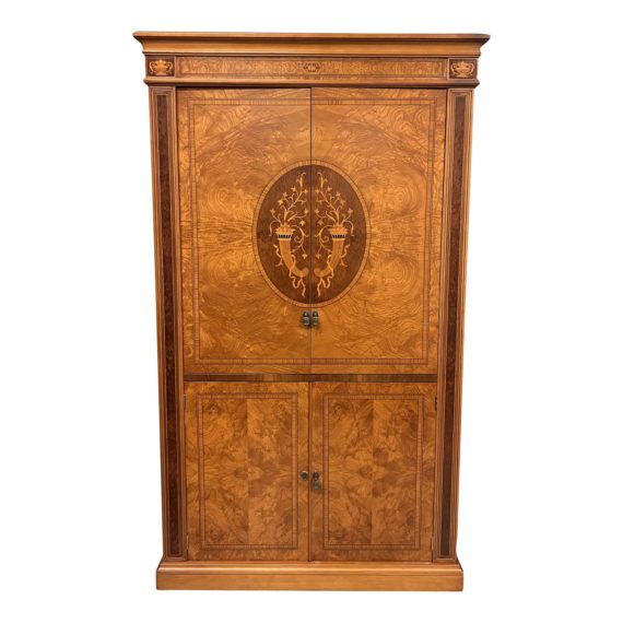 Design Plus Gallery presents the Vicente Zaragoza 179591 Viena Tv Wardrobe. This Viena wardrobe was constructed with maplewood and palms of olive wood. It was then hand painted to perfection. Features include five square drawers, three square and four rectangular shelves, a wood tray that extends outward. Slits are included in the wardrobe’s back to allow heat from media equipment to escape. Visible and minor wear from use; wardrobe is in good condition. Crafted in Spain.