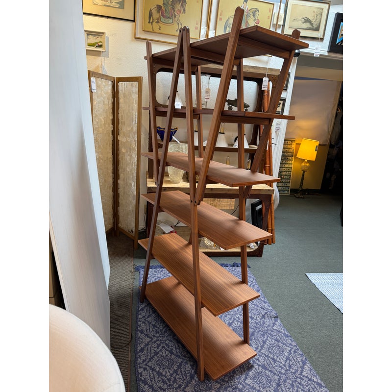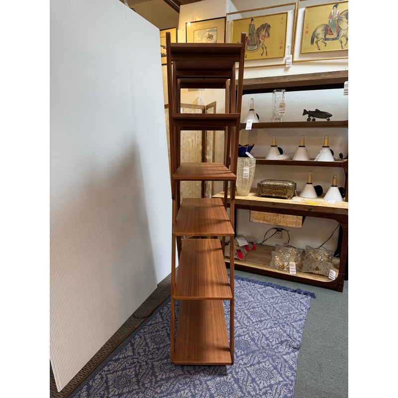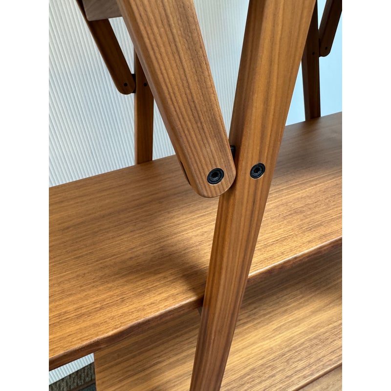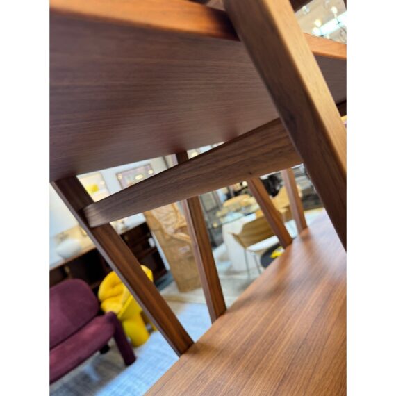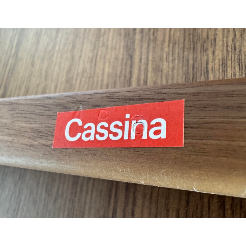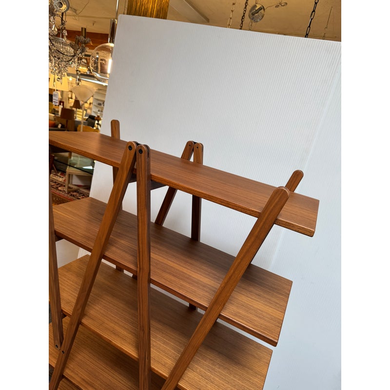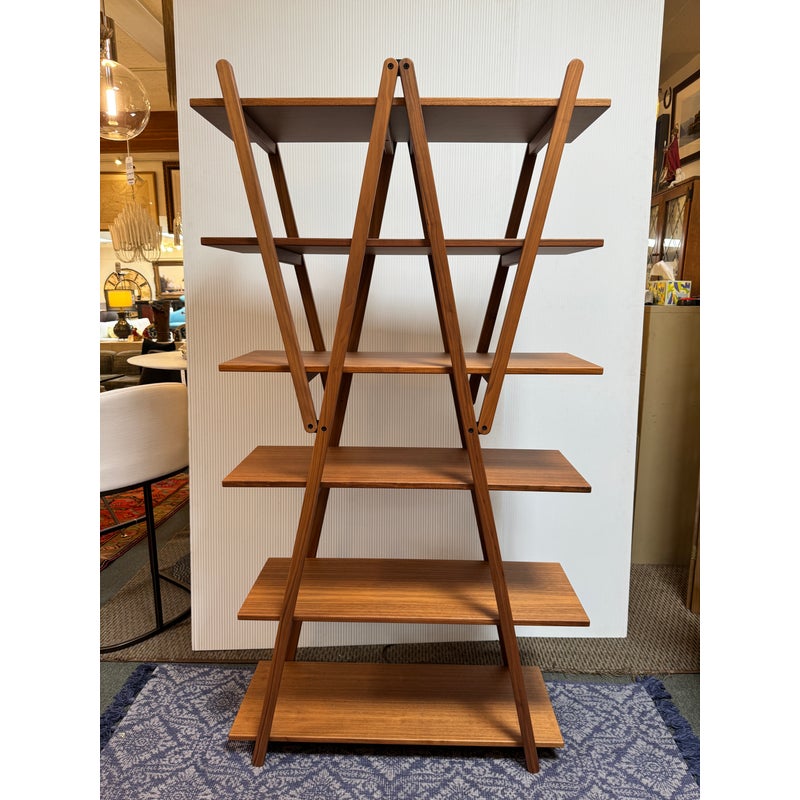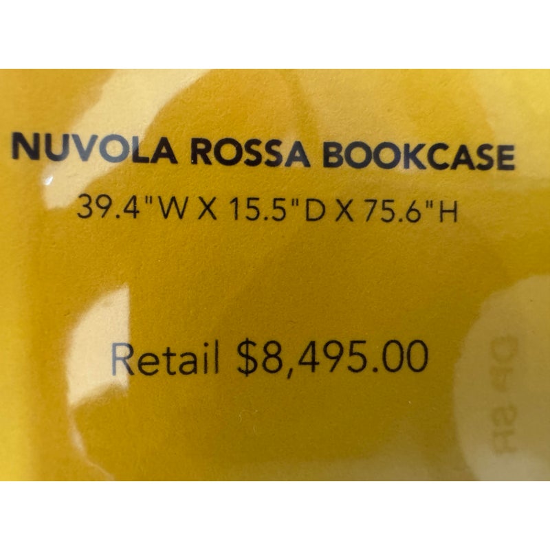 Design Plus Gallery presents a Nuvola Rossa Bookcase from Cassina. Designed by Vico Magistretti in 1977. Crafted in solid American walnut, its elegant, simple, clean-cut lines stem from a radical rethink of the classic bookcase with side supports. Here, the diagonal bracing struts become the very structure, they lock the composition in place and cradle the shelves, eliminating bulky sides and creating a light, architectural silhouette. The precision of its visible hinges and the rhythm of its six well-proportioned shelves focus attention on construction as much as on form. Warm walnut grain softens the geometry, while the open, cross-braced design ensures stability with a striking interplay of shapes. Was a Showroom Sample, in good condition, minimal wear. Made in Italy.