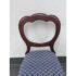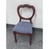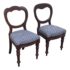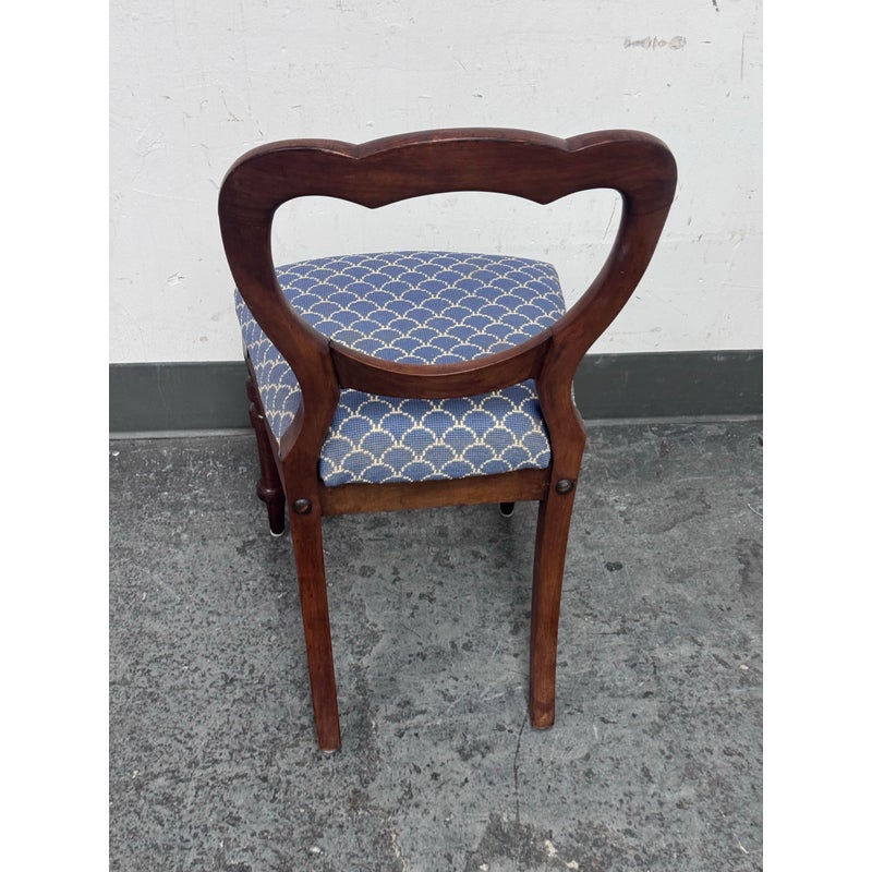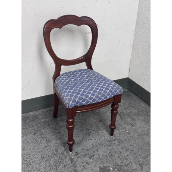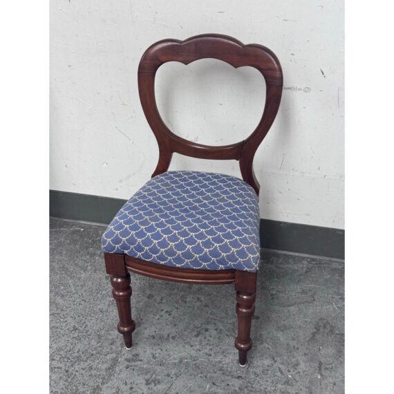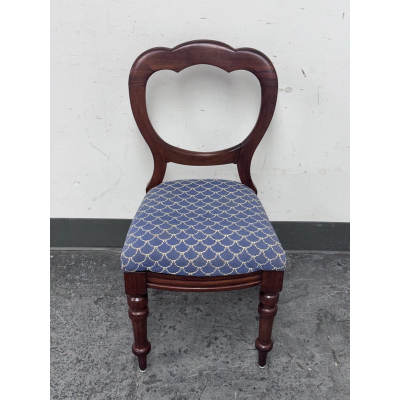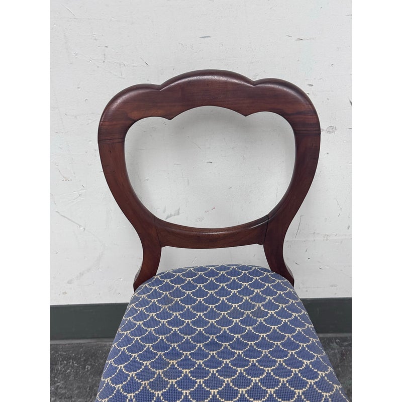 Design Plus Gallery presents a Pair of Blue Scallop Print Chairs with a Mahogany Frame from the Victorian Era + Style. The two chairs are close to identical in regards to their wood grain, choose of material and turned legs. They are only acutely differing with their seat backs having different shape backs. The seat cushions are nicely tailored and a new additional to these chairs as they have been reupholstered. They have a repeating scallop print in a medium blue with white embroidery. Both are in good condition with minimal wear for their usage.