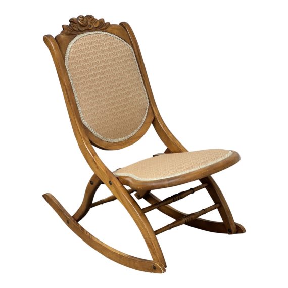 Design Plus Gallery presents a unique Victorian Collapsible Folding Side Rocking Chair. This elegant piece is crafted from solid woods and features a collapsible design, allowing it to be easily stored or transported. The chair is upholstered in an Art Deco Winged style print and features a neutral color palette that will blend seamlessly into any home. The rocking mechanism adds a touch of sophistication, making this chair a great choice for any Victorian-style or rustic living space. Carved floral on the headrest. Minor wear from usage + age.