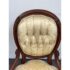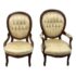 Design Plus Gallery presents a Set of Two Eastlake His & Her Chairs from the Victorian Era, Early 20th Century. The chairs have similar styles are are meant for the man and woman of the home. They have solid mahogany wood frame with a gold brocade satin upholstery that is a recent, and tasteful addition. They are both in good condition with visible wear that is consistent with vintage usage.