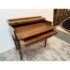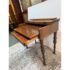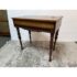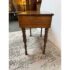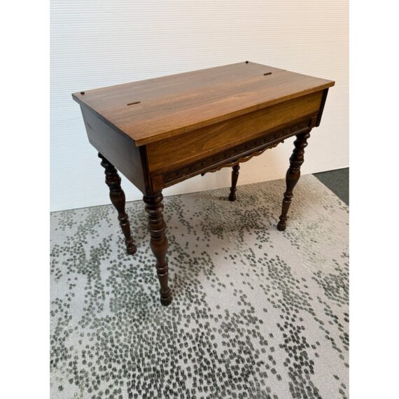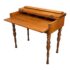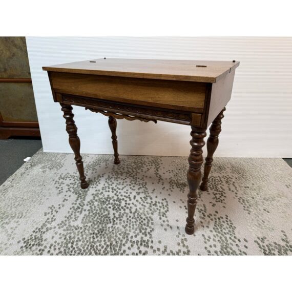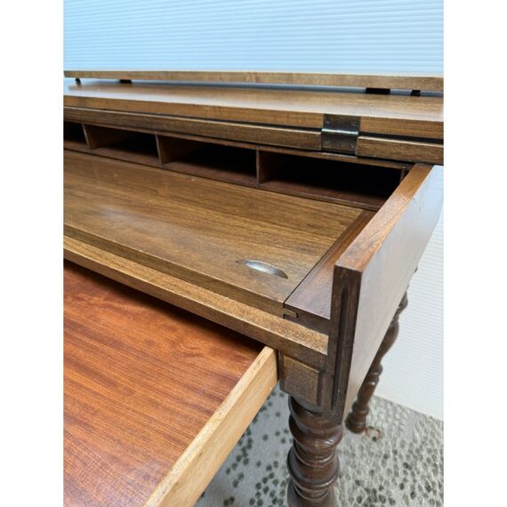 Design Plus Gallery presents a Spinet Desk from the Victorian Era. This spinet desk is compact, early-20th-century writing desk (popularized 1920s–1940s) designed to resemble a small spinet piano or harpsichord. It has a flip-top lid that opens to reveal internal storage compartments and a writing surface. Known for its versatility, it features turned legs, mahogany wood, and a “hidden” design that looks like a console table when closed. There is sun exposure present to the wood stain and visible small surface wear but overall is in good condition.