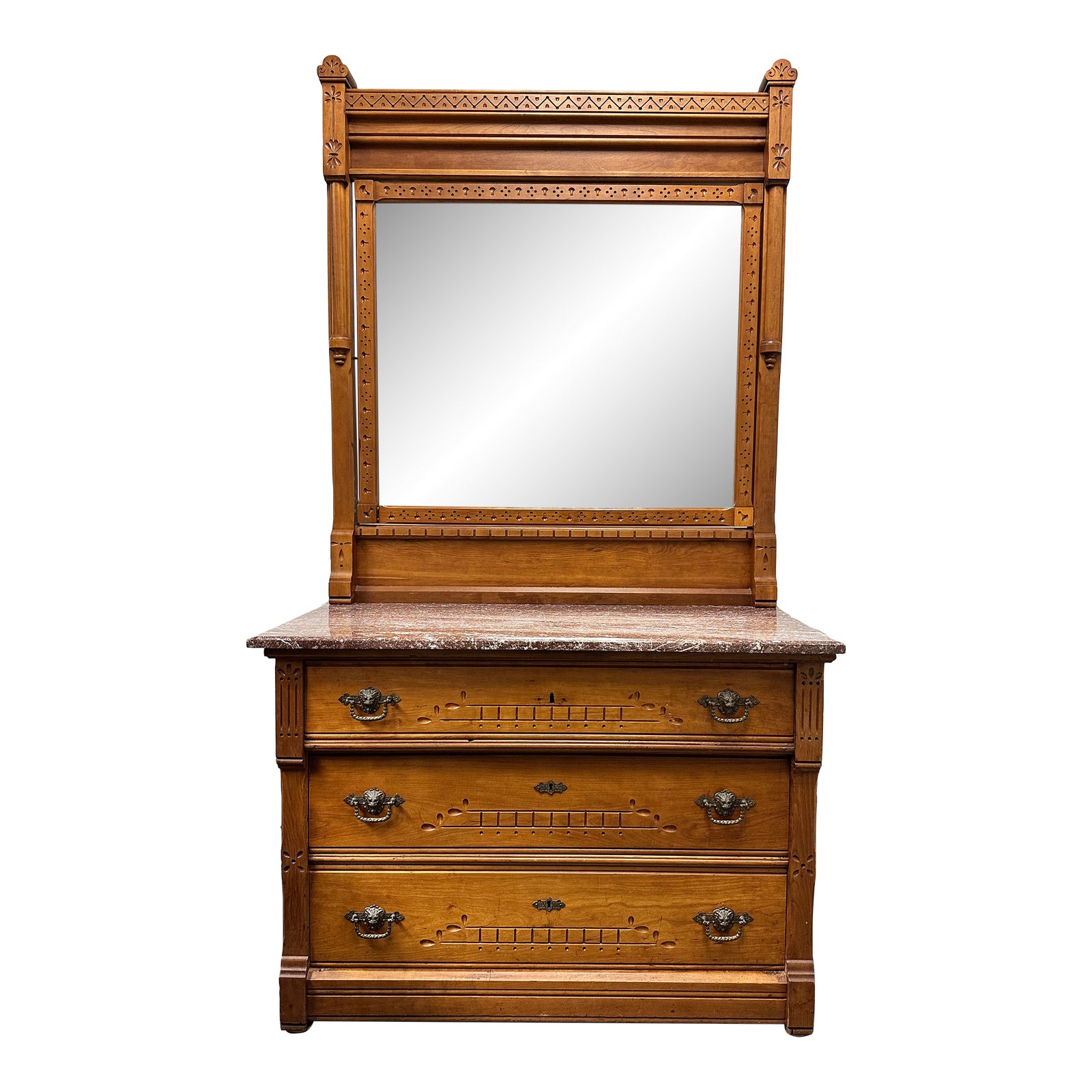 Design Plus Gallery presents a Set of Dresser with Mirror Marble Topped Walnut Victorian Eastlake Style. The Victorian marble top walnut dresser with mirror is a beautiful piece of furniture that dates back to around 1885 in America. It features a Charles Eastlake design, which was popular during the Victorian era. The dresser is made of walnut wood, which was commonly used during this time for its durability. Rose marble slab adds a touch of elegance and sophistication. The marble is rectangular in shape, matching the overall design of the dresser, and provides a smooth and luxurious surface for placing items. There is an attached mirror, which adds both functionality and style to the piece. The mirror is rectangular and framed with the same walnut wood, complementing the rest of the dresser. In good condition with wear that is consistent with antique age + use.