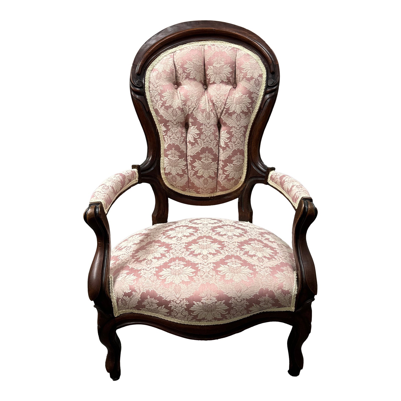 Design Plus Gallery presents a Petal Pink Upholstered Arm Chair of the Victorian Era. The chair has a solid frame and it stands on cabriole legs. There is a deeply buttoned back and a broad near oval frame with button tufting. This chair is upholstered with a petal pink sateen with cream floral pattern. The original casters have been removed + has been freshly reupholstered. Is in good condition for its vintage to antique age + use.