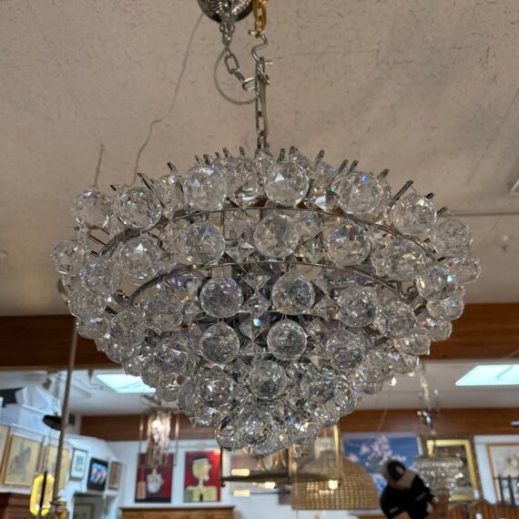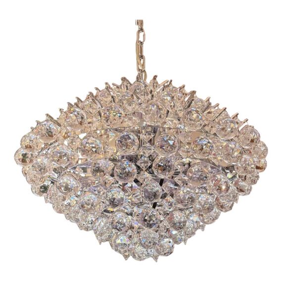 Design Plus Gallery presents the Essa Wide Chrome + Crystal Pendant from Vienna Full Spectrum. The light fixture has an offering of cascading crystals in round + diamond shapes. The inner frame comes in a sophisticated chrome finish for all the extra glamour you wish to exude. In good condition, visible and minimal wear from usage.