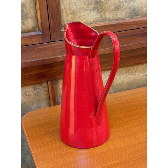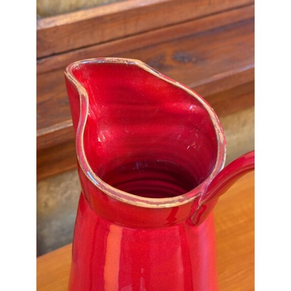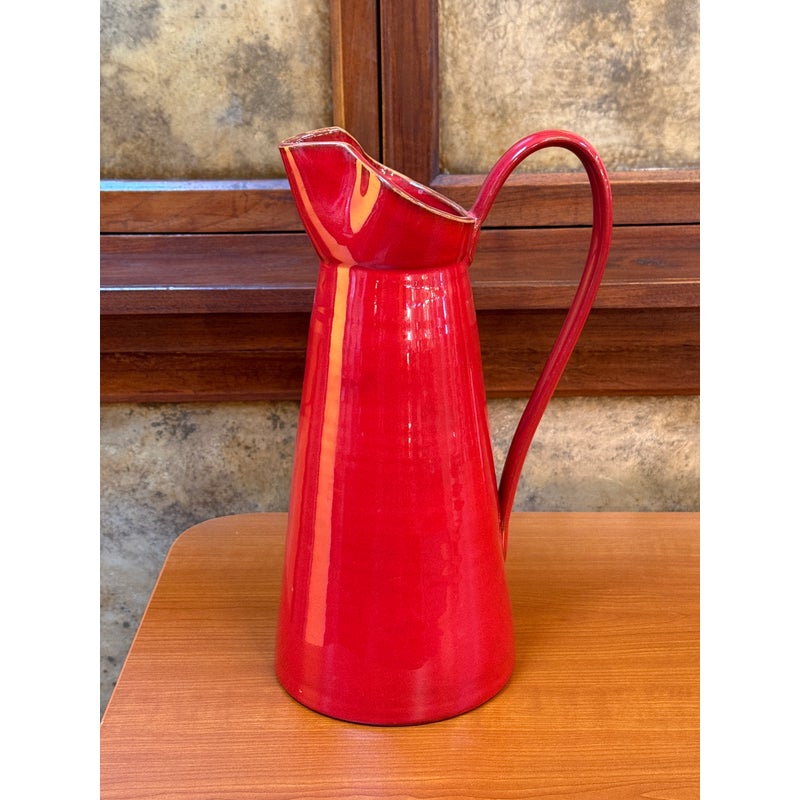 Design Plus Gallery presents a Rosso Vecchio Pitcher from VIETRI. Get this beautiful Vietri pitcher for whatever you need to pour! It has a very deep red that is hard to produce with a subtle crackle finish that is quite elegant. It is known to hold up to 96 ounces of fluids making it an ideal companion when hosting loved ones. It is in good overall condition. Made in Italy.