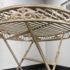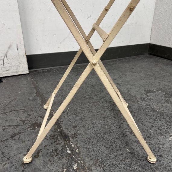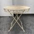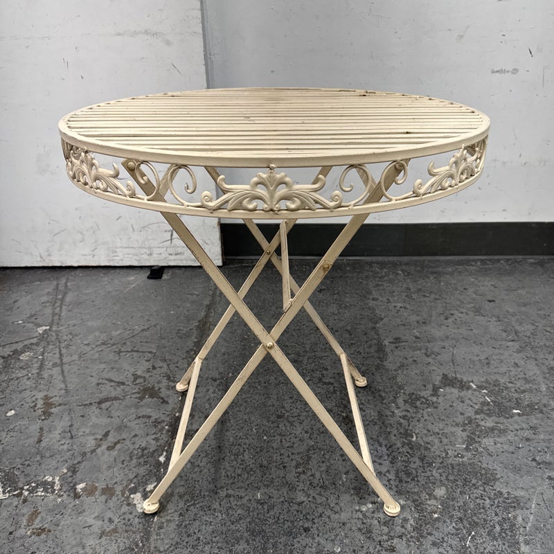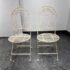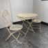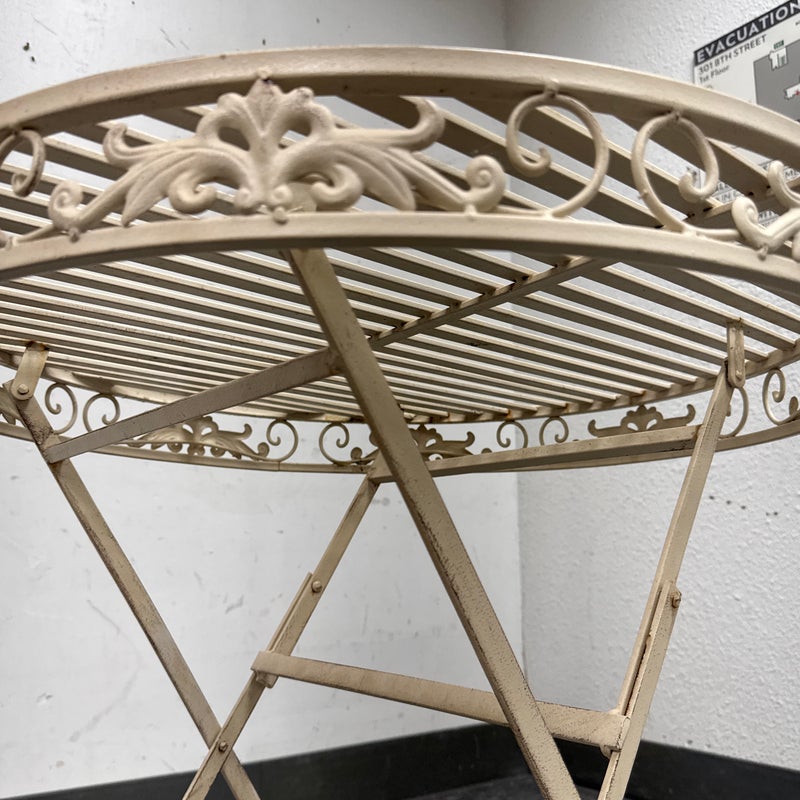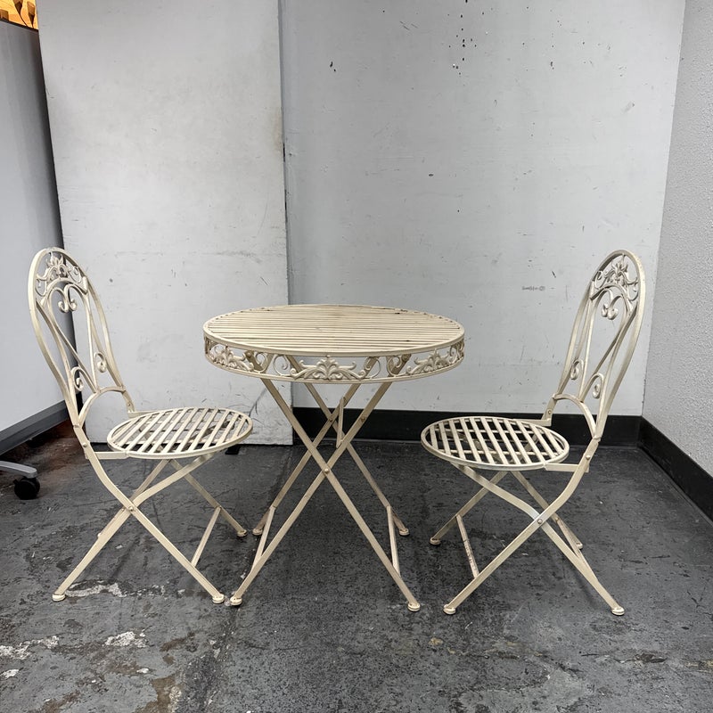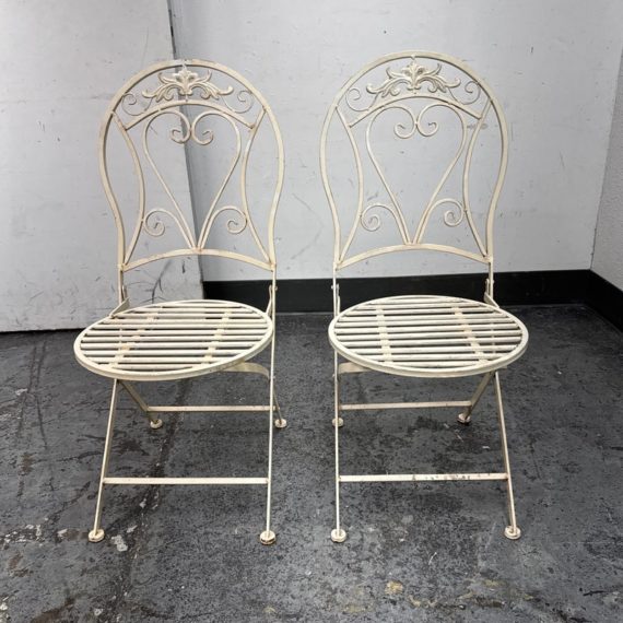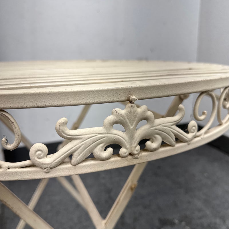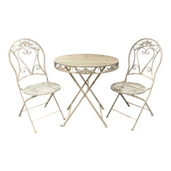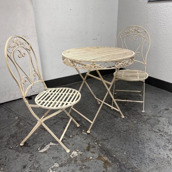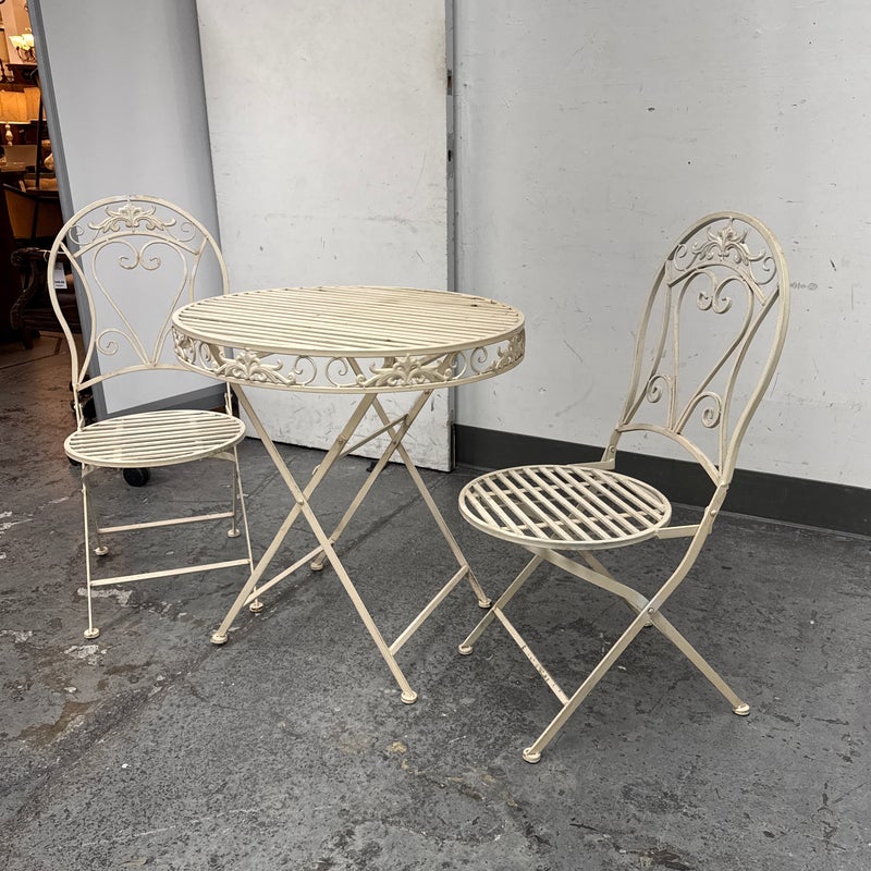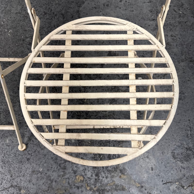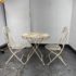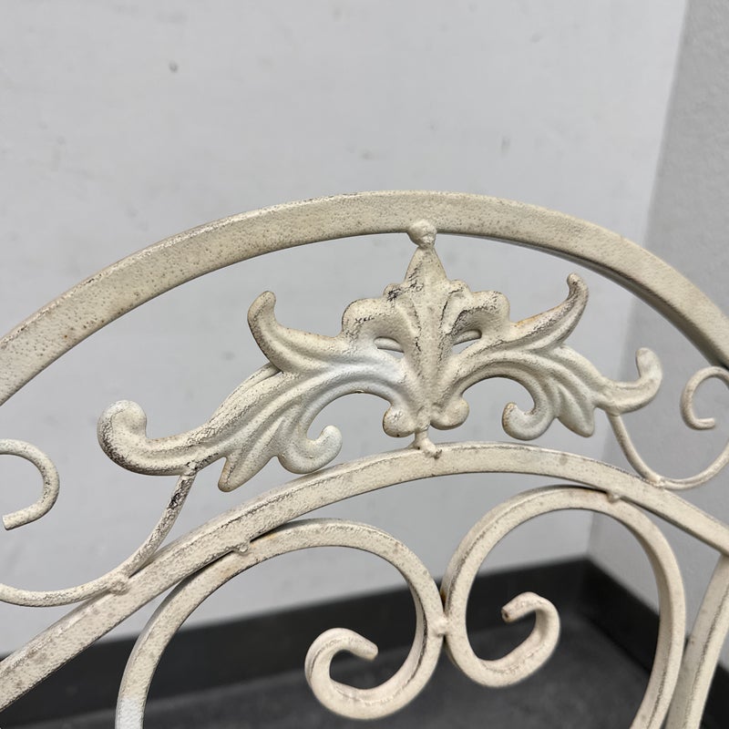 Design Plus Gallery presents the Mika Antique Chalk White Dining Set of Chairs & Table from Vigor. The set is in antique white paint over wrought iron with romantic details. There is signs of wear that are present and consistent with outdoor use.