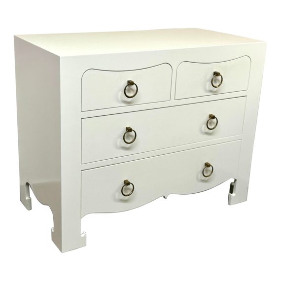 Design Plus Gallery presents the Jacqui Dresser by Villa & House. An elegant embodiment of opulent Hollywood Regency style, the Jacqui Large 4-Drawer features decorative wood-cut detailing, Chow-style curved feet, and flush front drawers topped with gold ring pulls.