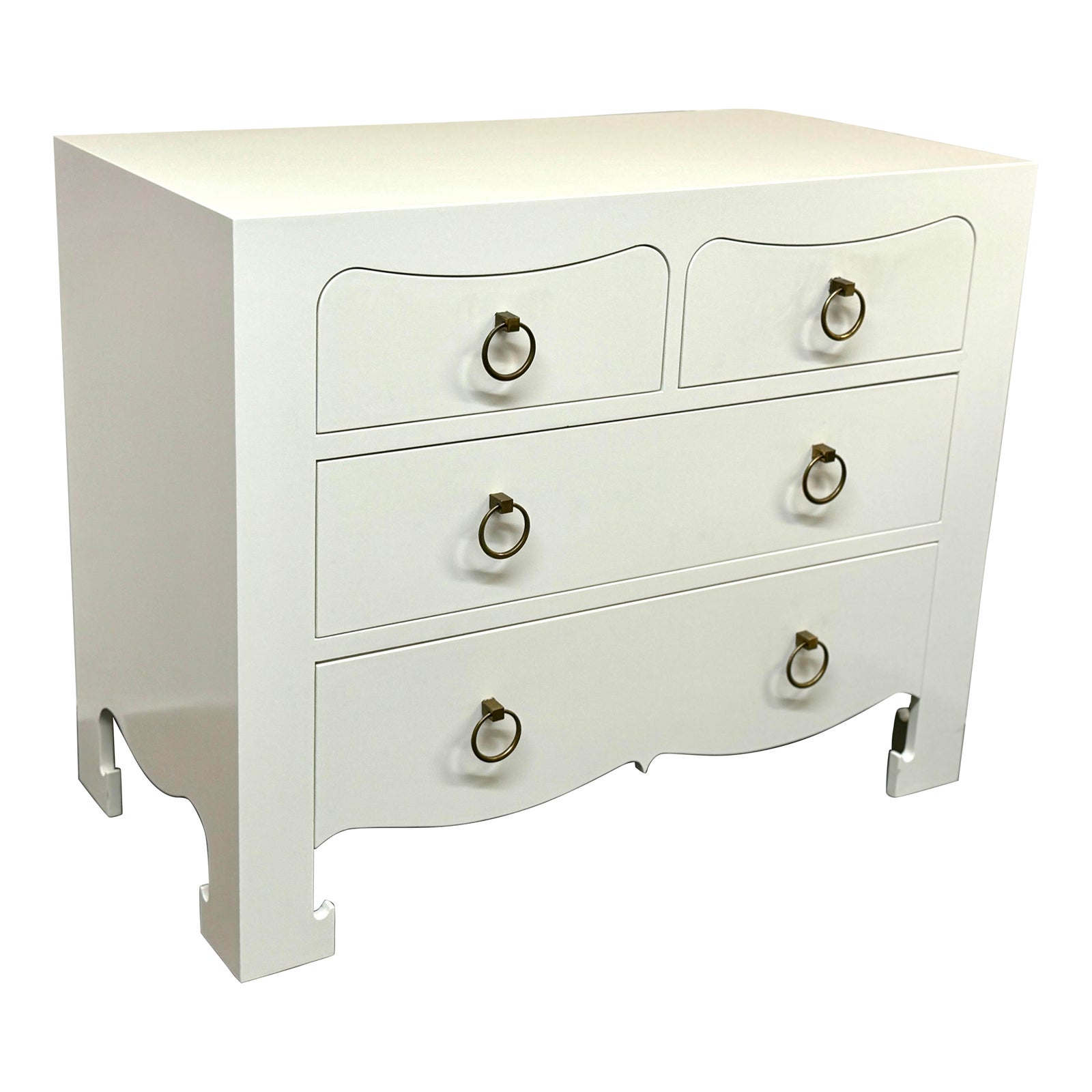 Finished in chic Chiffon white lacquered wood, the expertly-crafted piece instantly whisks you away to a scene straight out of classic Hollywood. Previously lined drawers; light surface wear; condition is consistent with age and use.