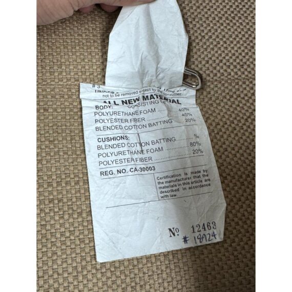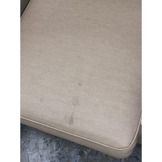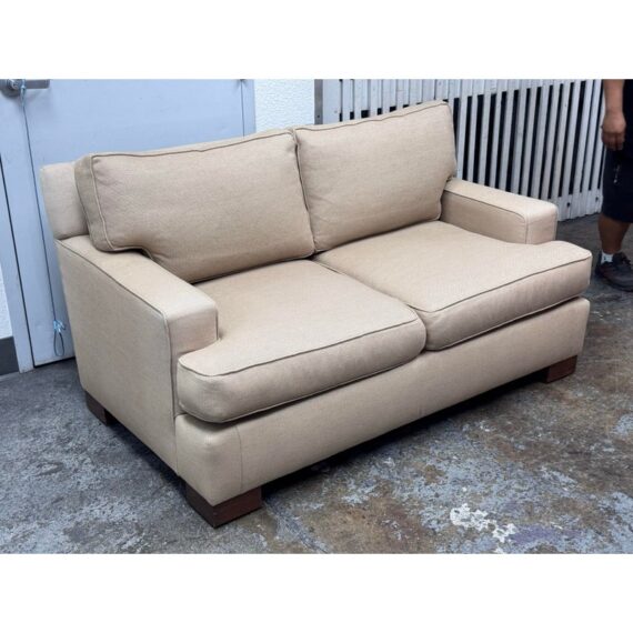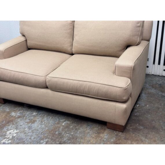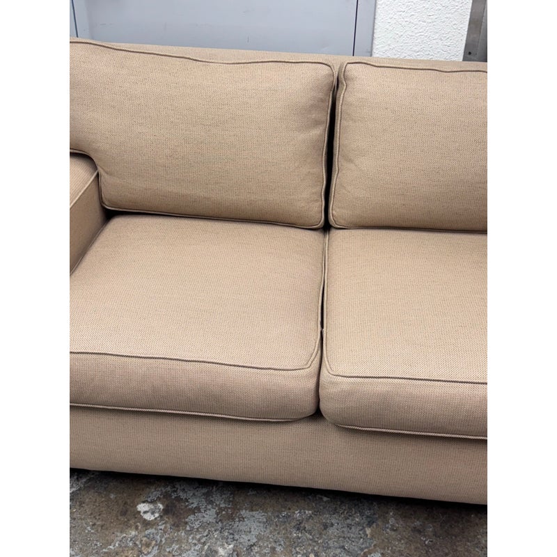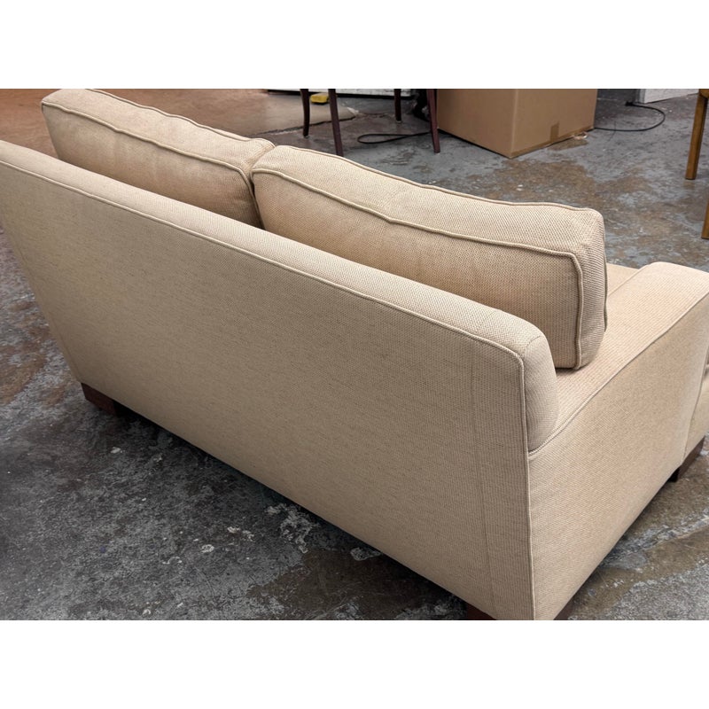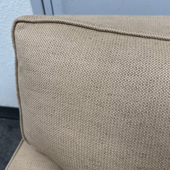 Design Plus Gallery presents a Woven Tan Tweed Village Square Apartment Sofa. The sofa has fine lines and clean silhouette that offers you timeless appeal. Great in a room for entertaining or office as it does not take up much space and is good for conversing closely. Two loose seat back and seat cushions are removable and have a down with feather stuffing. There is visible wear to the upholstery but overall it is in good condition for its usage. Made in the USA.