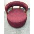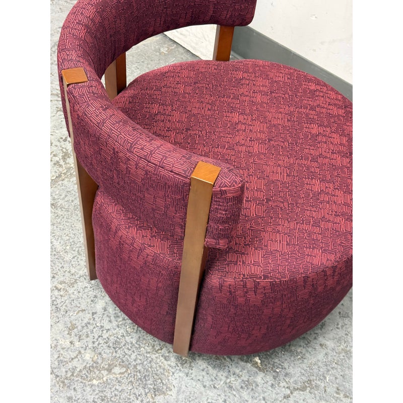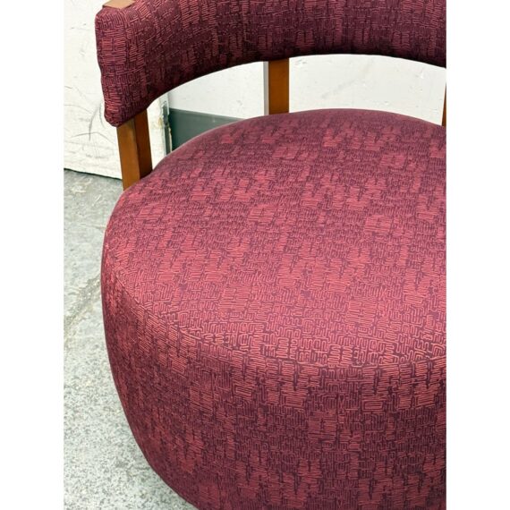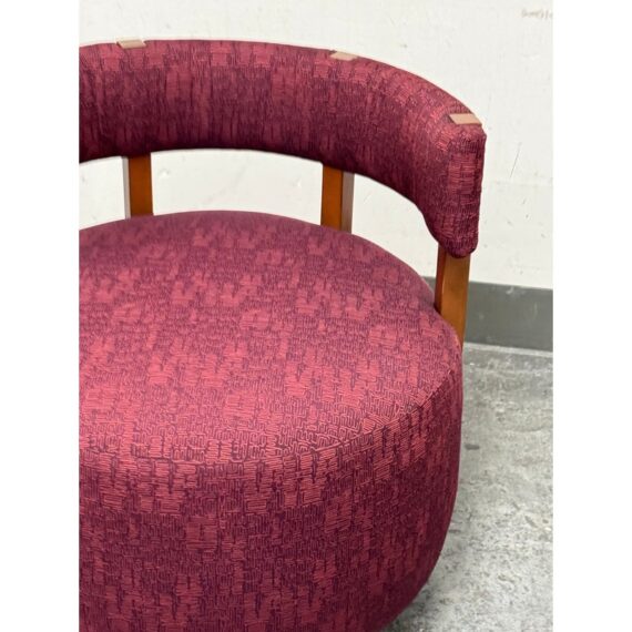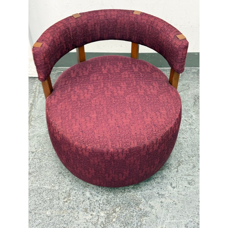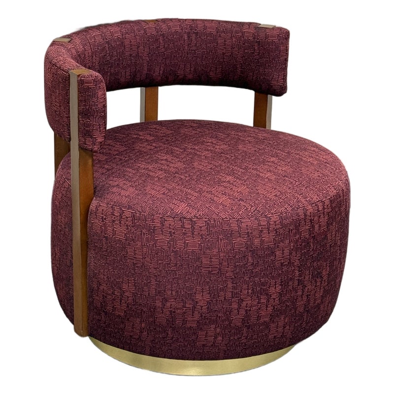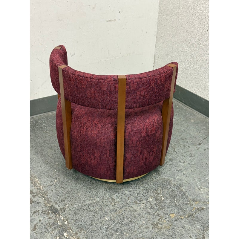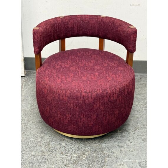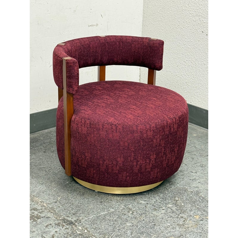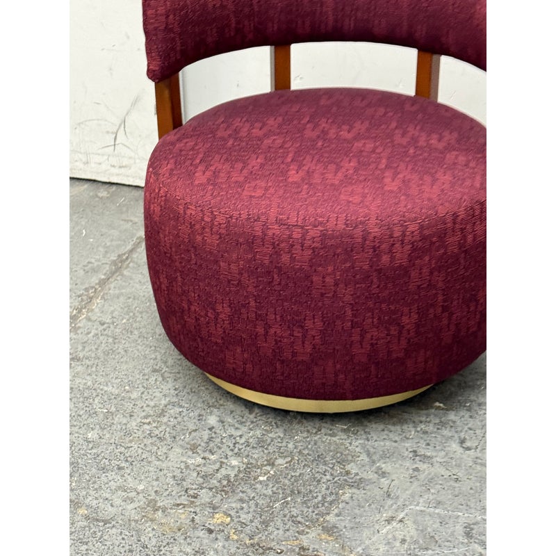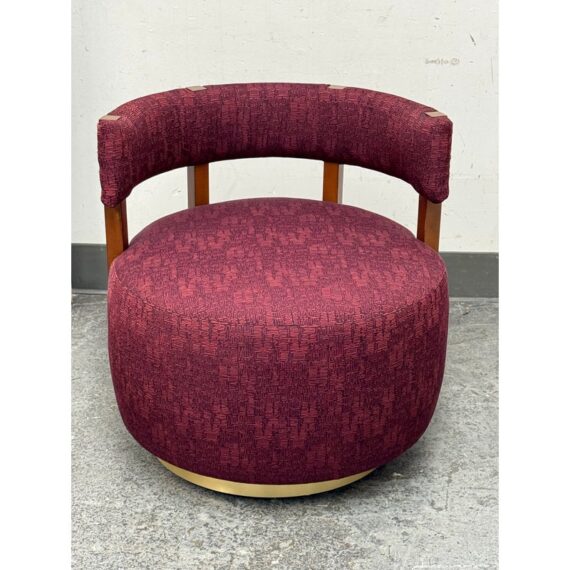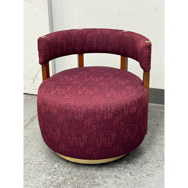 Design Plus Gallery presents a Club Swivel Chair in a Rich Gem Tone from Village West Design. The chair has a cool retro feel with a nod to mid-20th century styling. There is a rounded lumbar back connecting the upper to lower with exposed walnut wood beams. The entirety of the chair, minus the beam and brass platform base, is in a jewel tone of burgundy, similar to Raspberry. There is a pattern of interlocking grid lines making it not only striking but interesting too. It is in good condition with minimal visible wear for its usage.
