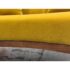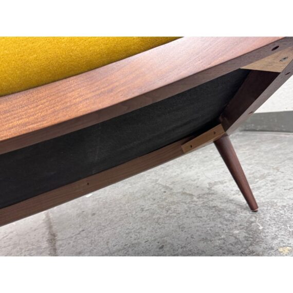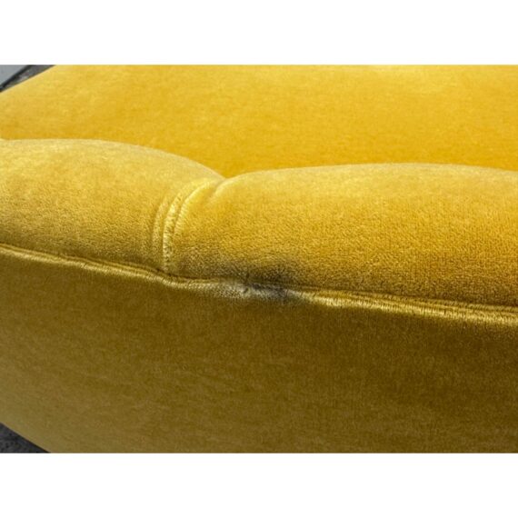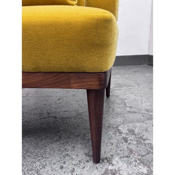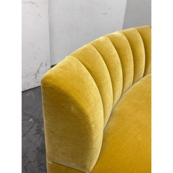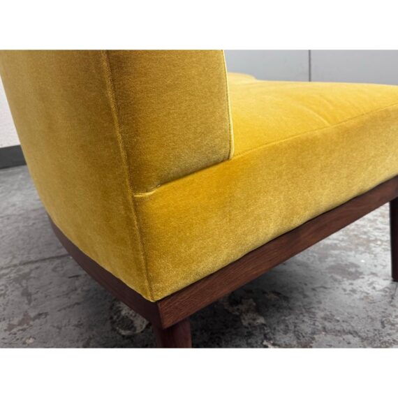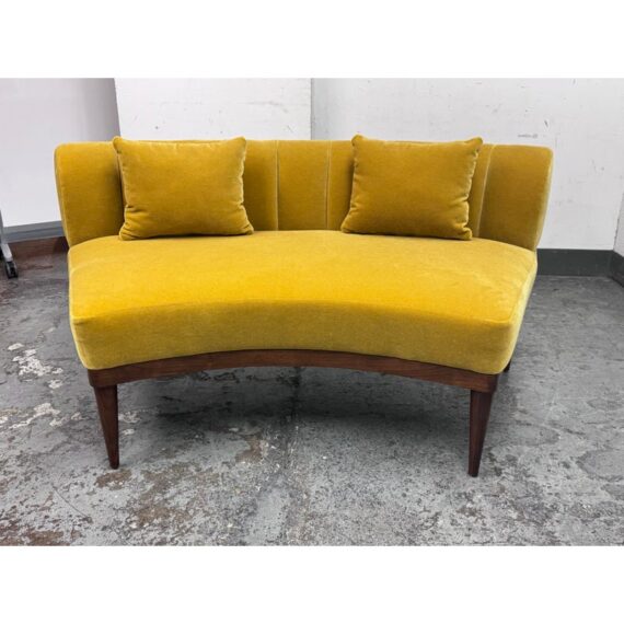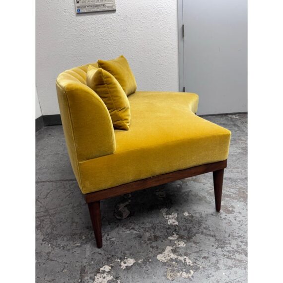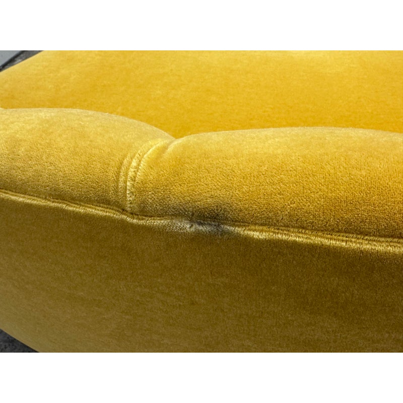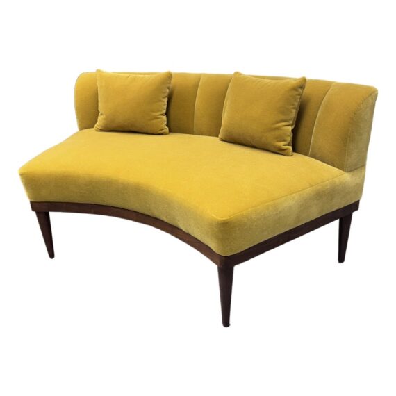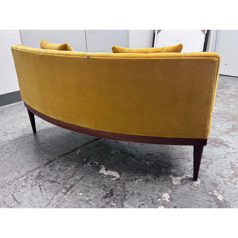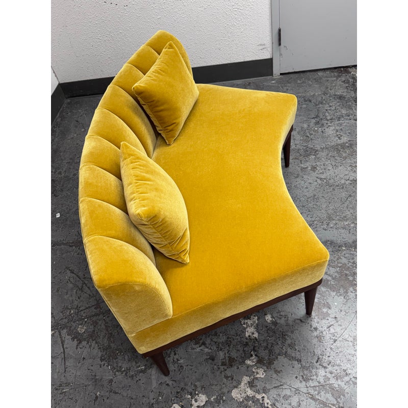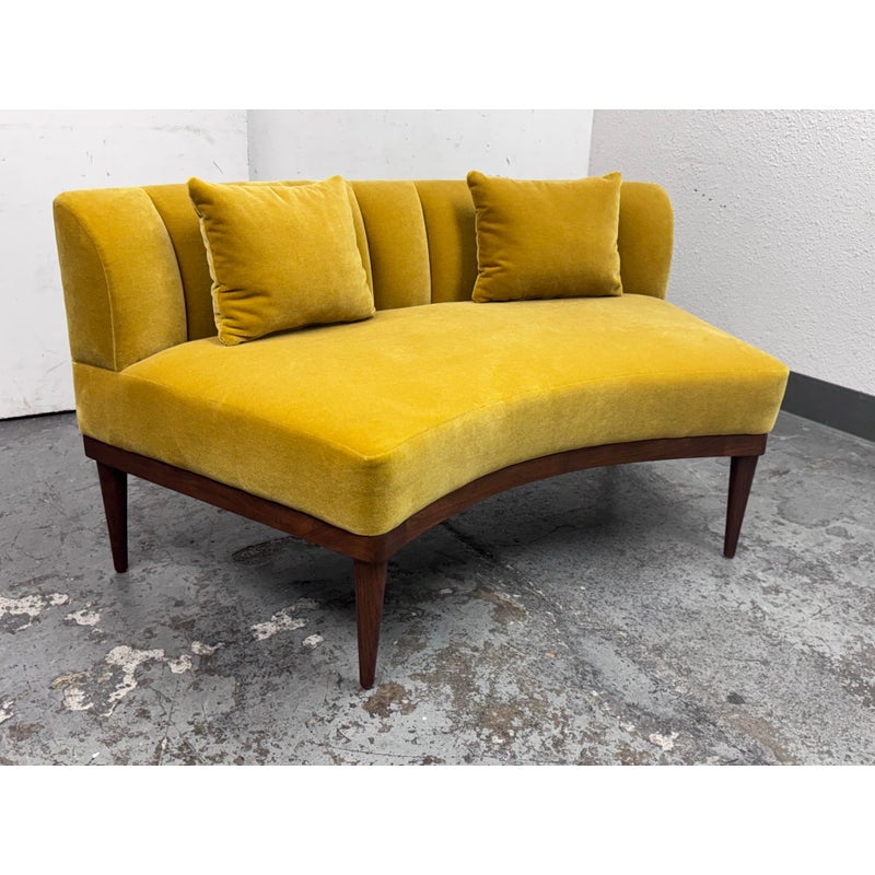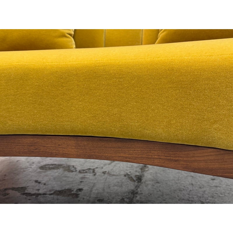 Design Plus Gallery presents a Curve Sofa in the Mid 20th Century Style by Village West Design. This custom piece offers a a bright punch of color with its seat + back entirely wrapped in a velvet in canary yellow. The back rest is curved with paneled tufting, offering sumptuous lines with a smooth feel. The seat has just the right amount of depth to sink into without being swallowed. There is a throw pillow of the same velvet with the sofa with a zipper to clean if needed. The base is solid walnut with a warm brown hue with tapered legs. It is in good condition with minimal visible wear.