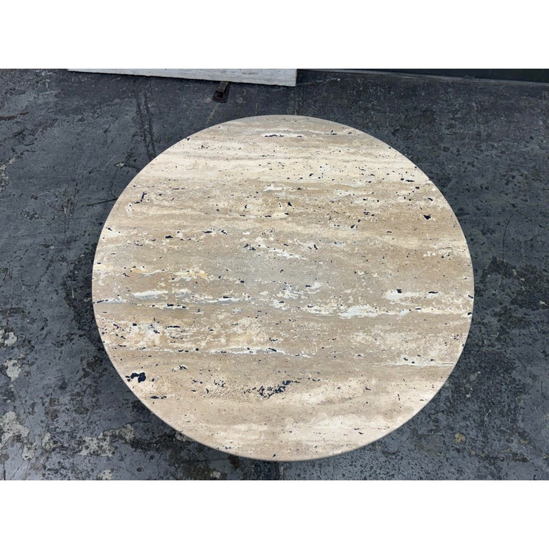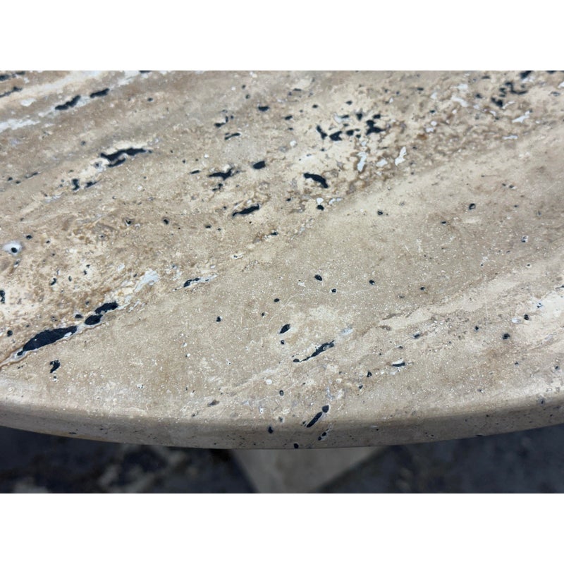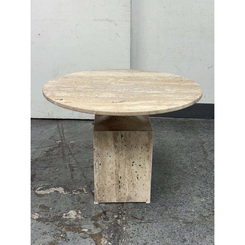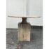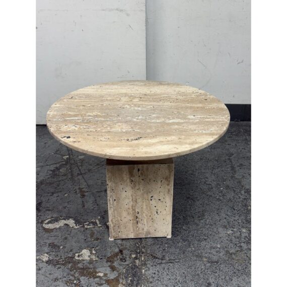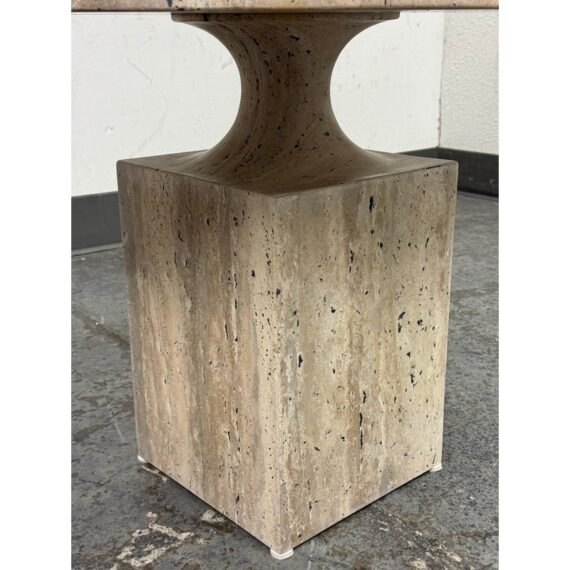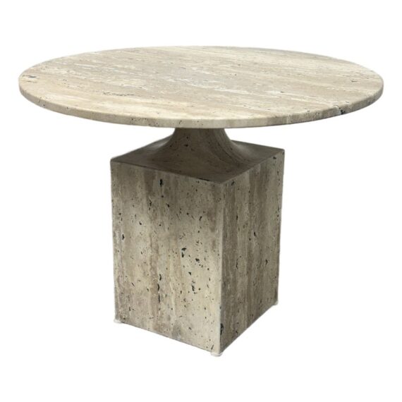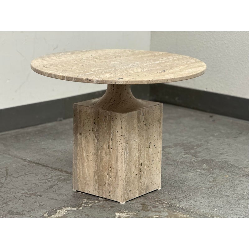 Design Plus Gallery presents the OUK Travertine Side Table designed by Vincent Dupont-Rougier for Christophe Delcourt. The design cleverly plays with balance and symmetry as the OUK has a round surface supported by square base. It is large enough to use as an occasional serving table and compact enough to function as a side table. Its clean lines and solid form make it a versatile choice for modern interiors, offering both function and timeless elegance. In good condition, minimal wear from usage. Made in France.