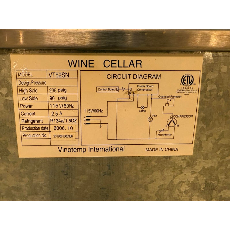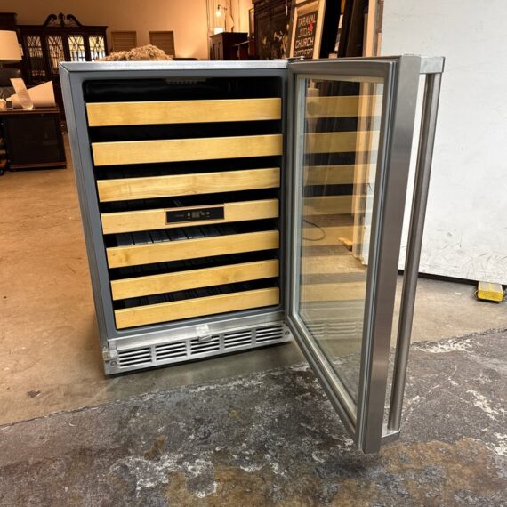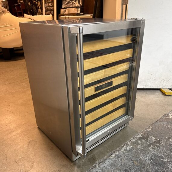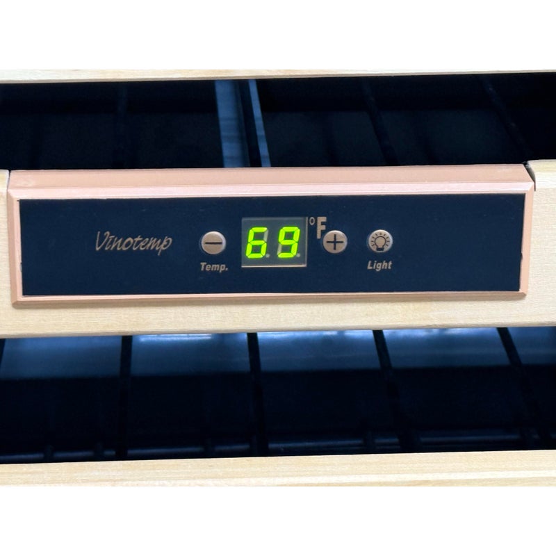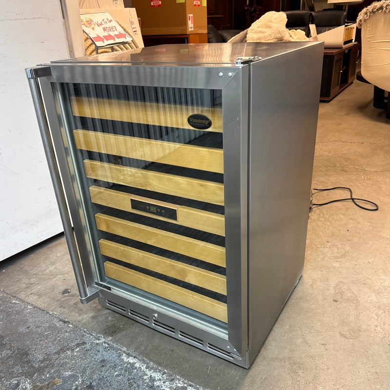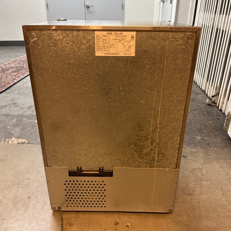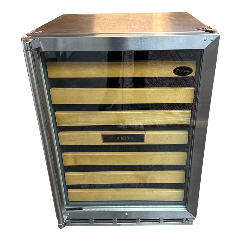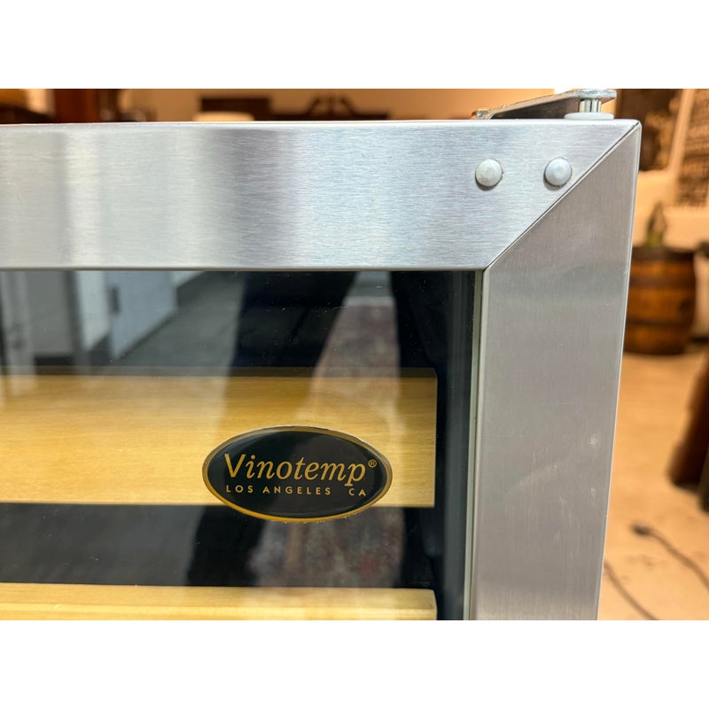 Design Plus Gallery presents a Wine Fridge from Vinotemp. Vinotemp wine storage solutions are hand-crafted with domestic woods in Southern California. Vinotemp wine coolers, wine cellars & refrigerators maintain an ideal environment for wine storage. These wine coolers help keep the temperature at 55 degrees with 50-70% humidity, similar to the cool caves used to store wine in France. Shows visible and minimal surface wear and is in good condition for its usage.