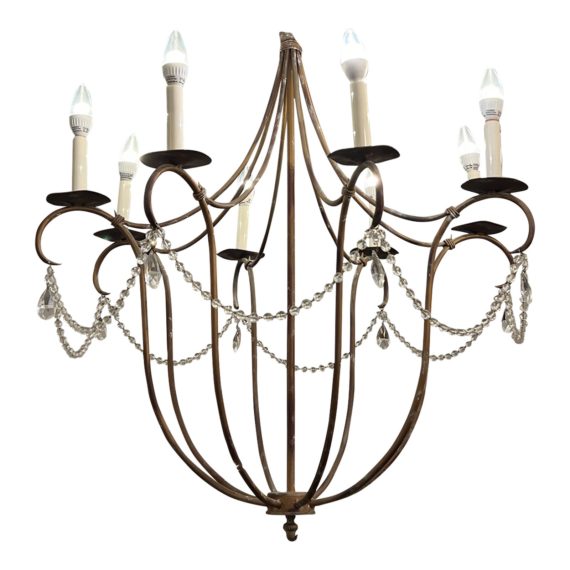 Design Plus Gallery presents a Vintage Chandelier. This eight-arm wrought iron frame is adorned with intricate drapery details and a strand of beautiful crystals. The rustic, antique finish is sure to add a touch of classic elegance to any space. The chandelier is perfect for those seeking a unique and timeless piece to add a touch of elegance and sophistication to their home. With its classic design and timeless beauty, this chandelier is sure to become a beloved part of your home for years to come. It is missing the original crystal ball that hangs underneath.