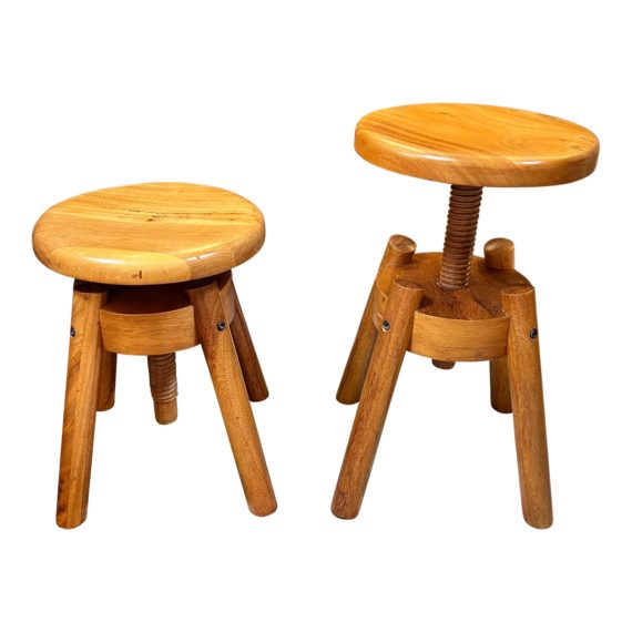Design Plus Gallery presents a Pair of Vintage Stools. Solid wood with a clear finish, the pair are pure charm. Classic screw mechanism, all in wood, allows the height of the round seat to be elevated or lowered depending on the sitter or the job at hand. Doubles easily as cocktail or side table. Light surface wear; otherwise good working condition.