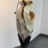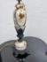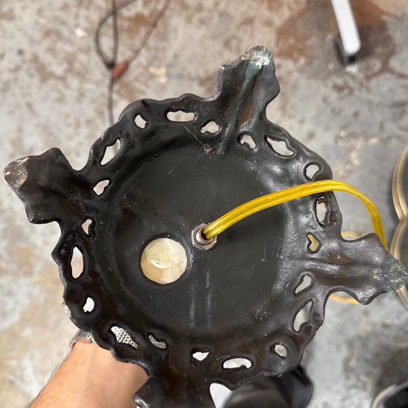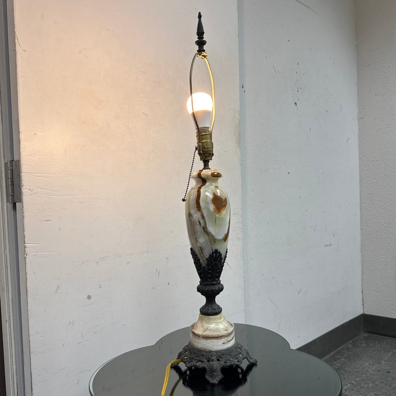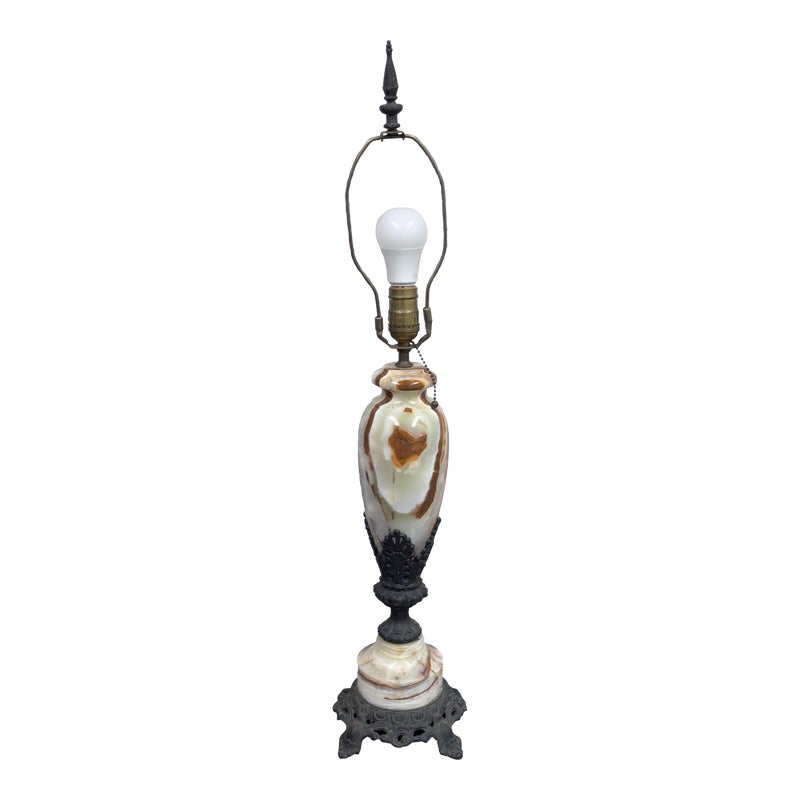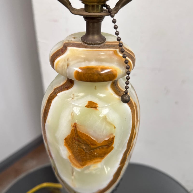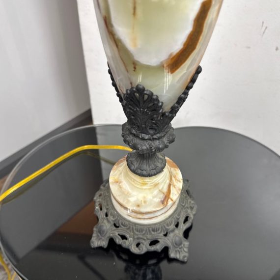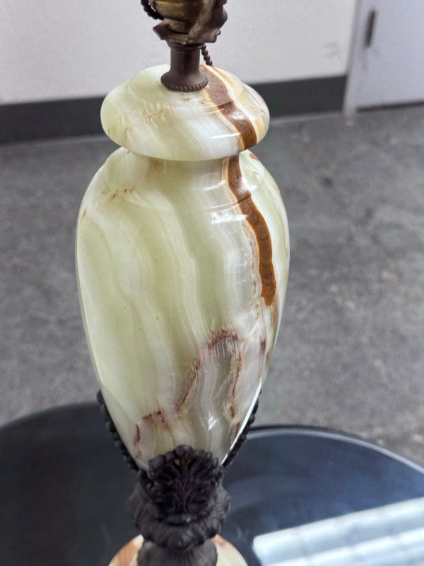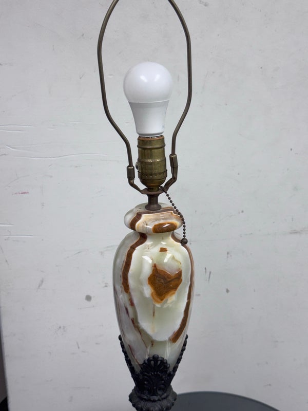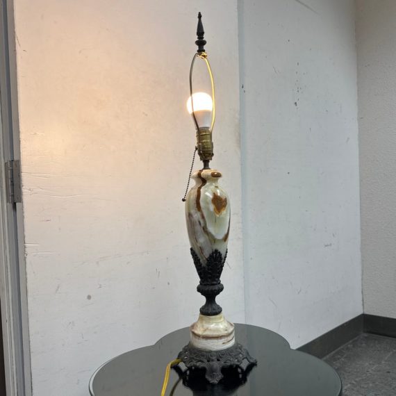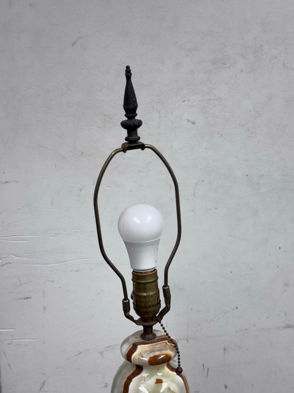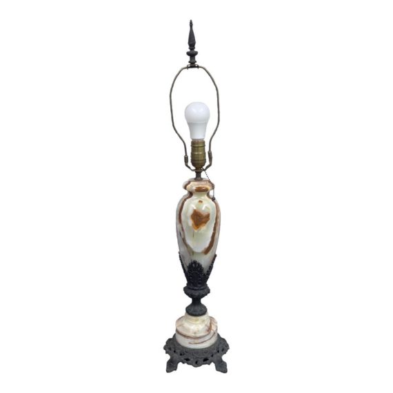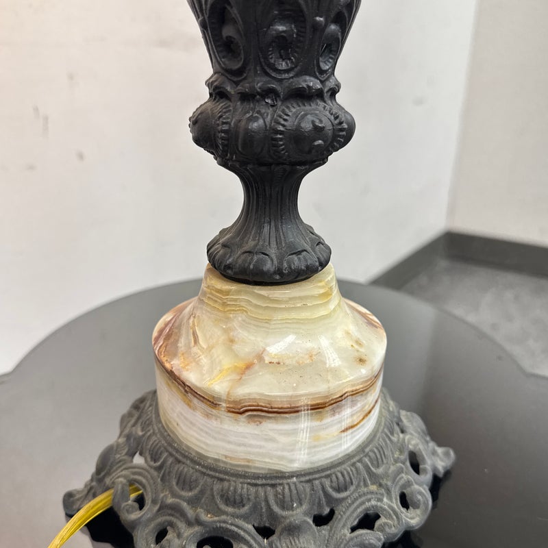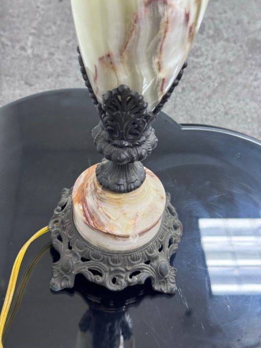 Design Plus Gallery presents a Slag Agate Table Lamp with Antique Iron Foundation. The mid century lamp has amber and green streaks to the stone with etched metal work. Is in good condition with minimal signs of wear for its usage.