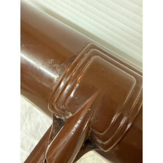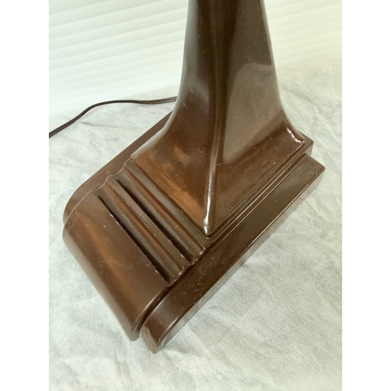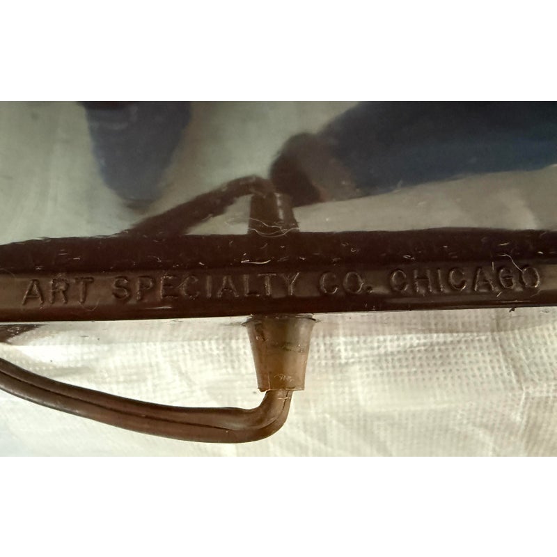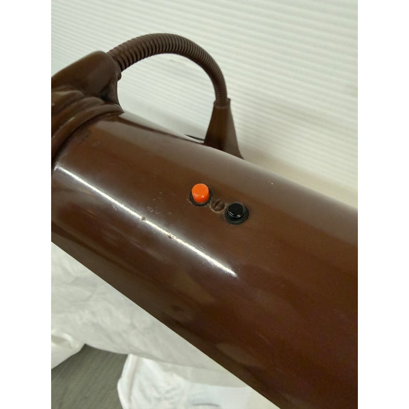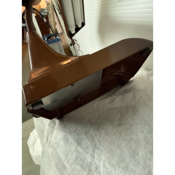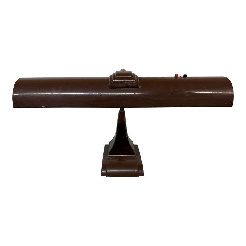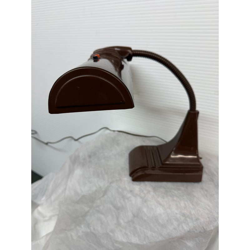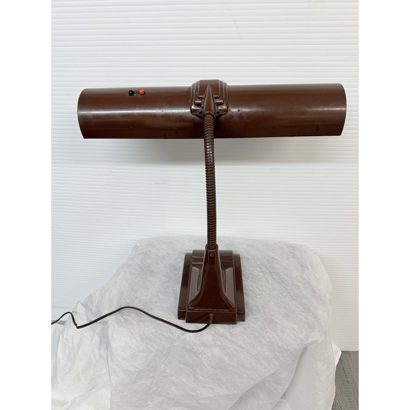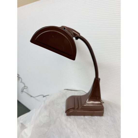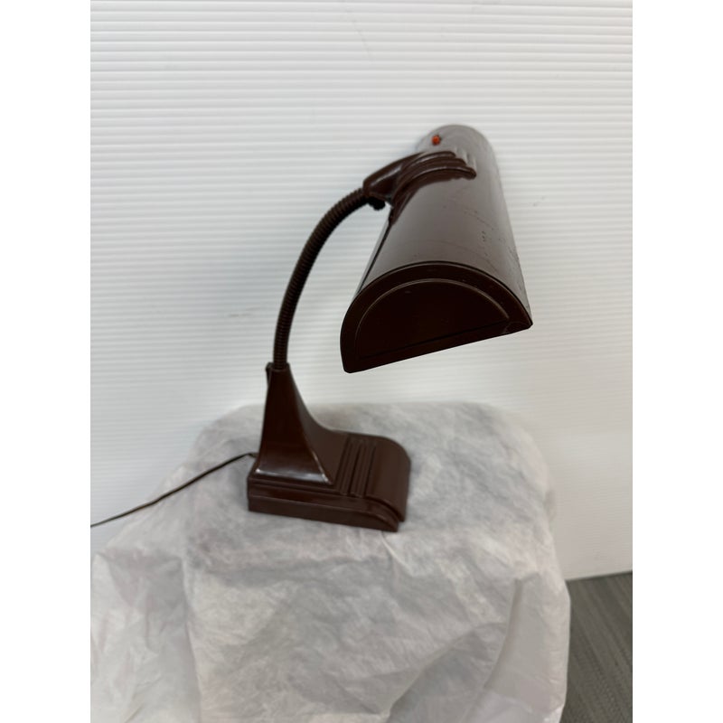 Design Plus Gallery presents a Vintage Desk Lamp from Vintage Art Specialty, Chicago. Art deco influences can easily be seen in the brown metal task lamp. A gooseneck supports the broad light at just the right angle. Simple push button on/off. Light surface wear; condition is consistent with age and use.