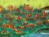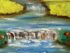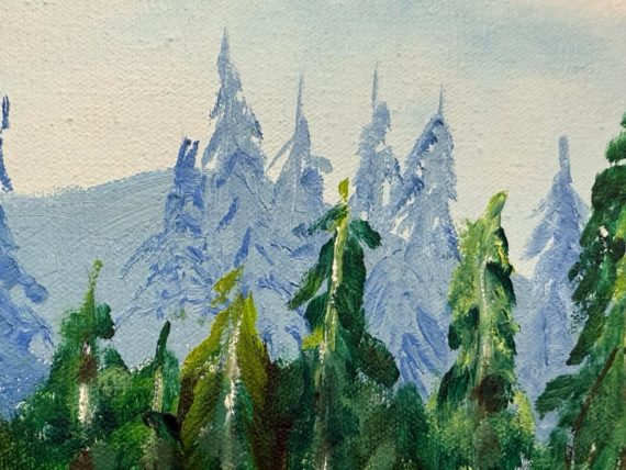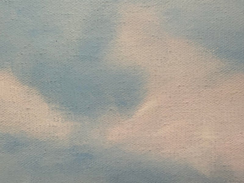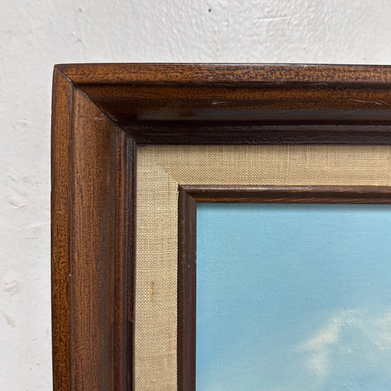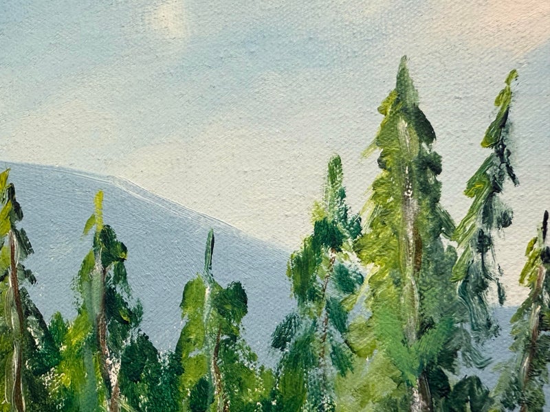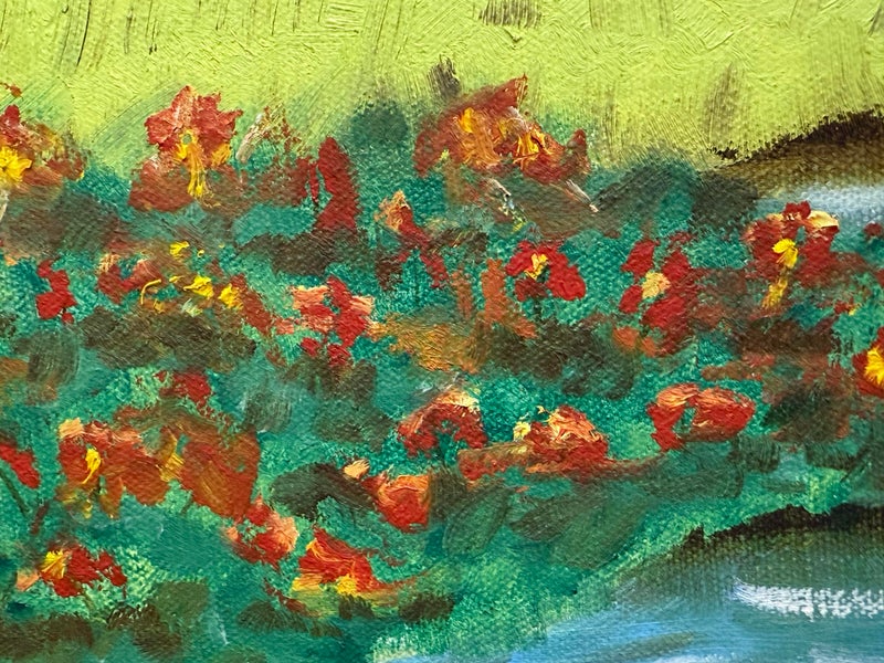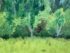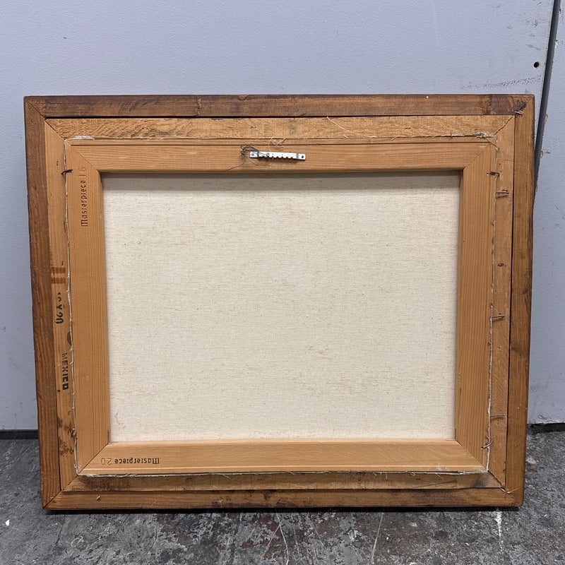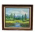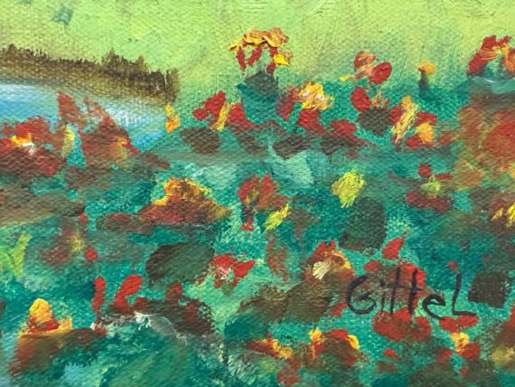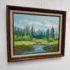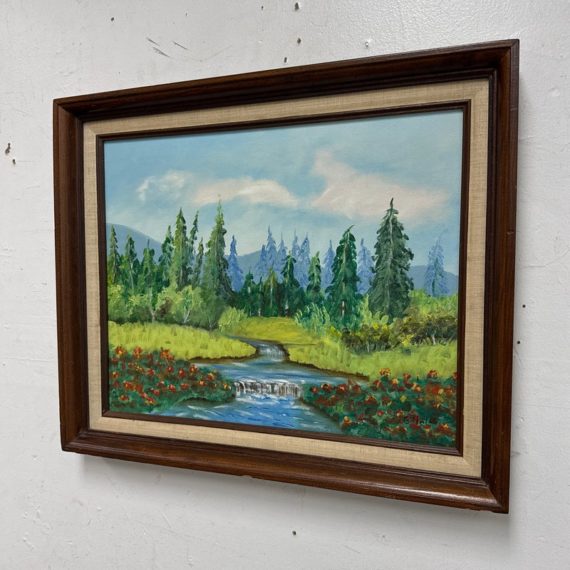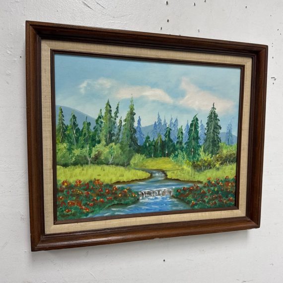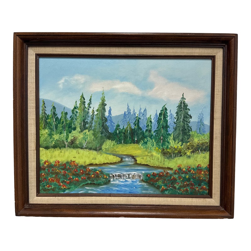 Design Plus Gallery presents an Artwork by Unknown Artist, Gillet. the serene artwork shows tall trees in the distance with a shallow stream going through a flowering field. Dark wood frame with a linen matte. Is in good condition with minimal signs of wear for its vintage age.