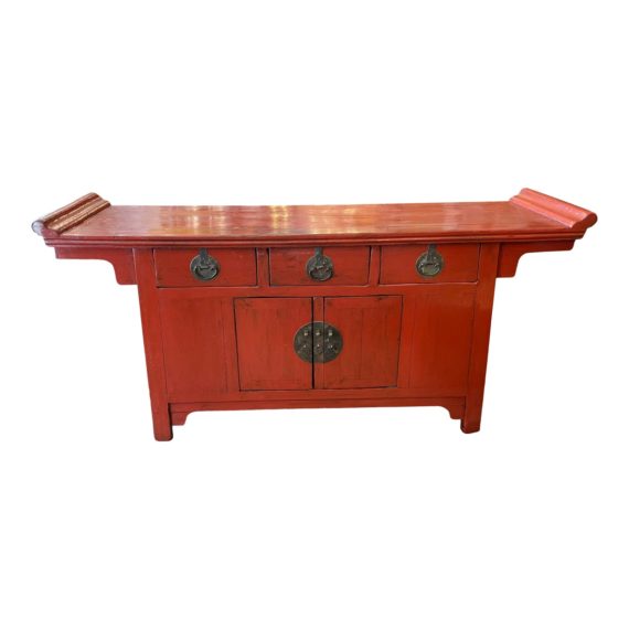 Design Plus Gallery presents a Vintage Chinoiserie Altar Style Coral Console. Solid Elm is meticulously hand crafted into this iconic altar console silhouette and look. Lacquered with a satin finish in a vibrant shade of coral. The character of the wood comes through with a patina from time an love. There is a visible crack on the surface. Console is in good condition. Oiled brass hardware accents the wood beautifully.