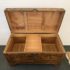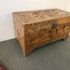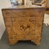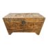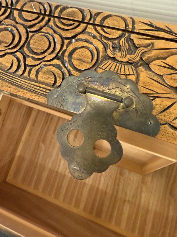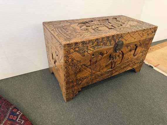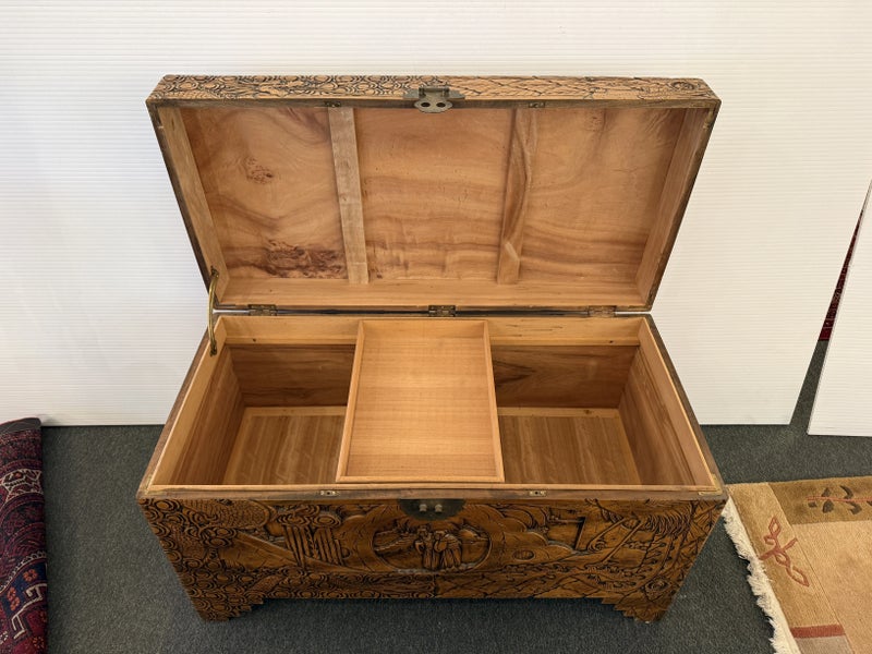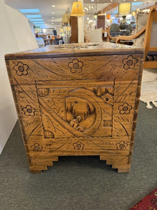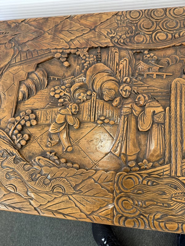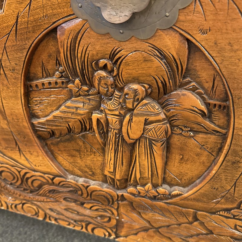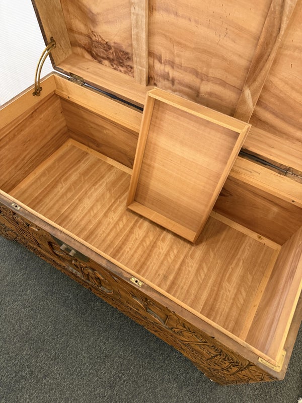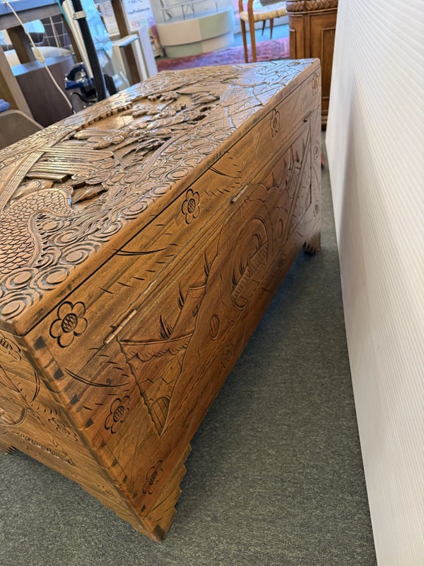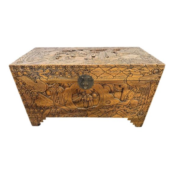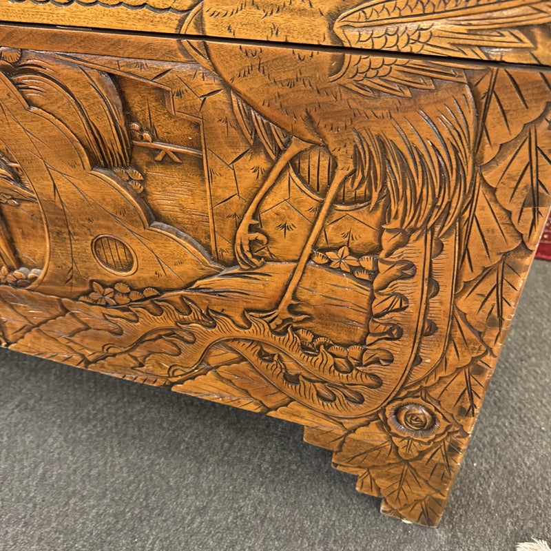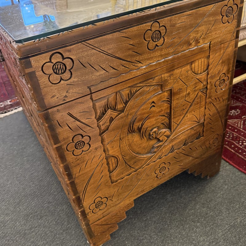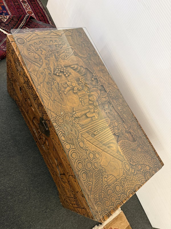 Design Plus Gallery presents a Vintage Carved Asian Chest. The light wood is intricately carved with vignettes of flora and fauna both mythical and real. Large storage space is topped with a shallow drawer that slides. Finished with brass fittings, and protected with custom glass. Light surface wear; no pin; condition is good for age and use.