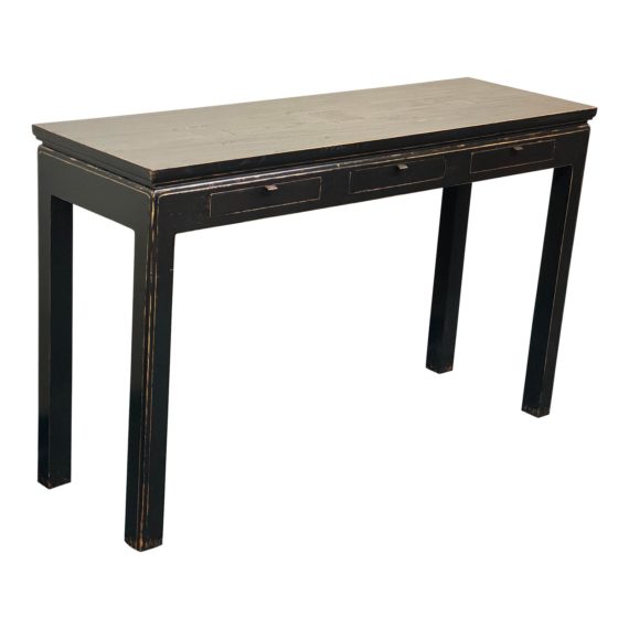 Design Plus Gallery presents a Vintage Asian Console Table. Solid elm joinery is finished with a classic black lacquer and inset with inscribed brass plaques. Design and scale make it easy to use in entryway, behind sofa or in dining room. Features three shallow drawers for storage, such as keys, remotes or other every day essentials. Light surface wear is consistent with age and use.