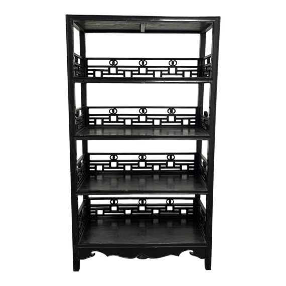 Design Plus Gallery presents a Vintage Asian Influenced Black Lacquered Bookcase. Solid elm is lacquered a deep and contrasting black. Paint accents the lovely fretwork on the back and sides. One of sides is missing a piece of the top cross bars. Paint has a crackle finish. Bookcase is in good condition.