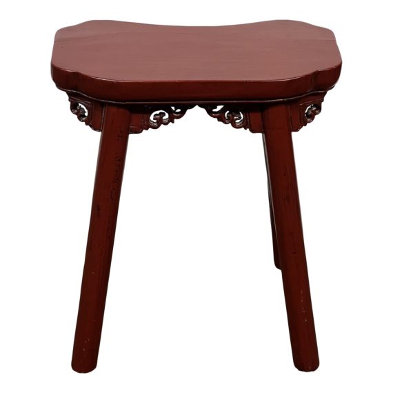Design Plus Gallery presents a Vintage Wood Asian Style Stool. Crafted from solid woods with carved aprons. The finish is a tradition oxblood red finish. Suitable as a stool, or a small side table. Good Condition, wear from usage + age