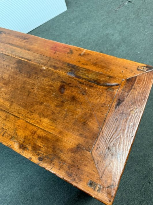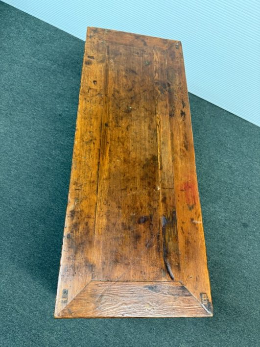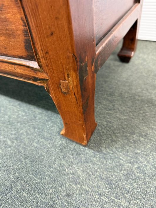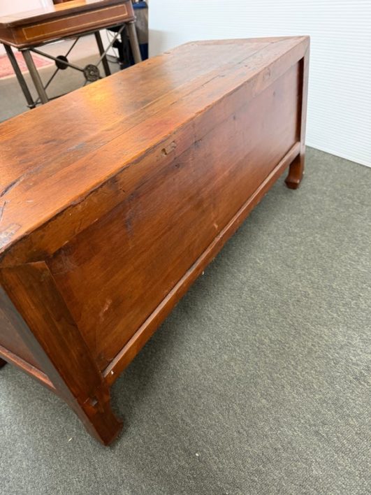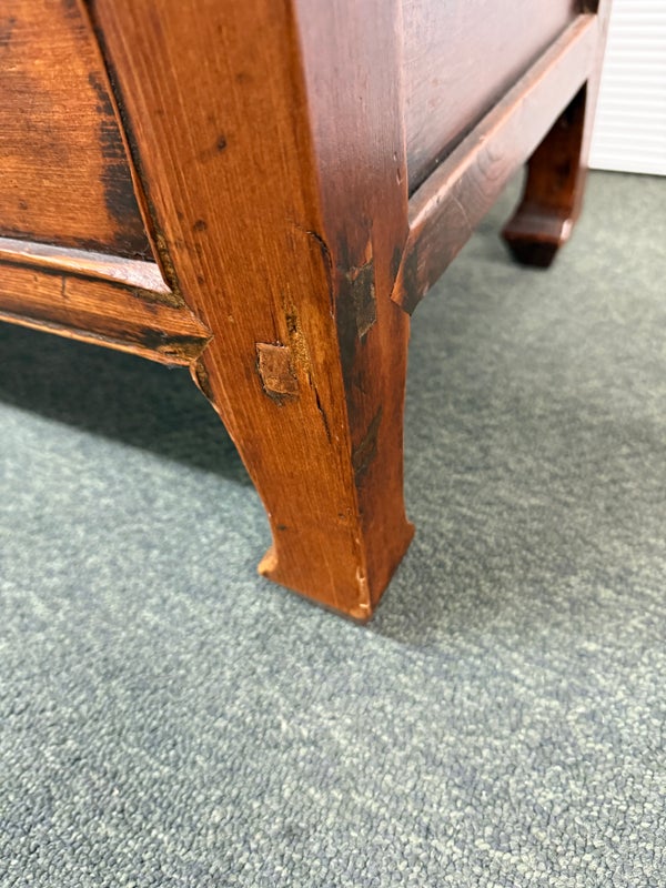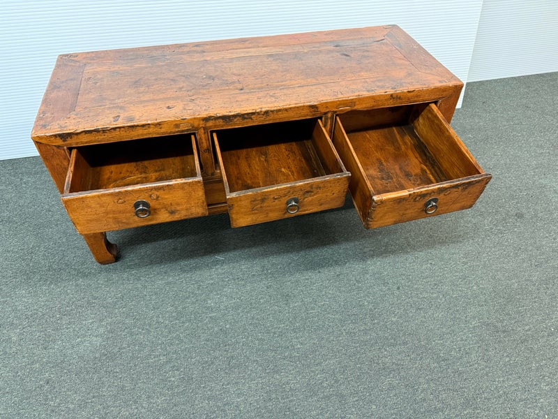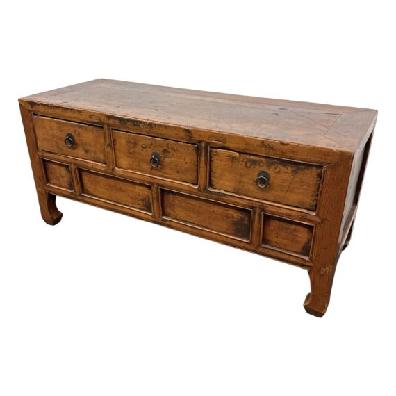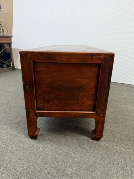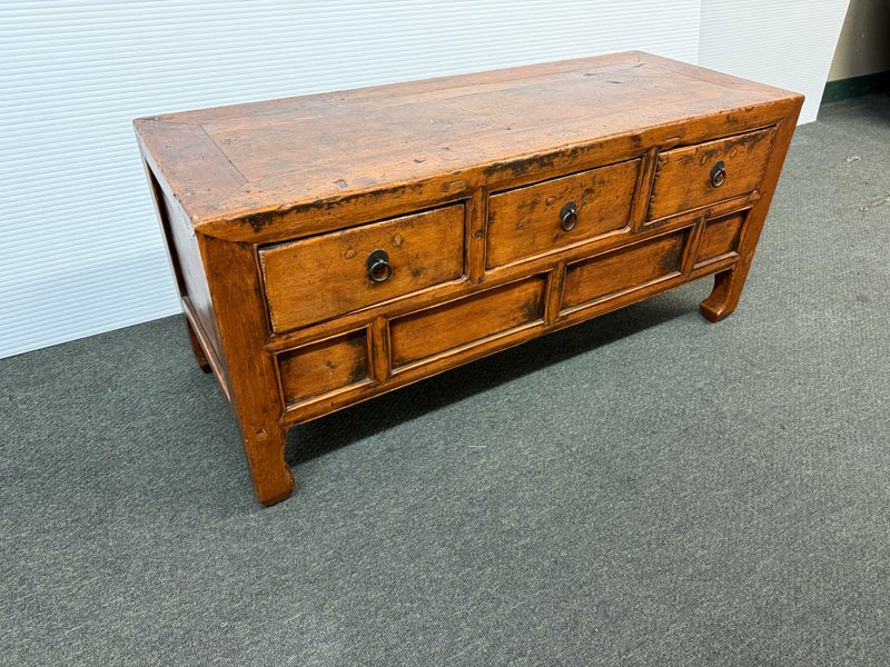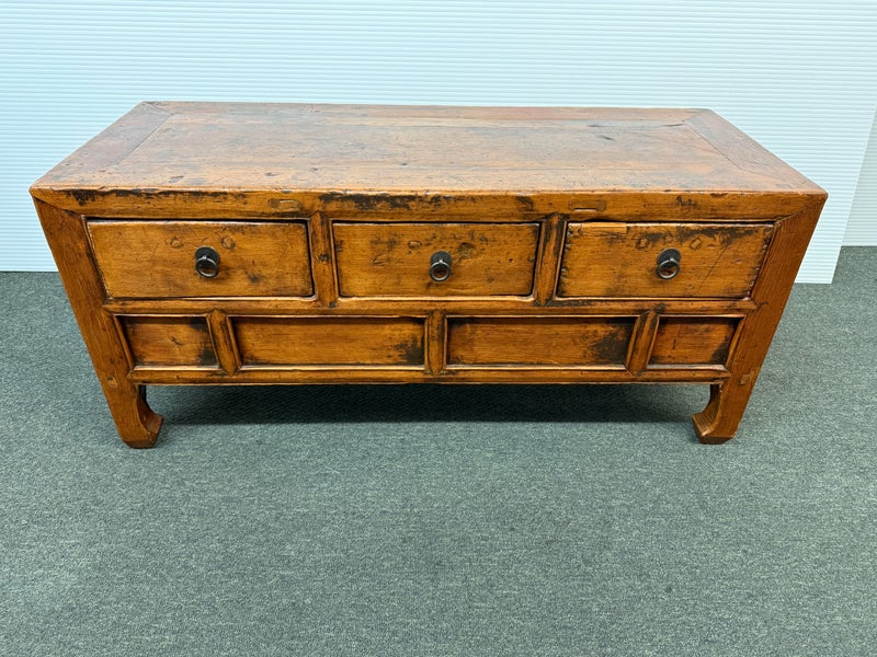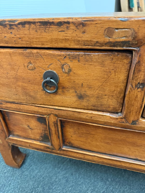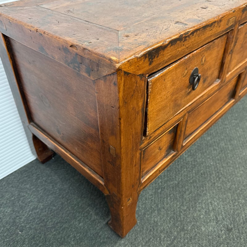 Design Plus Gallery presents a Vintage Asian Cabinet. Simple silhouette detailed with subtly curving ming styled legs, this low cabinet is crafted simple of elm and sports patina of many years of use. Original iron fittings. Condition is consistent with vintage age and use.