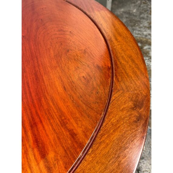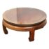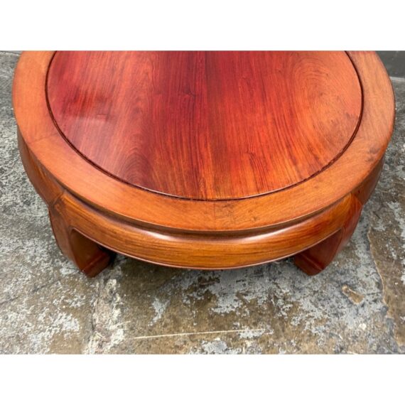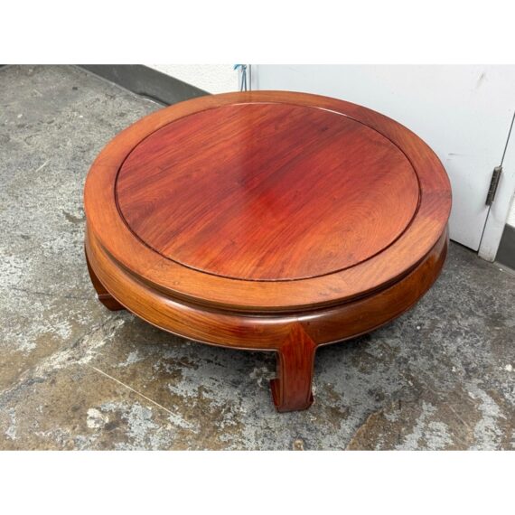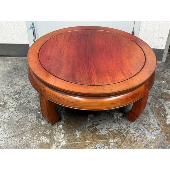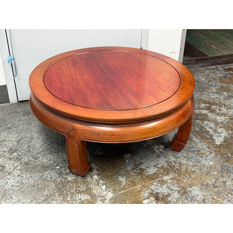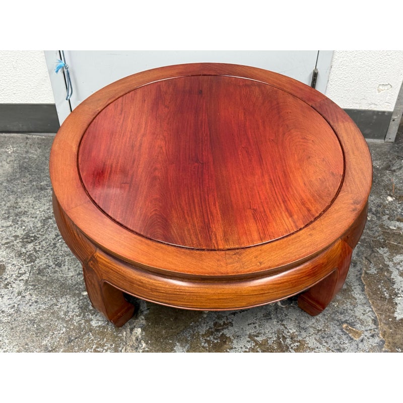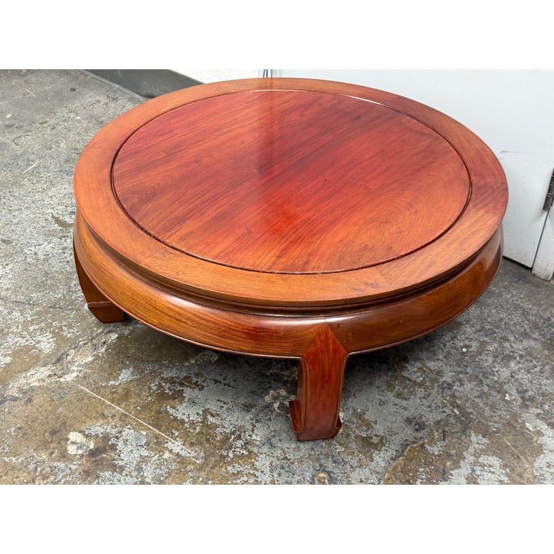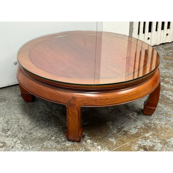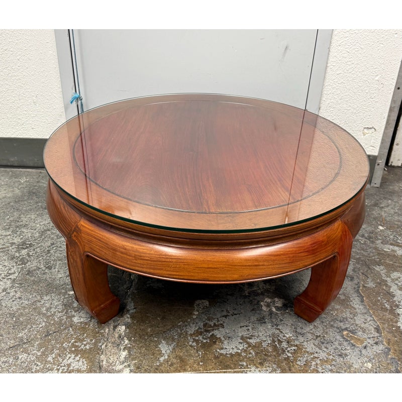 Design Plus Gallery presents a Round Asian Coffee Table. Crafted from solid Rosewoods. The table is low to the ground and stands on thick Ming legs that curl inward. The table top has a glass to protect from superficial scratches and maintaining its lacquer finish. In good condition, visible discoloration due to sun exposure and usage.