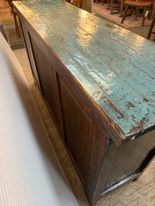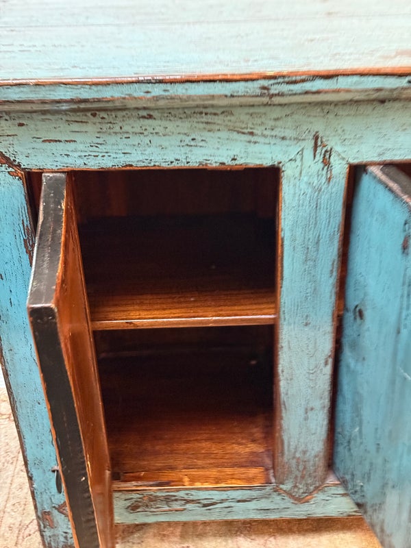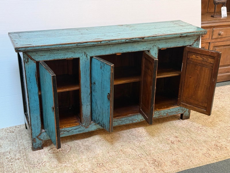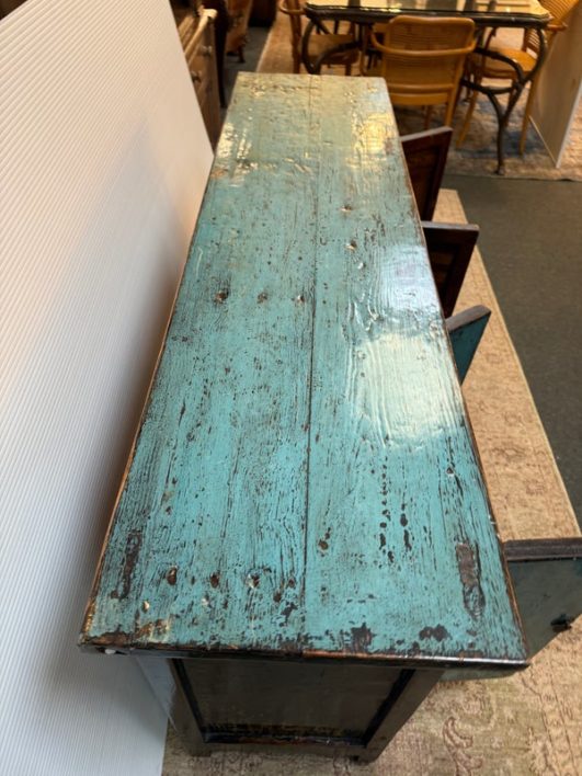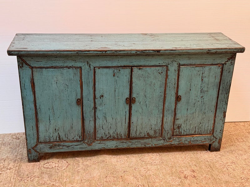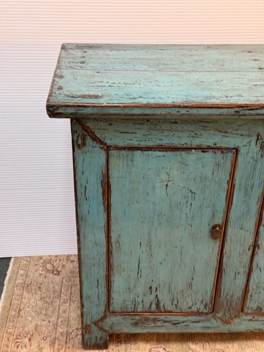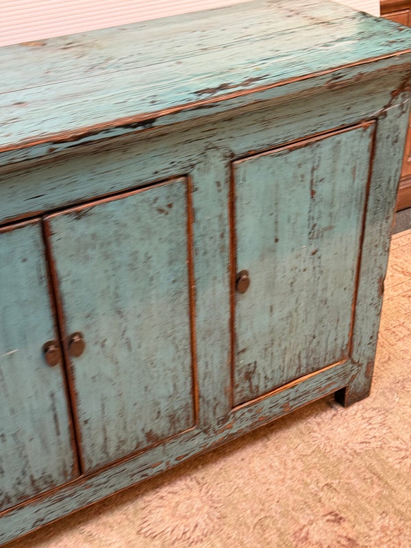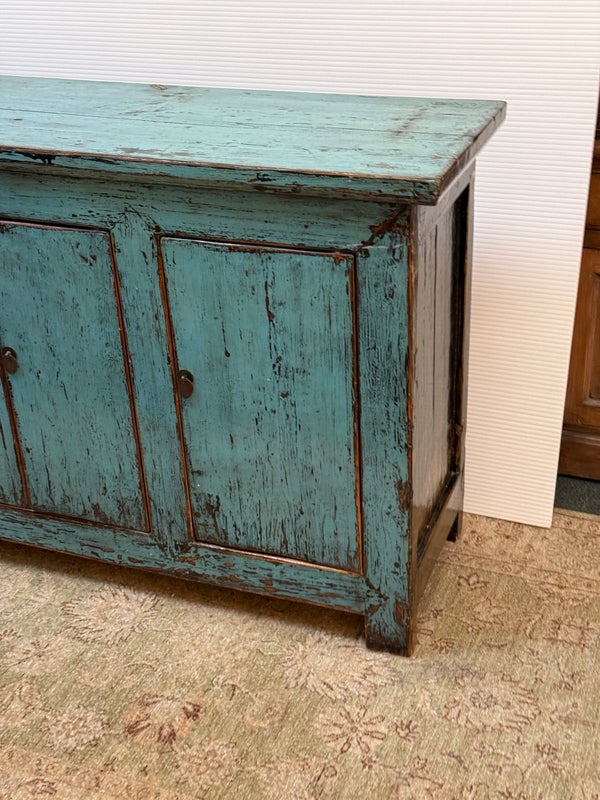 Design Plus Gallery presents a Vintage Asian Cabinet. The scale of this lovely cabinet is accentuated by the distressed turquoise lacquer finish. The doors open to adjustable shelving that allows for ample storage. Size and scale makes it a wonderful entryway piece or media cabinet. Distressed finish intentional; condition is good for age and use.