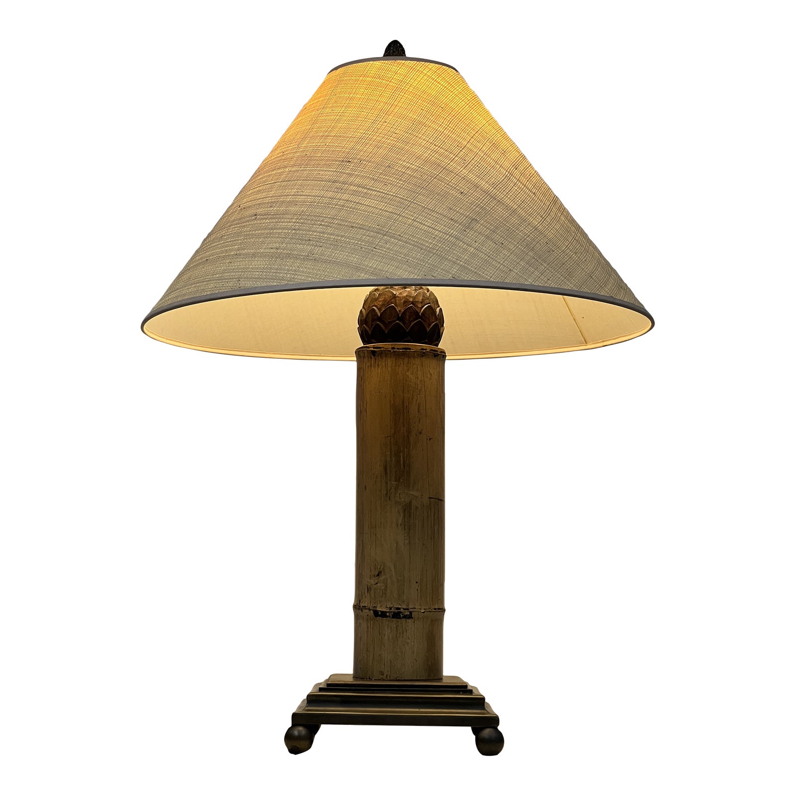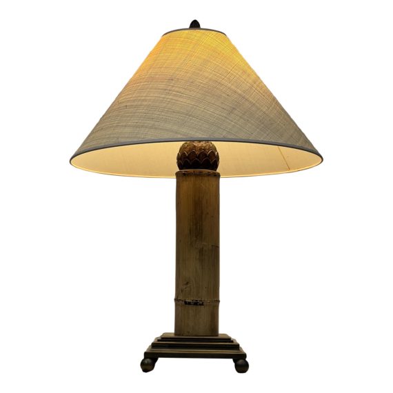 Design Plus Gallery presents a Bamboo Table Lamp with Coned Shaped Linen Shade. This rustic lamp has a hidden surprise beneath its shade, a carved artichoke. Very lovely ethic appealing table lamp that is in good + working condition. Wear from usage + age.