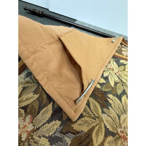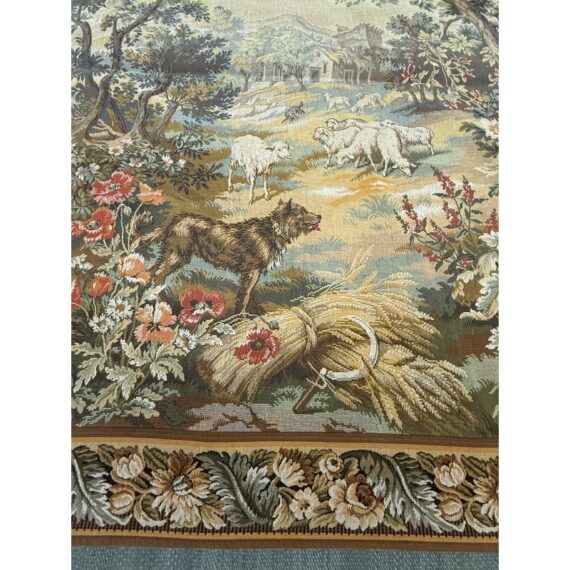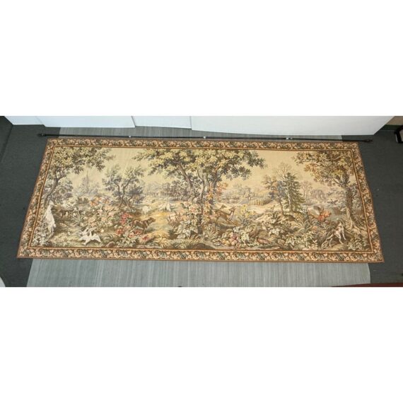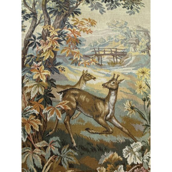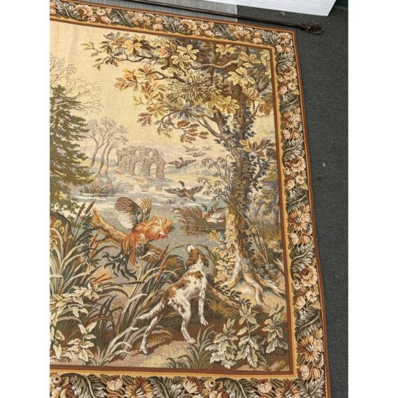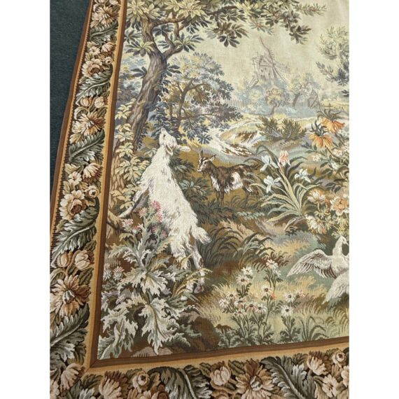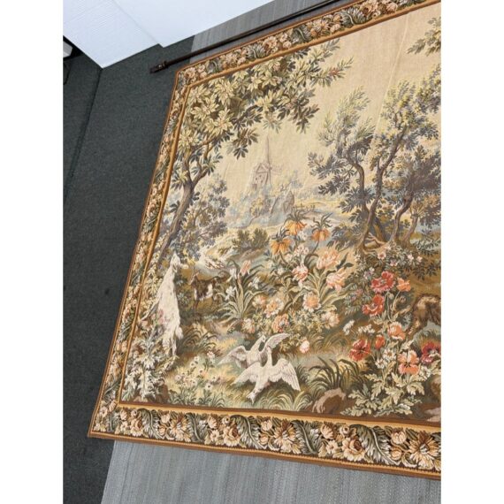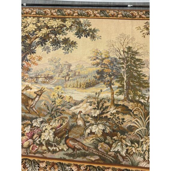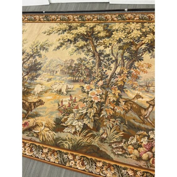 Design Plus Gallery presents a Vintage Belgium attributed Large Tapestry. Warp and weft weave a captivating forest tableau adorned with flora and fauna. The tapestry is elegantly backed in gold cotton sateen and has pockets for metal hanging rod. Enhance your space with exquisite softness and vibrant colors. Minor wear on fibers.