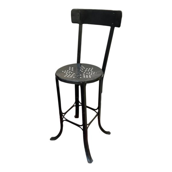 Design Plus Gallery presents a Vintage Iron Stool. The bar height stool was handcrafted entirely of metal, patina black paint finished. The seat has a perforated star pattern and the simple back supports when needed. Perfect for art studio, craft room, workbench or just a spot to rest in a kitchen. Vintage surface is intentional; condition is consistent with age and use.
