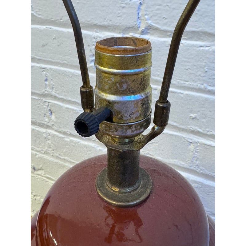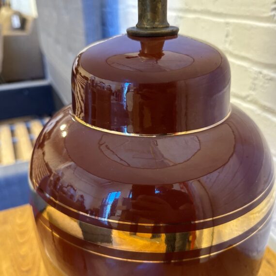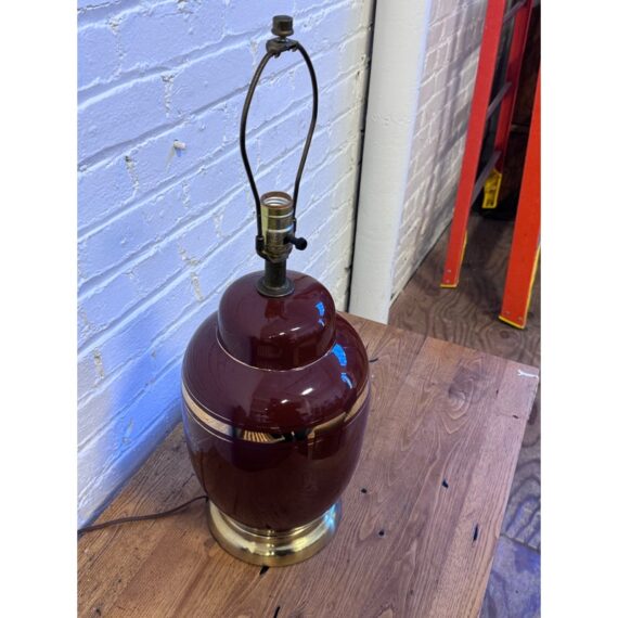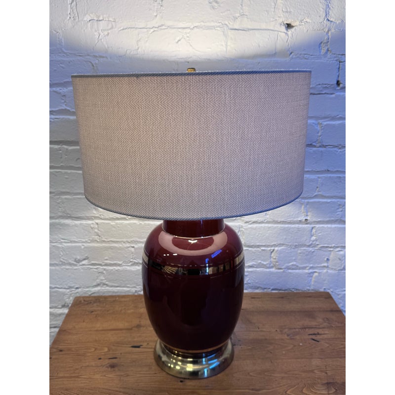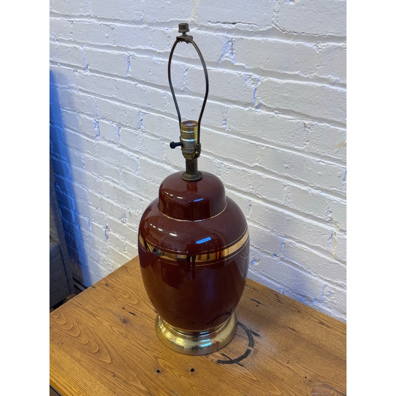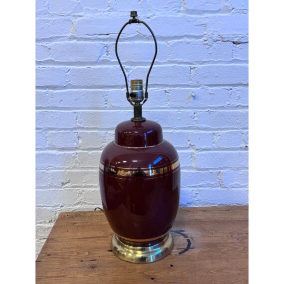 Design Plus Gallery presents a Vintage Ceramic Table Lamp. A deep bordeaux red glaze that brings richness and warmth to your decor. Subtle yet luxurious, the lamp is adorned with refined gold banding around its midsection and neck, effortlessly catching and reflecting the light for extra sophistication. Perfect as a statement piece on an accent table, nightstand, or sideboard, this lamp seamlessly bridges vintage appeal and contemporary refinement. In good condition, visible and minimal wear.