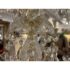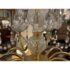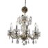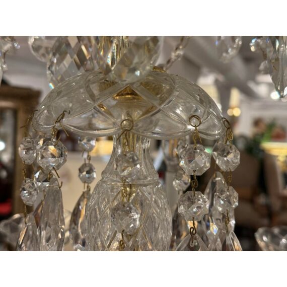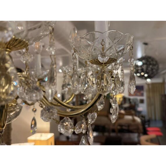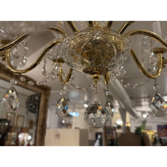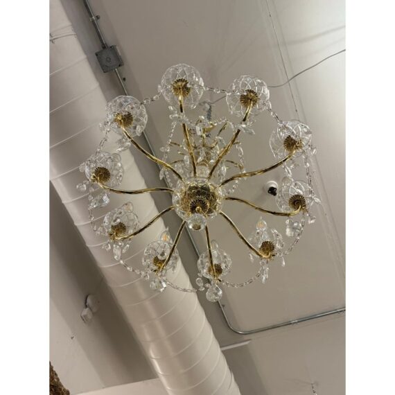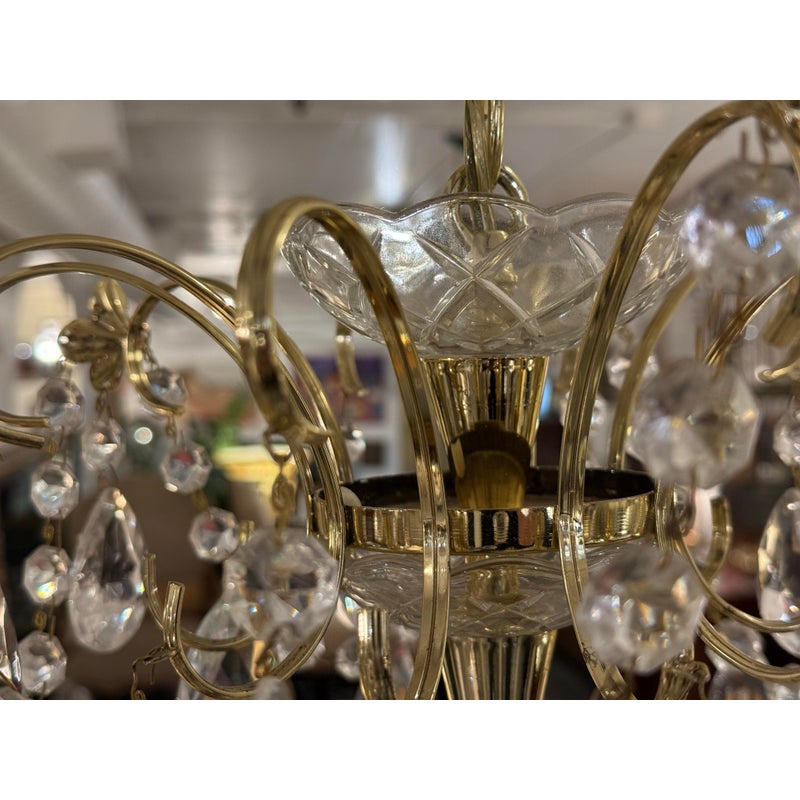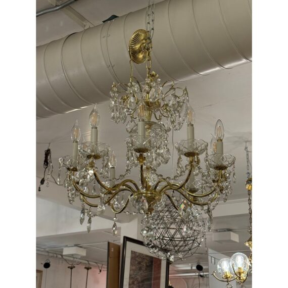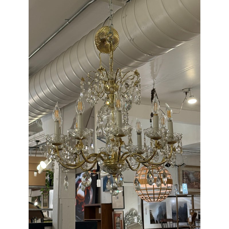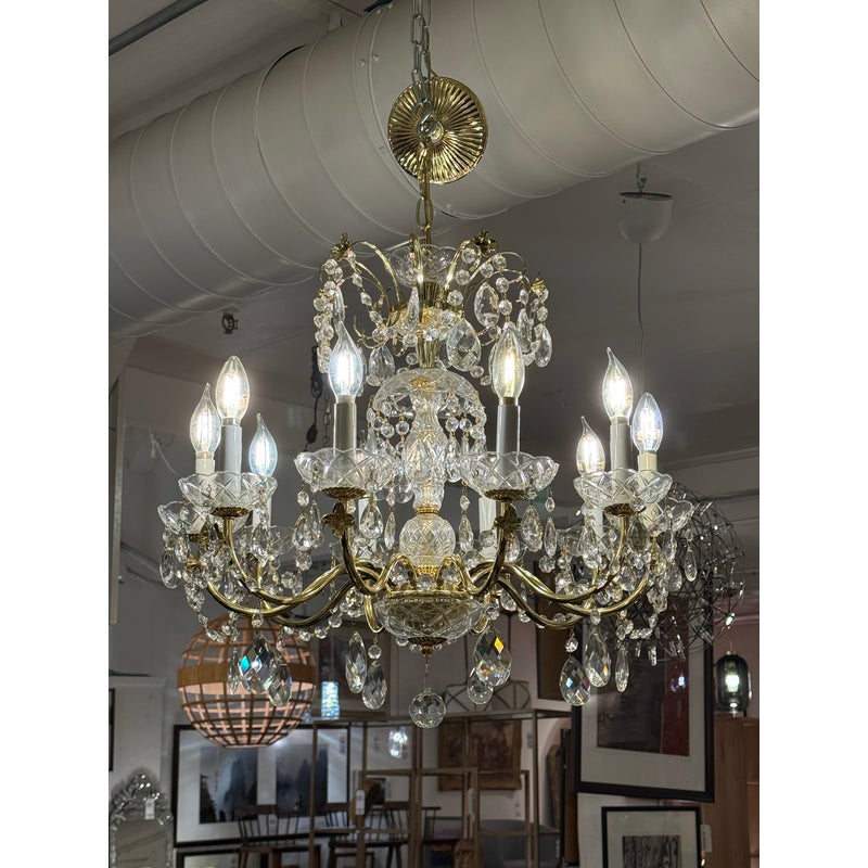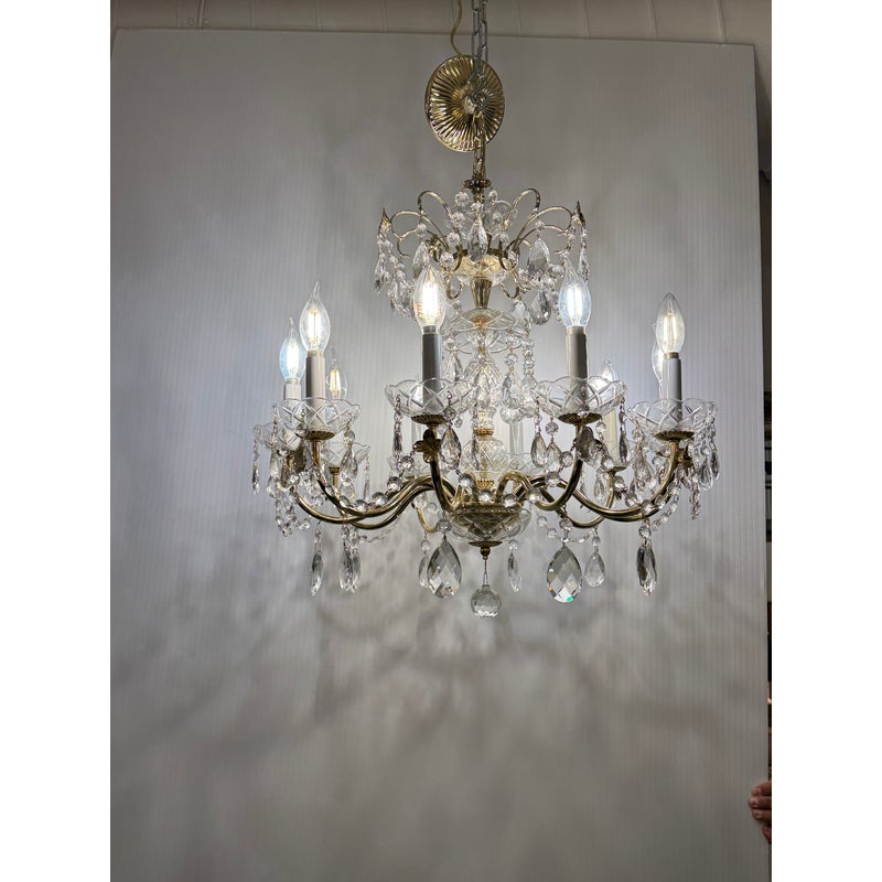 Design Plus Gallery presents a Crystal Chandelier with Vintage Appeal. The chandelier has a polished brass frame that supports ten candelabra-style lights. Draped across each tier are strings of chained crystals that catch and scatter the light in dazzling patterns. Each of the ten arms are lined with raindrop shaped crystals dangling from a chain with a lower finial crystal cut ball. While this chandelier displays classic sophistication and grandeur, a few of its original crystals are missing. Despite these imperfections, the chandelier remains a striking centerpiece, perfect for adding vintage elegance to your space. In good condition, visible and minimal wear from usage.