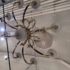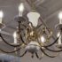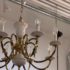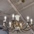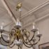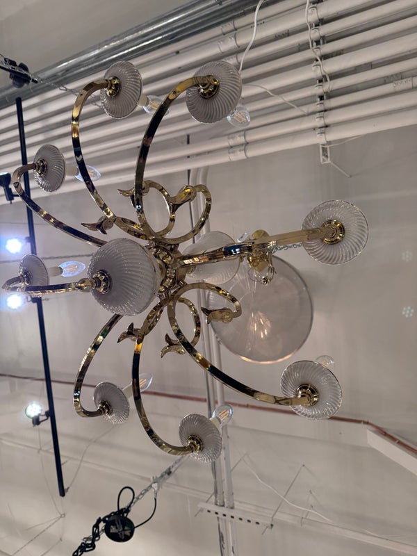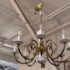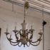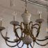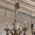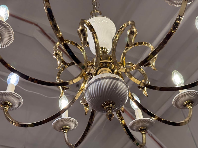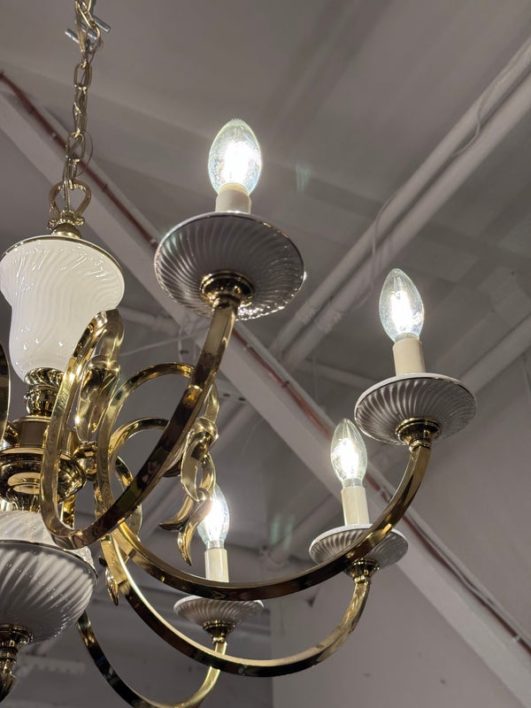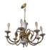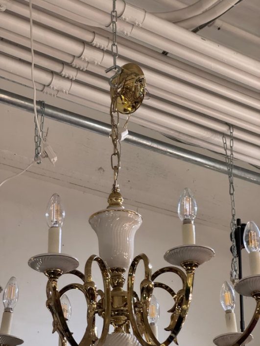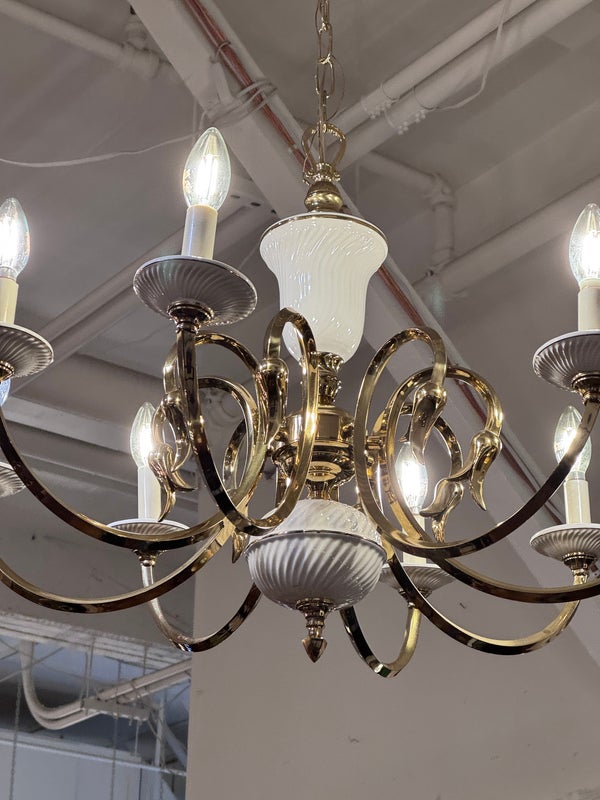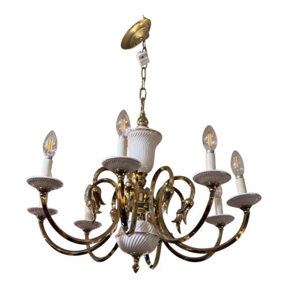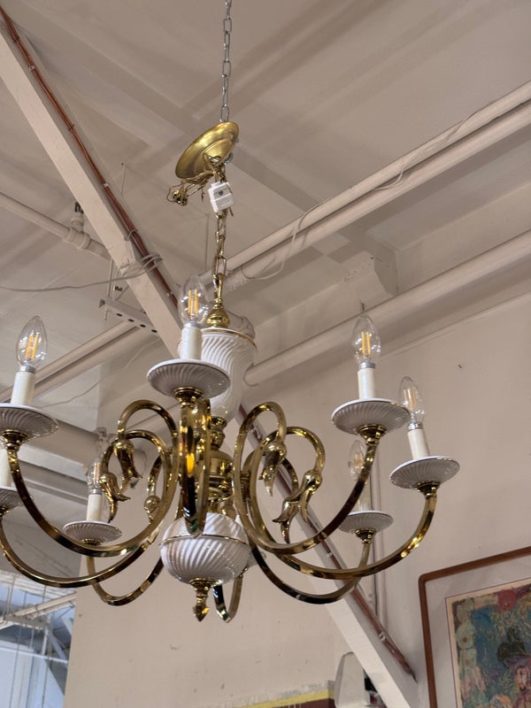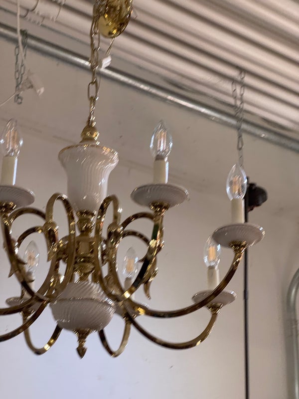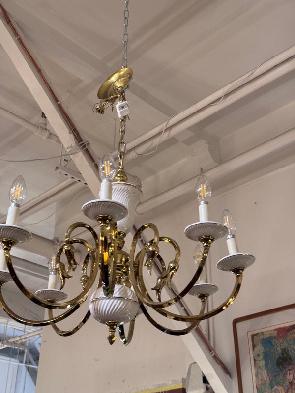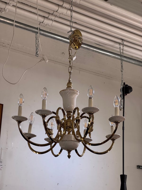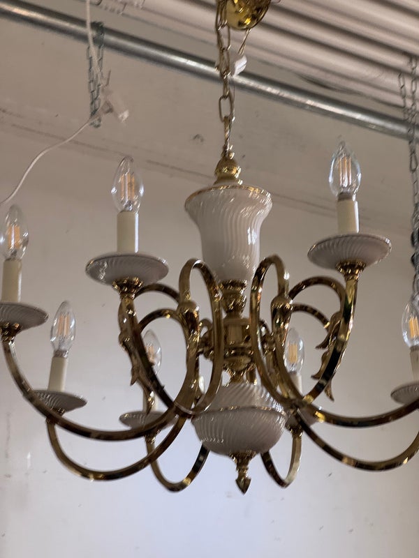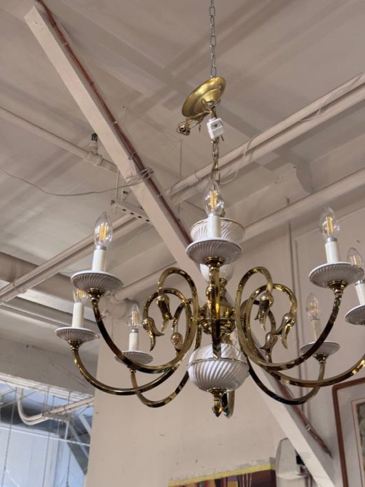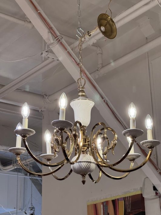 Design pLus Gallery presents a Serpentined + Scrolled Eight Arm Petite Chandelier made from Brass with White Ceramic Body & “Candle” Drip Trays. Nice petite size will fit into a variety of rooms and it offers a nice clean appearance. Is in good condition with minimal surface wear that is consistent with its age + use.