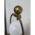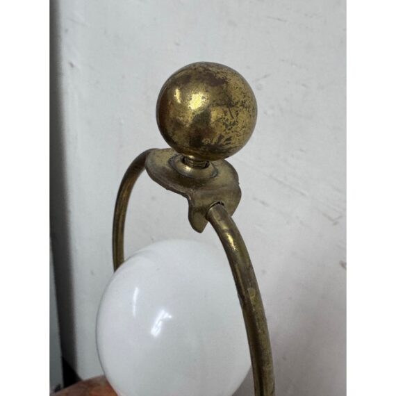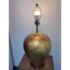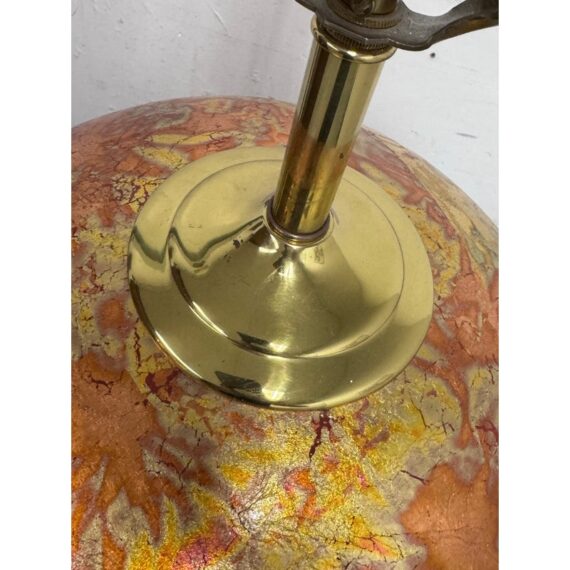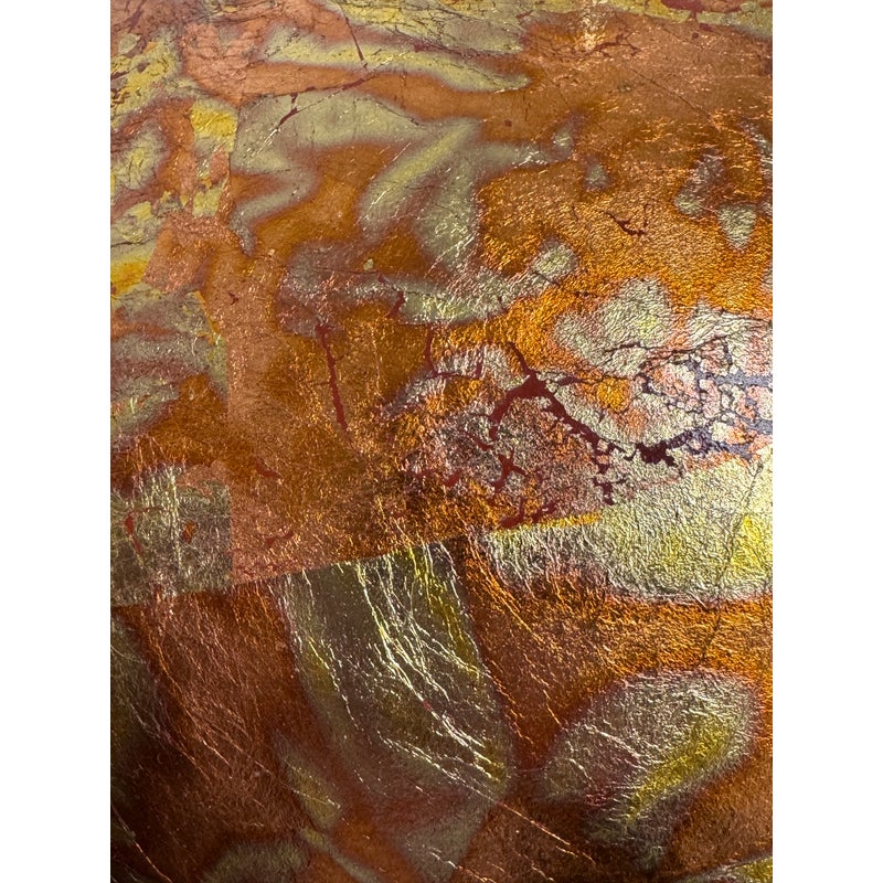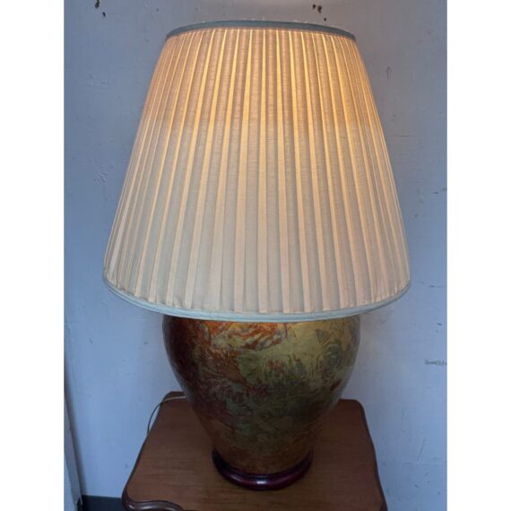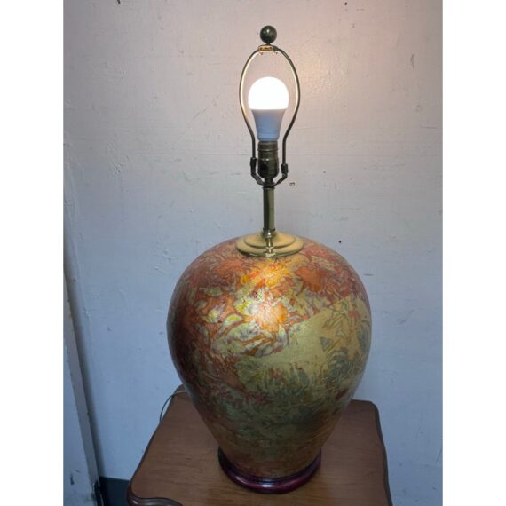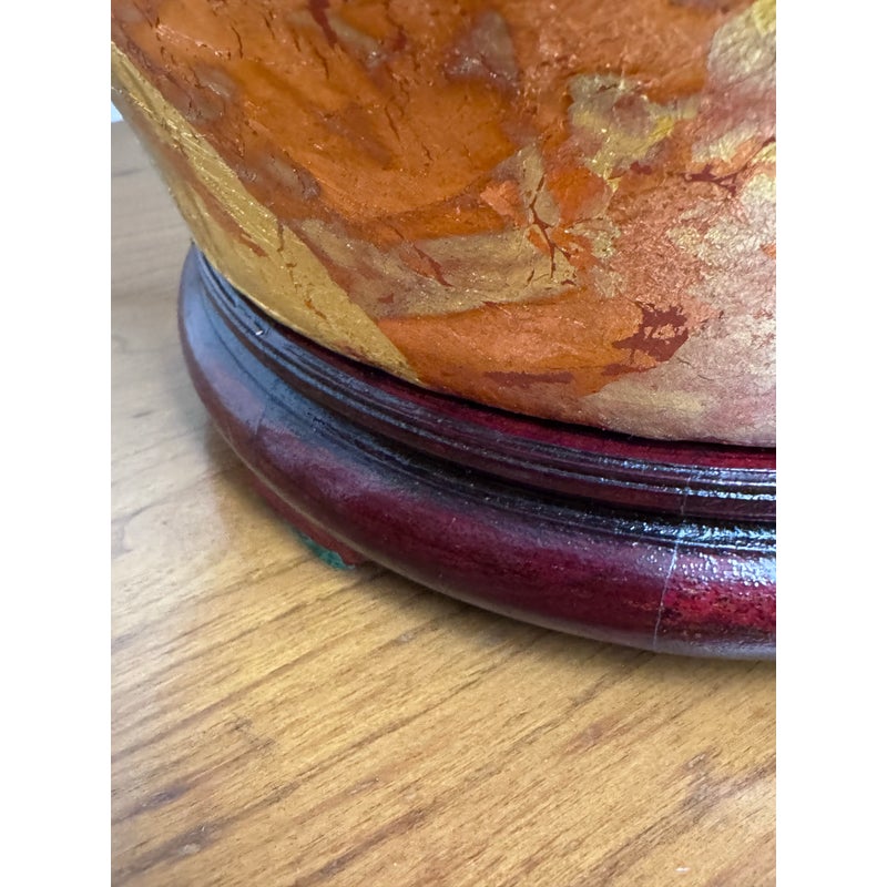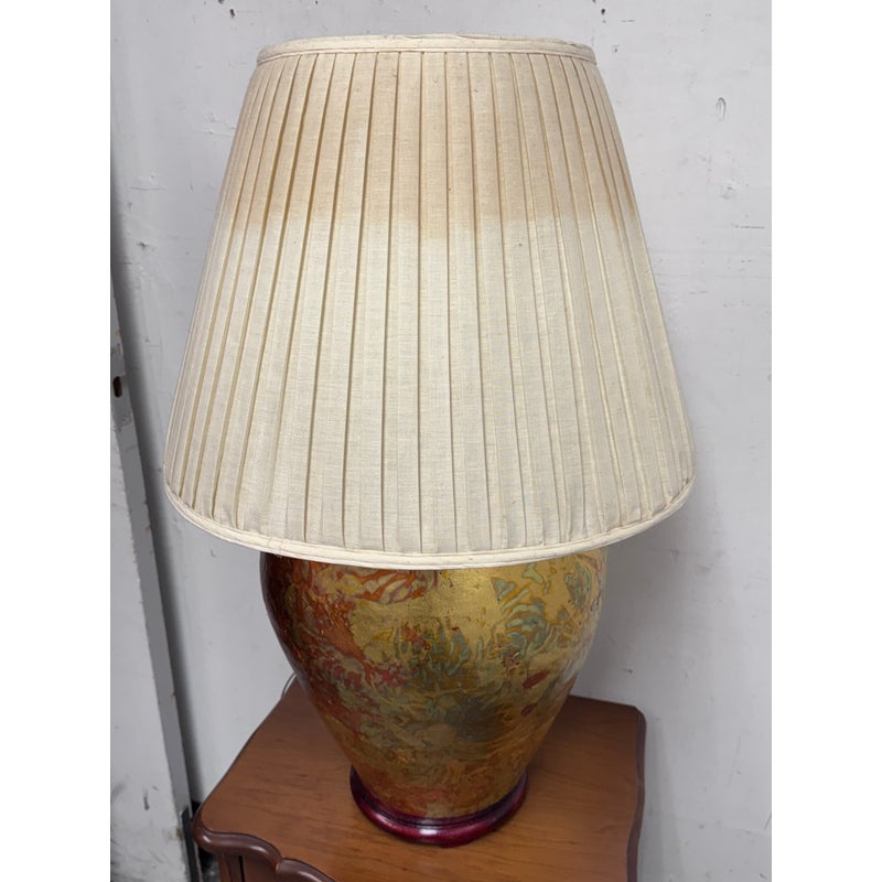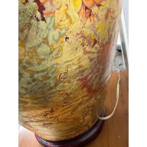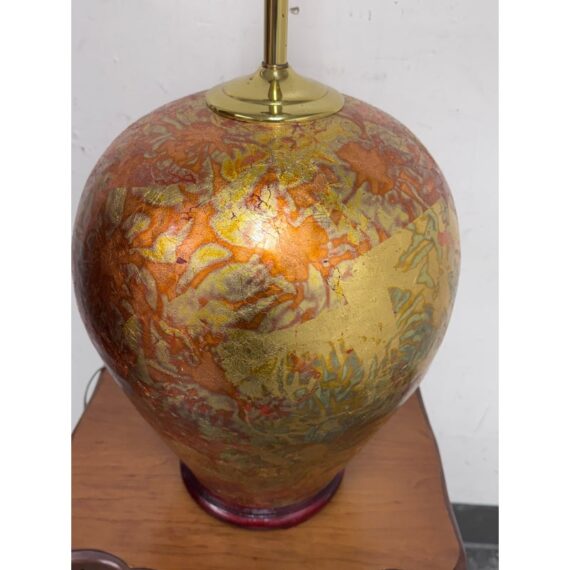 Design Plus Gallery presents a Bronze + Copper Table Lamp from the Late 20th Century. The table lamp has a rosewood or mahogany wood base with a vase shaped bulbous body. The body of this vase looks like it has been dipped in copper and bronze, just dripping in metallics. This use of color will be glowing in the room when its light is turned on. It is in good condition with an off white pleated shade included.