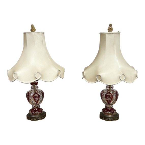 Design Plus Gallery presents a Pair of Traditional Burgundy Cut Glass Table Lamps. Brass base supports the etched glass urn forms with botanical grape motifs. Unique shades are double lined to accentuate the silhouettes. Ornate bronze finials top off the pair. There is minor wear through out, pair is in good condition.