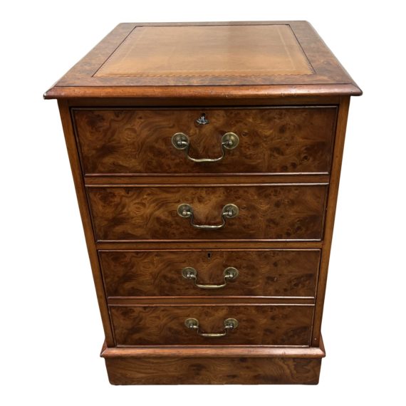 Design Plus Gallery presents a Burlwood Four Drawer Filing Cabinet. They’re a beautiful details throughout this peeve with nice wood grain, gold embossment, leather top with lattice work, brass pulls + working key lock for each drawer. Filing cabinet is in good condition, wear consistent with age + use.