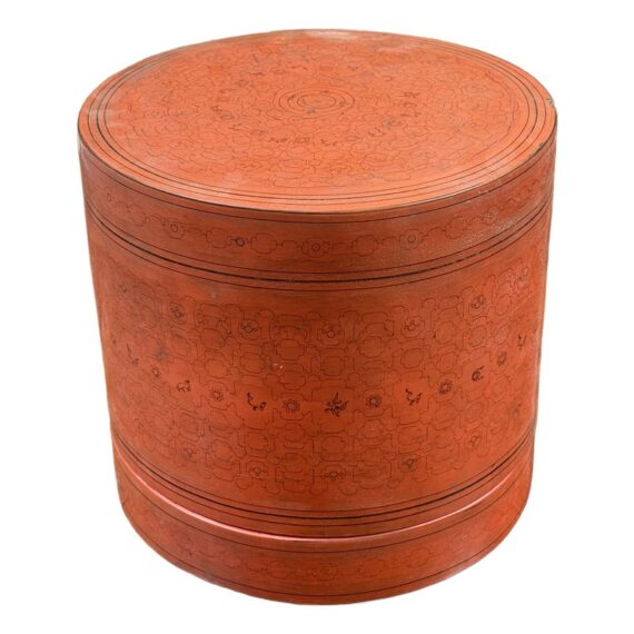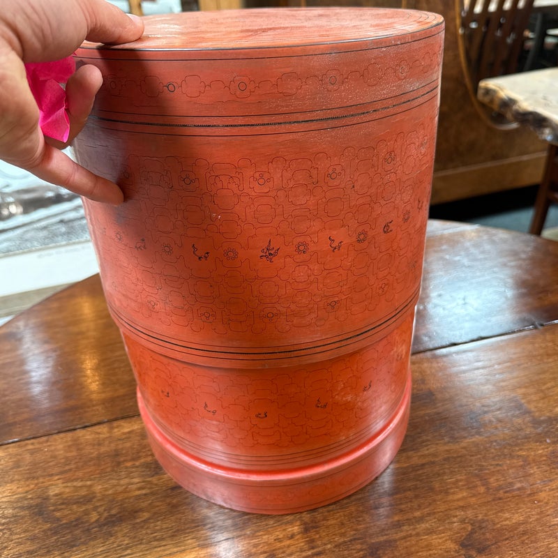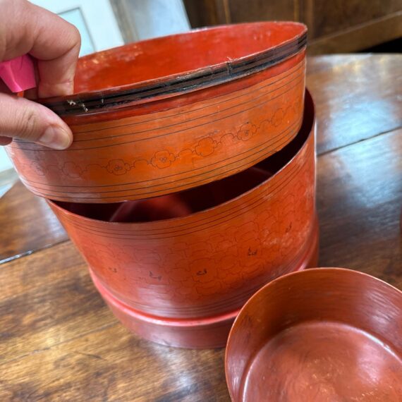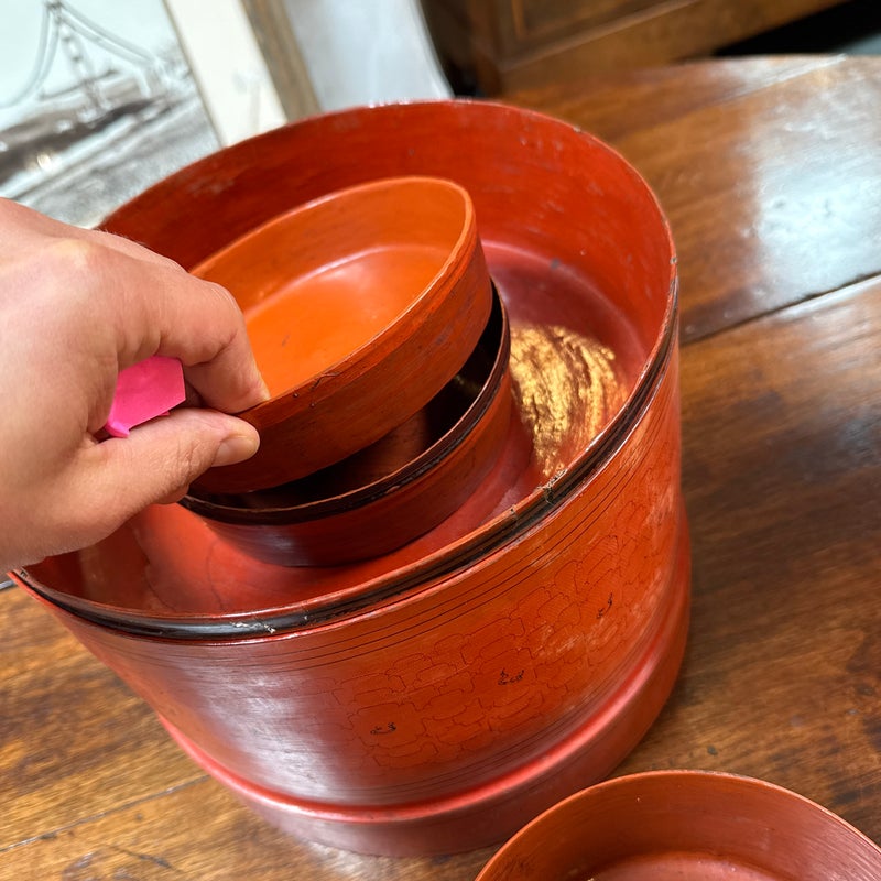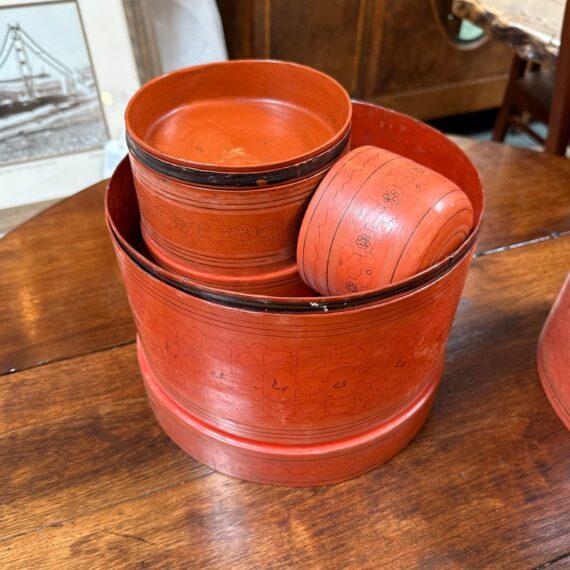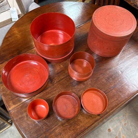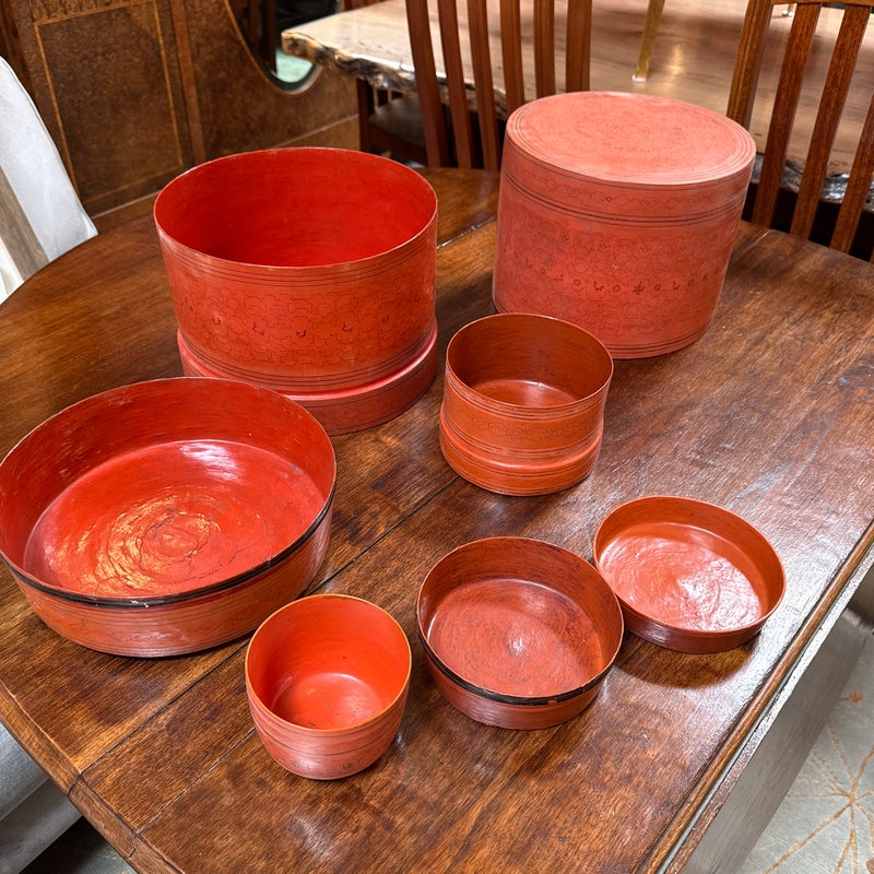 Design Plus Gallery presents a multi-piece set of Vintage Burmese Nesting Betel Boxes. Handcrafted using an art form dating back centuries, the lacquered bamboo set was traditionally used for hospitality and guests. Includes seven containers and on carved lid. Surface wear; patina is consistent with age and use.