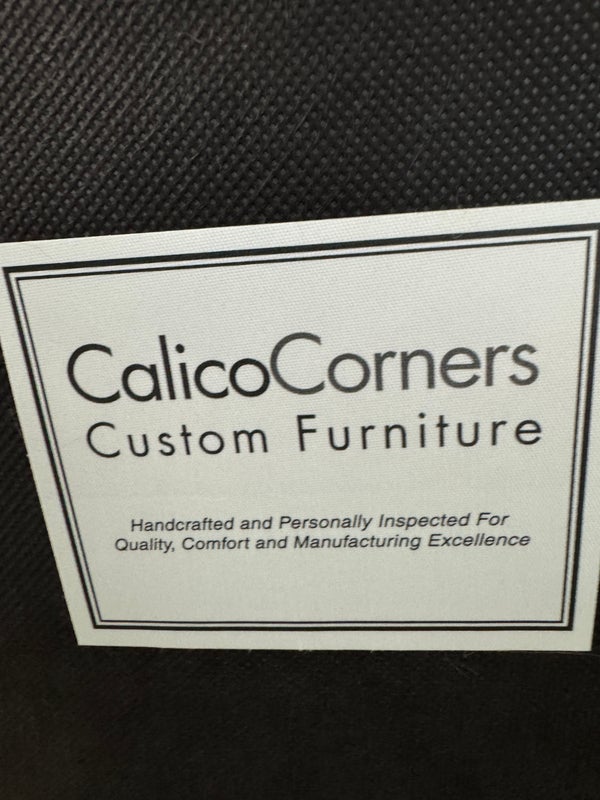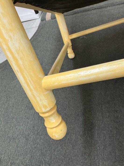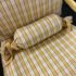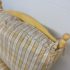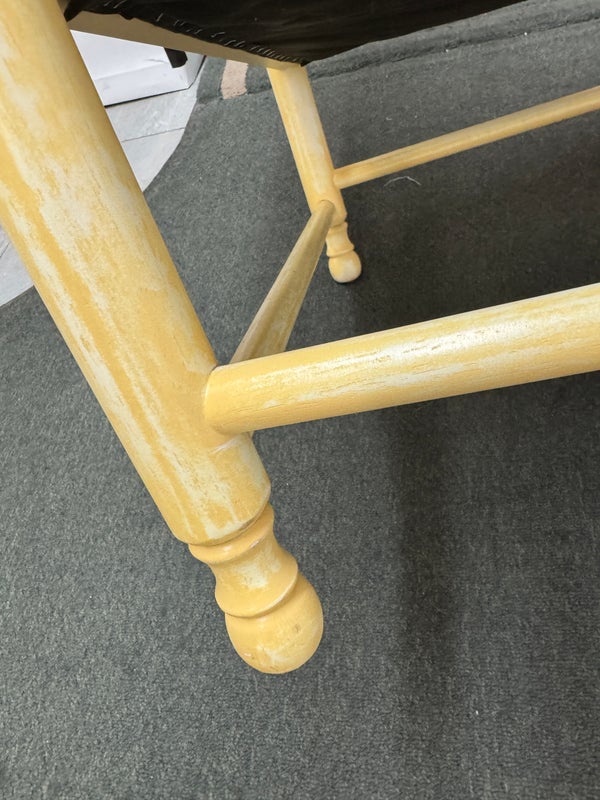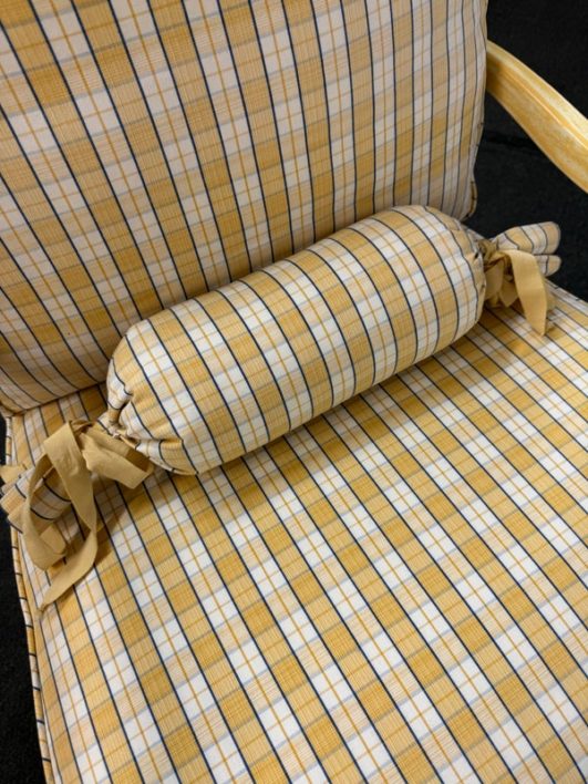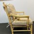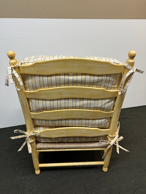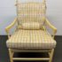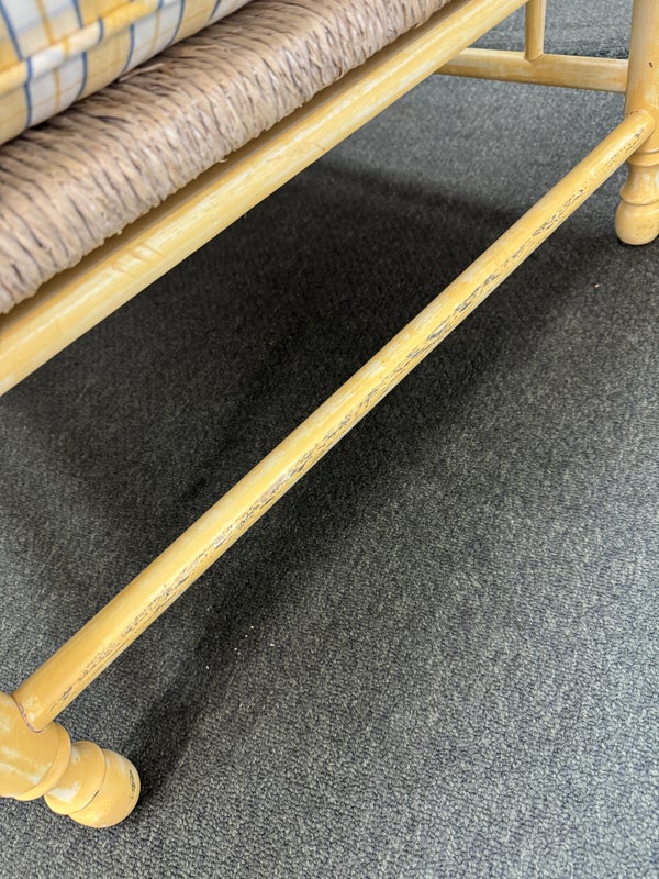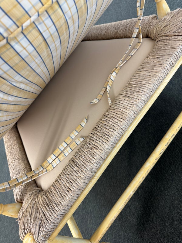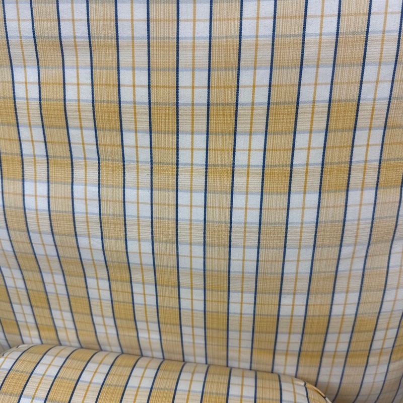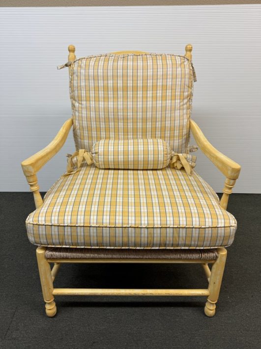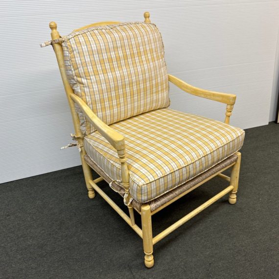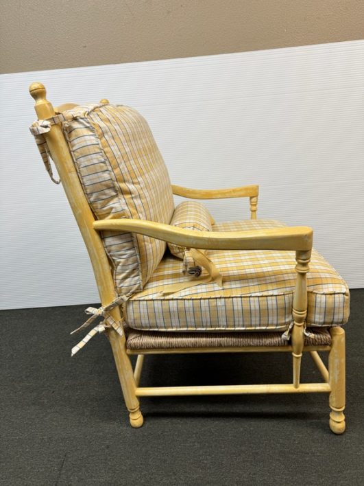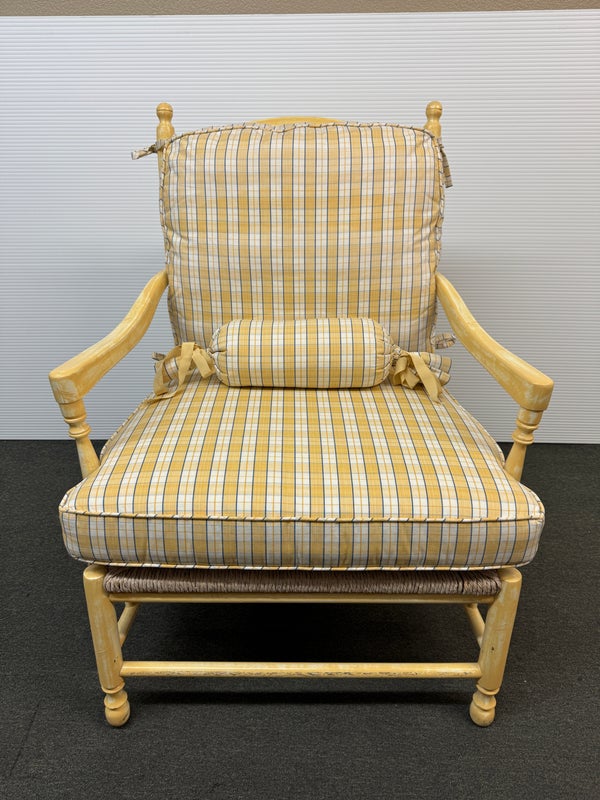 Design Plus Gallery presents a Vintage Arm Chair from Calico Corners. Shabby meets country chic with this throwback chair and design. The wood frame offers a maple like finish with two cushions to comfort yourself tied to the frame with tie-backs all in a soft buttery yellow plaid. Nice and neutral the chair is in good condition with minimal wear. Made in USA.