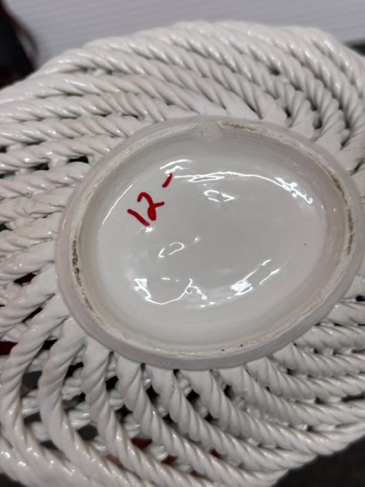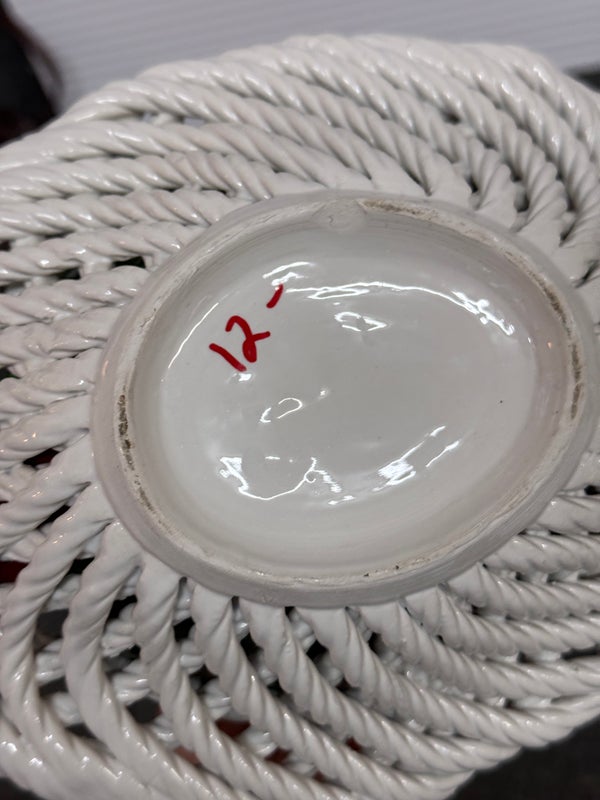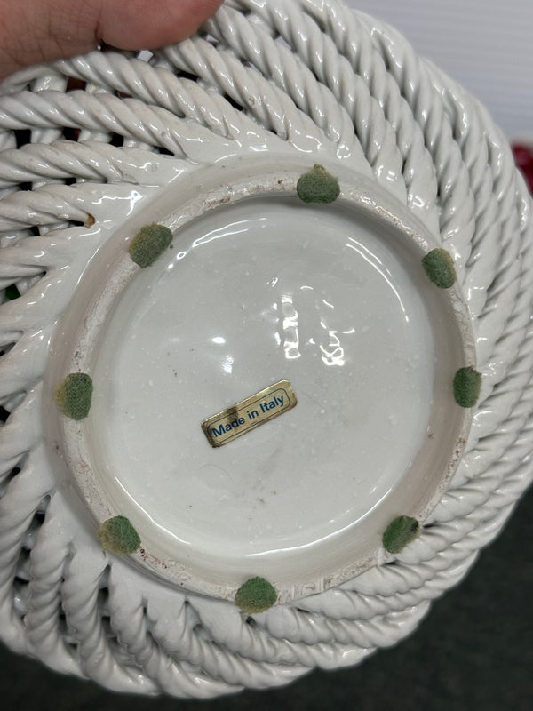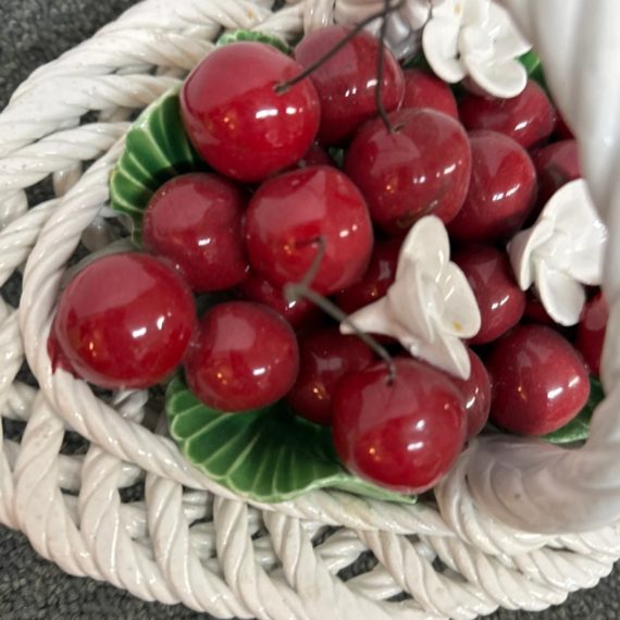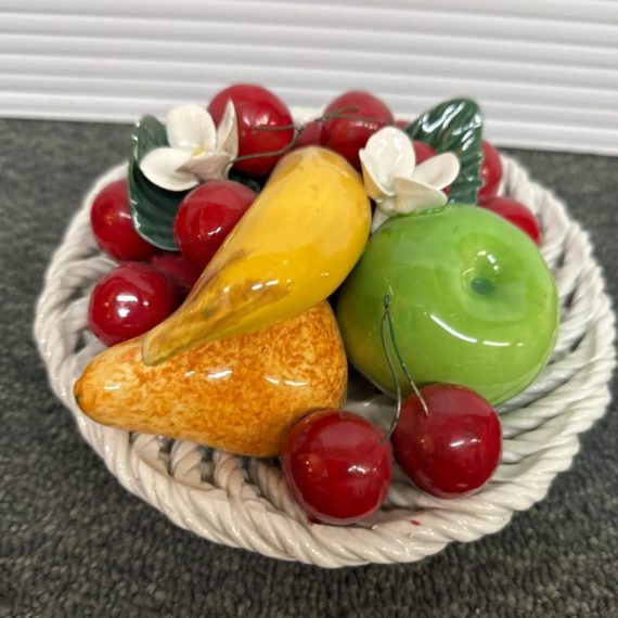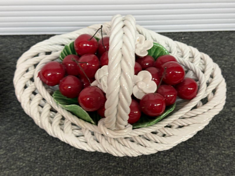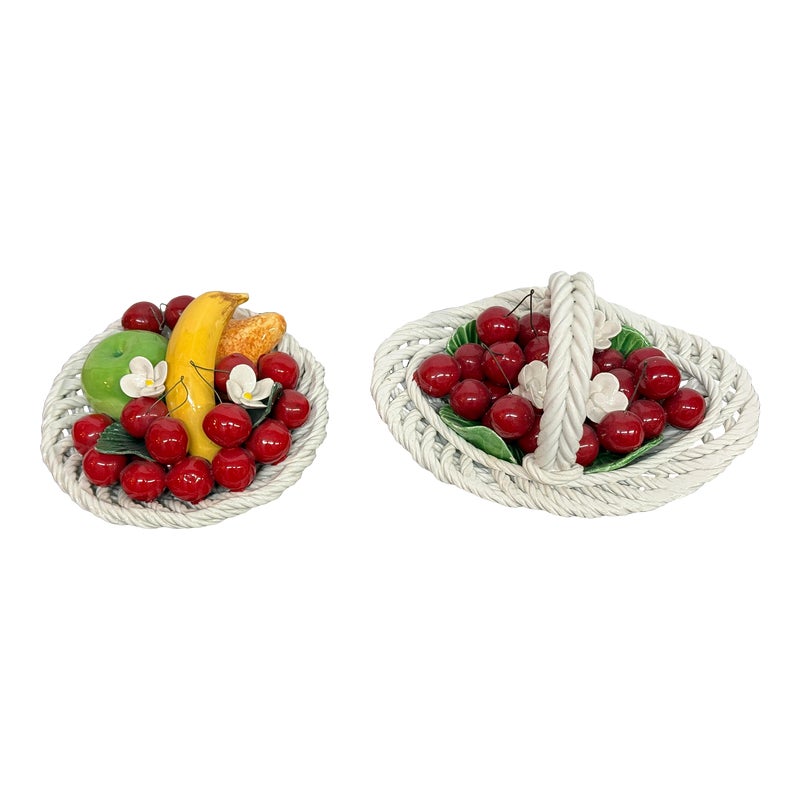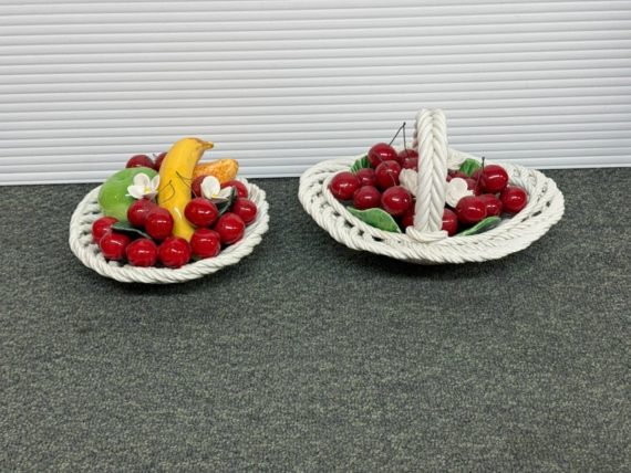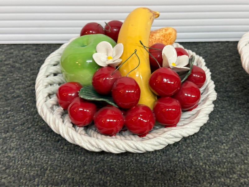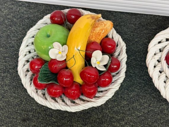 Design Plus Gallery presents a Pair of Vintage Capodimonte Fruit Baskets. Intricate white porcelain baskets are filled to the brim with gorgeous, lush porcelain fruit and flowers. Small Round Basket measures 7.5×4 inches. Brings a bright spot to any shelf or table. Little visible wear; condition is good. Made in Italy.