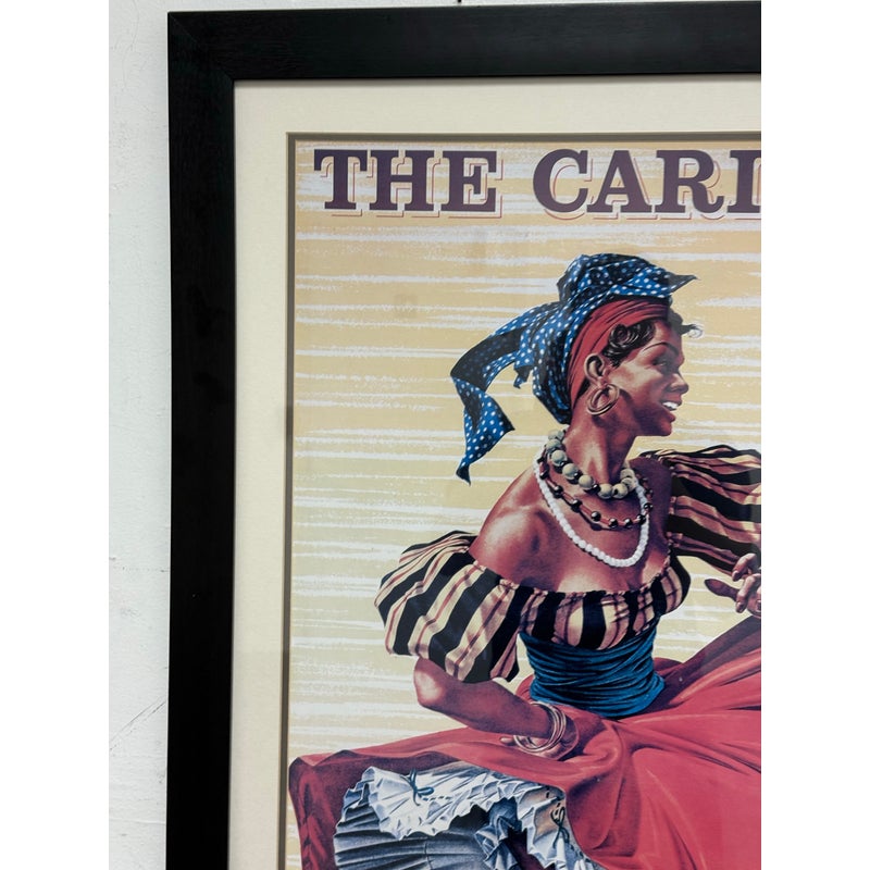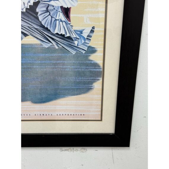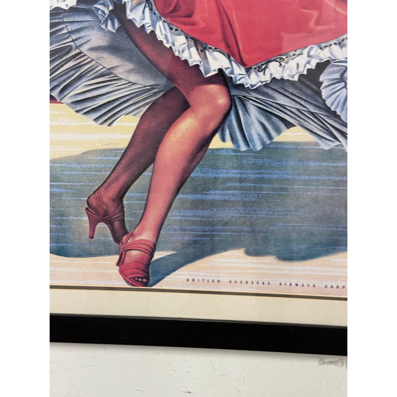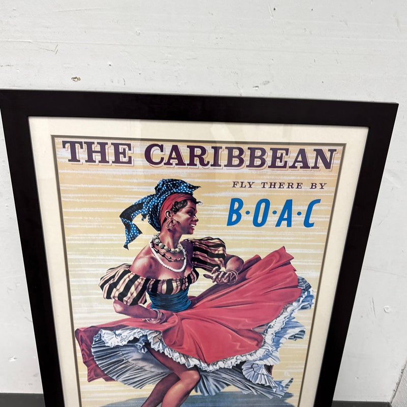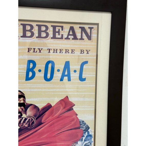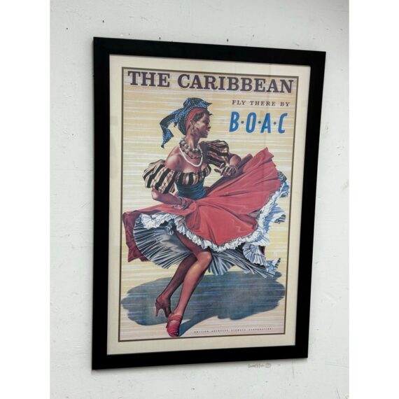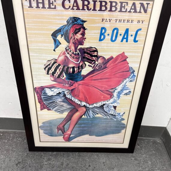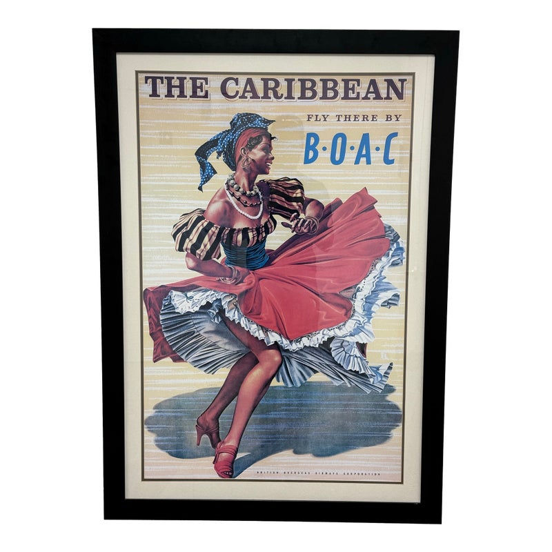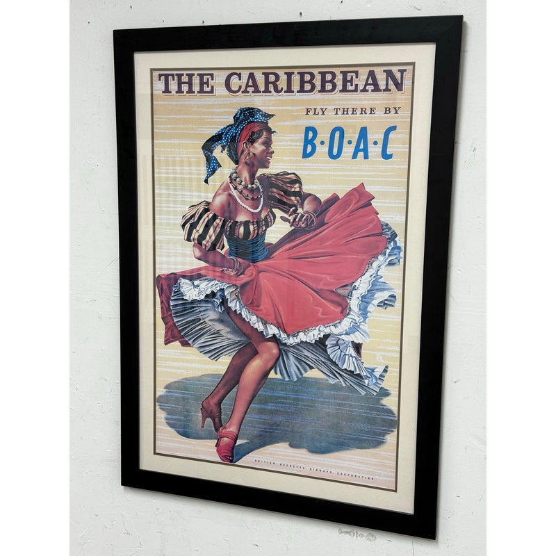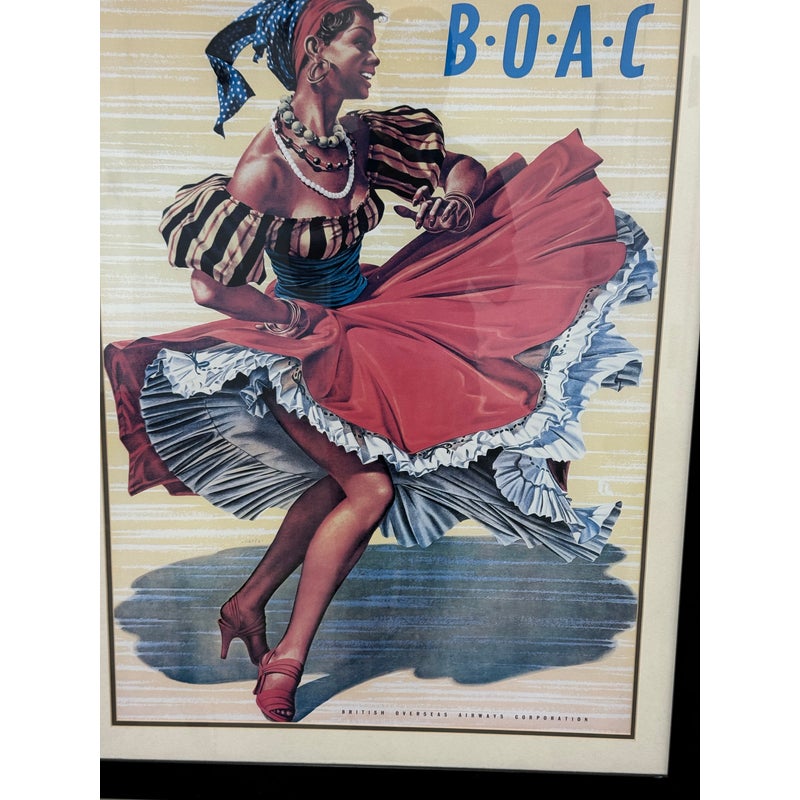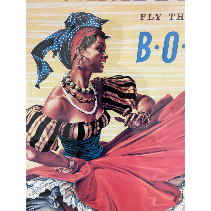 Design Plus Gallery presents the Caribbean Fly There with BOAC Poster Print. The image has a smiling Caribbean lady dancing in a traditional dress + wearing a headscarf, necklaces, bracelets, and hoop earrings, her skirt sweeping around against the yellow + white background with a stylized title text above. The image is from the Mid 20th Century, as the British Overseas Airways Corporation (BOAC) was around in the 1940s-1960’s. The poster print is in good condition with minimal surface wear.