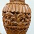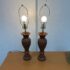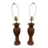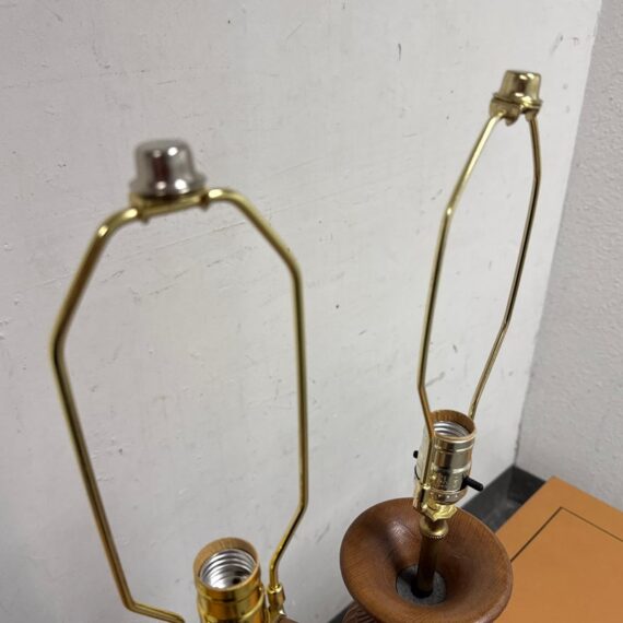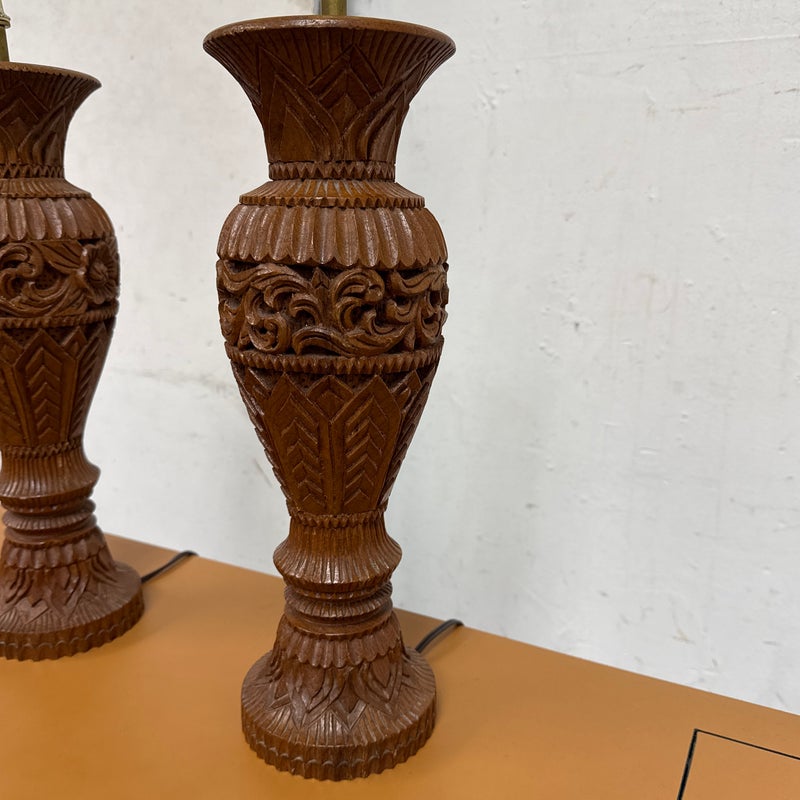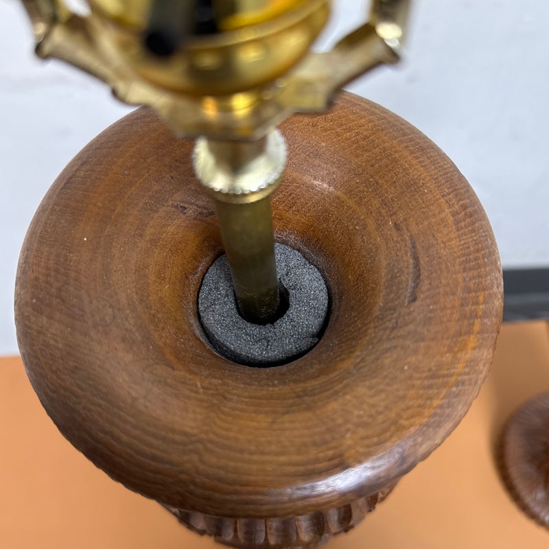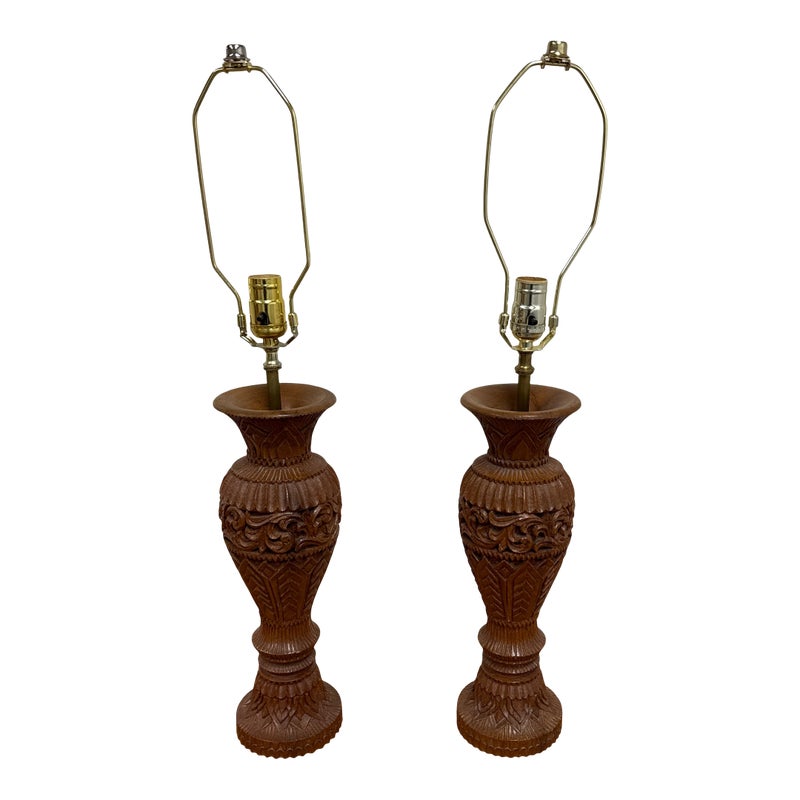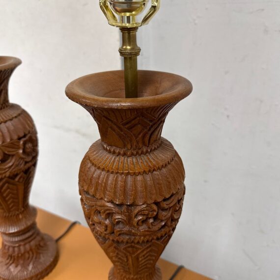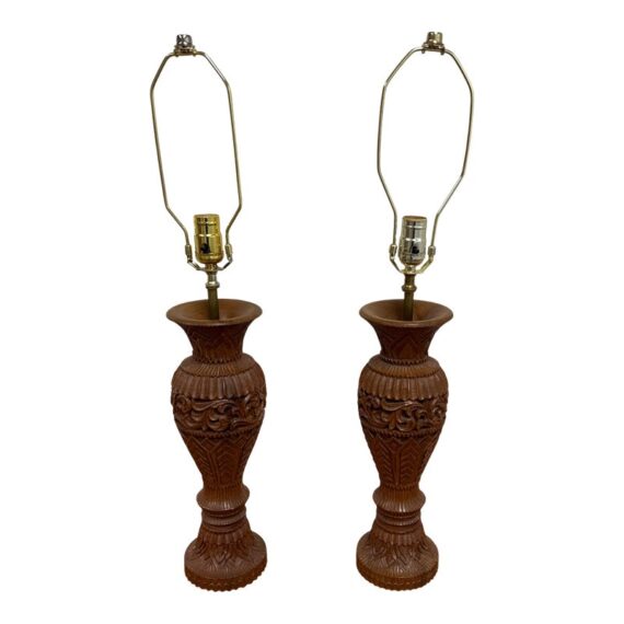 Design Plus Gallery presents Pair of Vintage Carved Wood Table Lamps. The lamps have sculpted bases that showcase the honored craftsmanship. Each lamp is has a detailed acanthus-leaf motif that is carved into the caramel toned wood. They are topped with brass hardware allowing them to lamps seamlessly blend traditional design with vintage charm. They are in good condition, visible and minimal wear from usage.